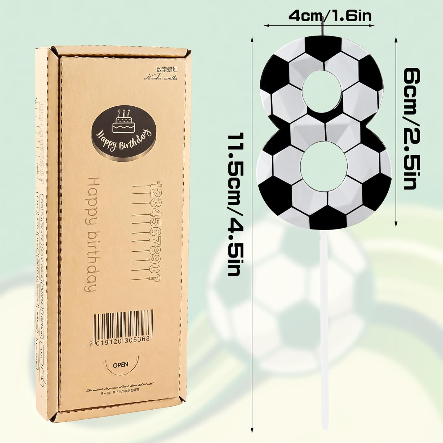 Informazioni sulle candele: riceverai 1 candela di compleanno numero 8, la dimensione della candela a tema calcio è di circa 6 cm di lunghezza, la lunghezza totale (incluso il plettro per candele) è di circa 12 cm. Questa candela di dimensioni perfette si adatta a torte di compleanno e cupcake di qualsiasi dimensione, aggiungendo un certo fascino alla tua torta. Materiale e confezione sicuri: le nostre candele di compleanno a tema calcio sono realizzate con materiali ecologici, sicure e inodori, le candele bruciano a lungo, abbastanza a lungo per cantare la canzone di buon compleanno e esprimere il tuo desiderio fino a quando non sei pronto a spegnerla. Le candele per torta di compleanno sono confezionate in cartone kraft, che è più protettivo rispetto al pacchetto di blister sul mercato e può efficacemente impedire che la candela venga schiacciata. Artigianato unico: la candela 3D Diamond Vision ha una superficie a forma di diamante con un potente effetto tridimensionale 3D, proprio come la superficie tagliata di un diamante. Splendide candele rendono la tua festa unica e impressionante. Candela luminosa di lunga durata: queste candele di compleanno a tema calcio accuratamente progettate forniscono una luce di lunga durata per rendere l'evento più affascinante; la luce di queste candele riempie la stanza di una luce morbida e calda, migliorando l'atmosfera generale e rendendo la tua celebrazione un'occasione indimenticabile Essenziale per feste multiuso: questo topper per cupcake può essere facilmente applicato a tutti i tipi di celebrazioni e si abbina facilmente a tutti i tipi di decorazioni per feste a tema. Non è solo per i compleanni dei bambini, ma anche per i compleanni degli adulti. Decorazione ideale per torte per molte occasioni, come compleanni di ragazzi e ragazze, baby shower, anniversari, feste di pensionamento, riunioni di famiglia, matrimoni, feste di calcio, anche Natale, decorazioni perfette per torte da festa.