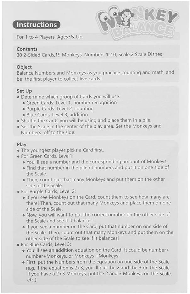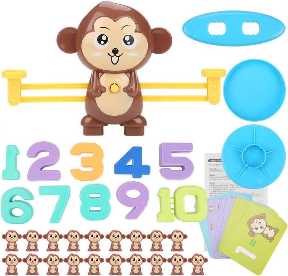 Realizzato in materiale plastico ecologico, sicuro per i bambini. Tutte le parti vengono elaborate da bordi lisci e leggermente arrotondati sicuri per i bambini. Il colore brillante e la scimmia carina non solo possono attirare l'attenzione dei bambini, ma soddisfare anche la loro curiosità per l'ambiente circostante. Grande giocattolo che stimola il cervello, goditi il divertimento e la felicità del gioco di abbinamento e bilanciamento del numero, sviluppando capacità pratiche, capacità di coordinamento del cervello manuale. Costruisci le capacità di riconoscimento di forma, colore e numeri, può ispirare l'immaginazione dei bambini e promuovere il loro sviluppo fisico e intellettuale.
