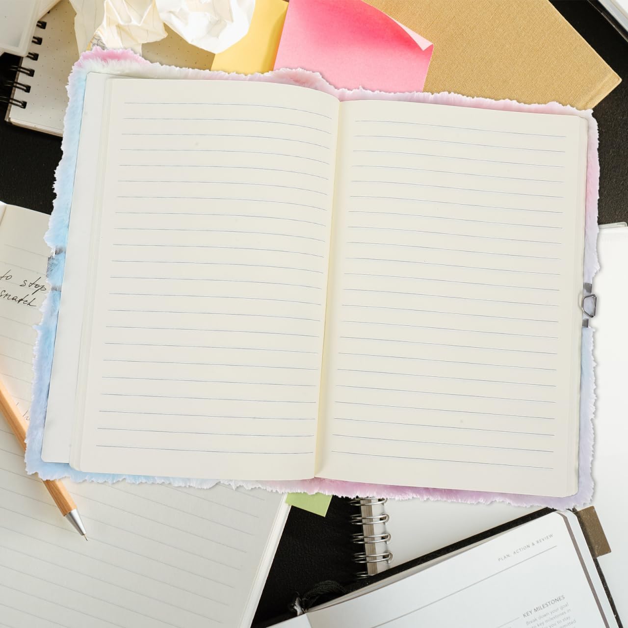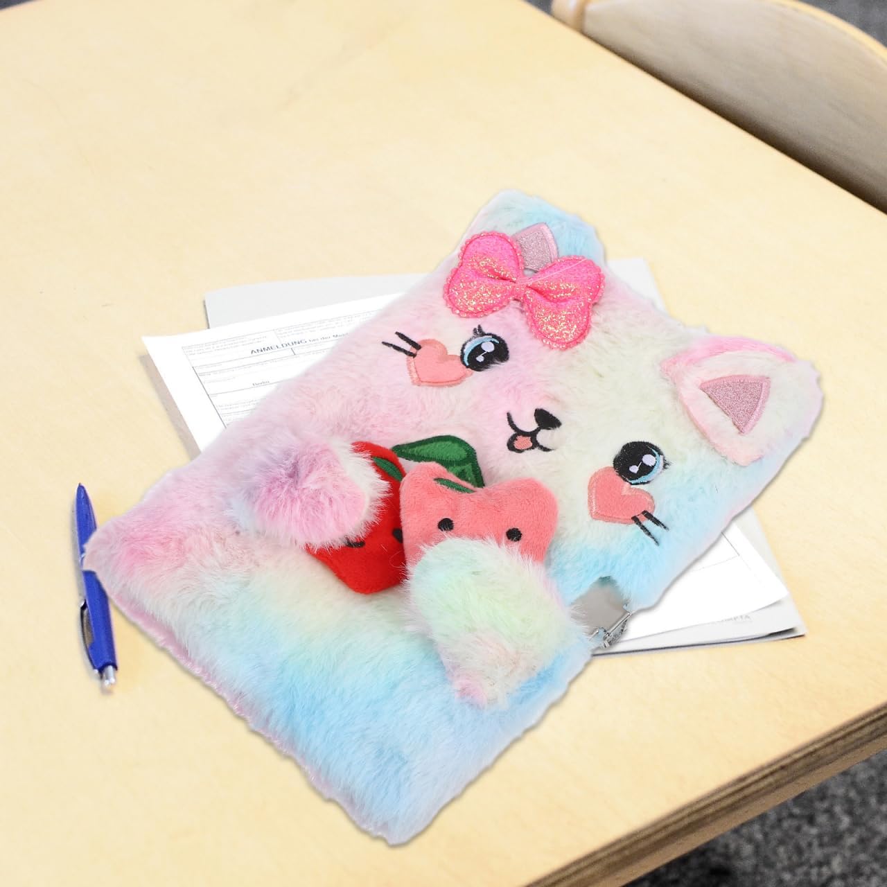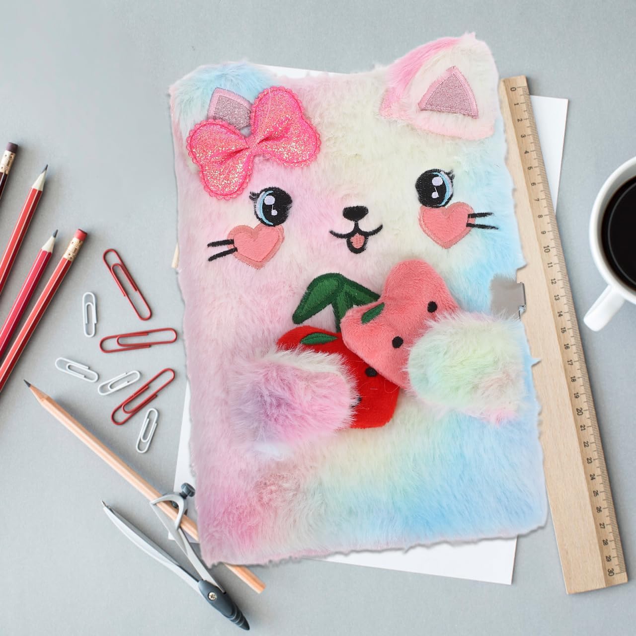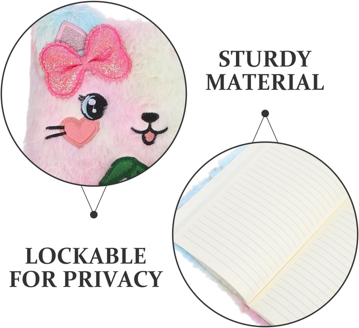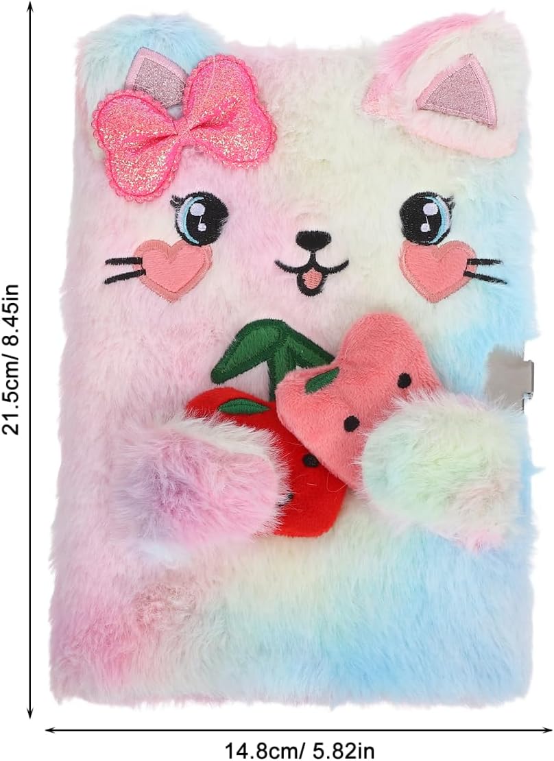 Simpatico gatto con fiocco: l'affascinante design a forma di gatto aggiunge un tocco stravagante al tuo diario, rendendolo più piacevole Formato A5 compatto: facilmente portatile, questo taccuino A5 si adatta alla borsa, permettendoti di scrivere pensieri in viaggio Copertina in peluche per il comfort: la copertina in peluche offre una sensazione morbida e accogliente, rendendo la scrittura un'attività piacevole Lucchetto per la privacy: il design con serratura garantisce che i tuoi pensieri personali rimangano privati e al sicuro Adatto per un regalo: questo taccuino è ideale per chi ama i gatti e i disegni carini