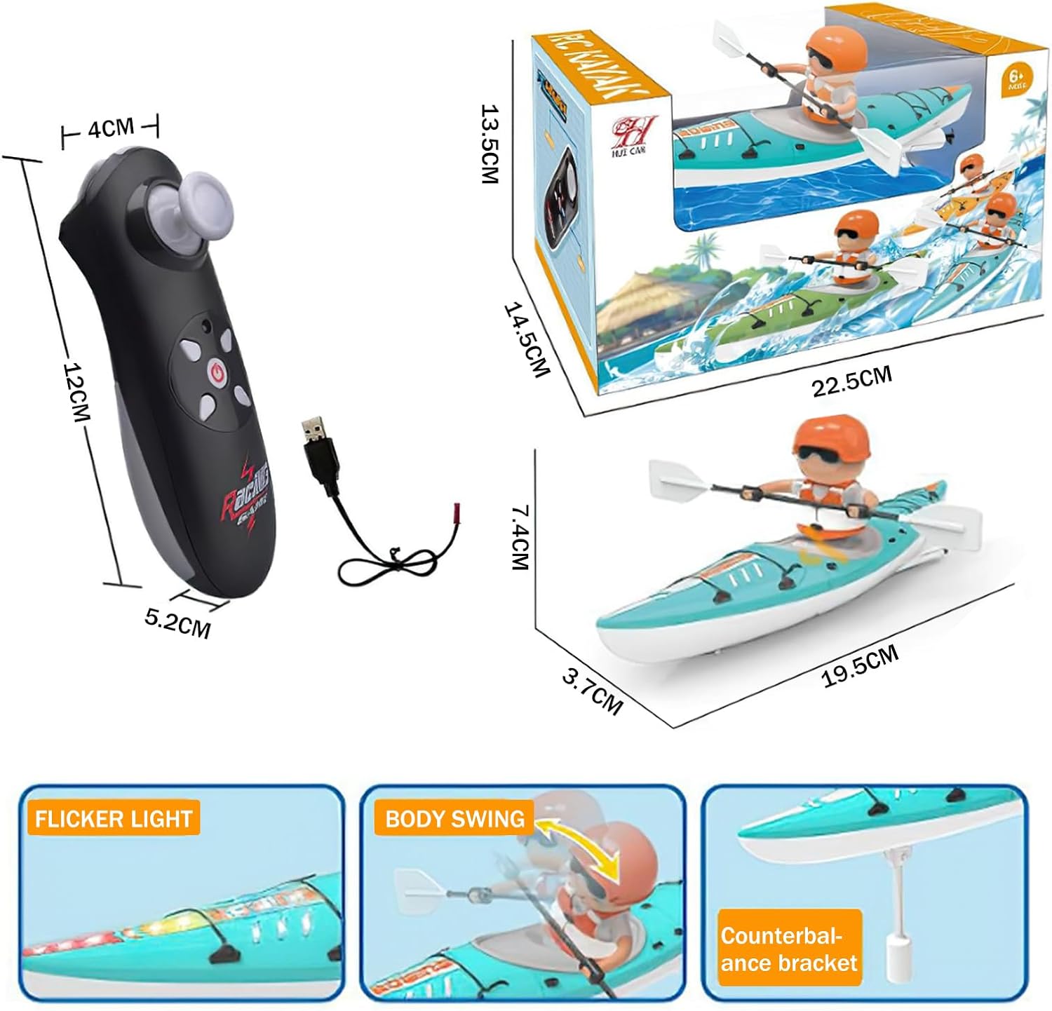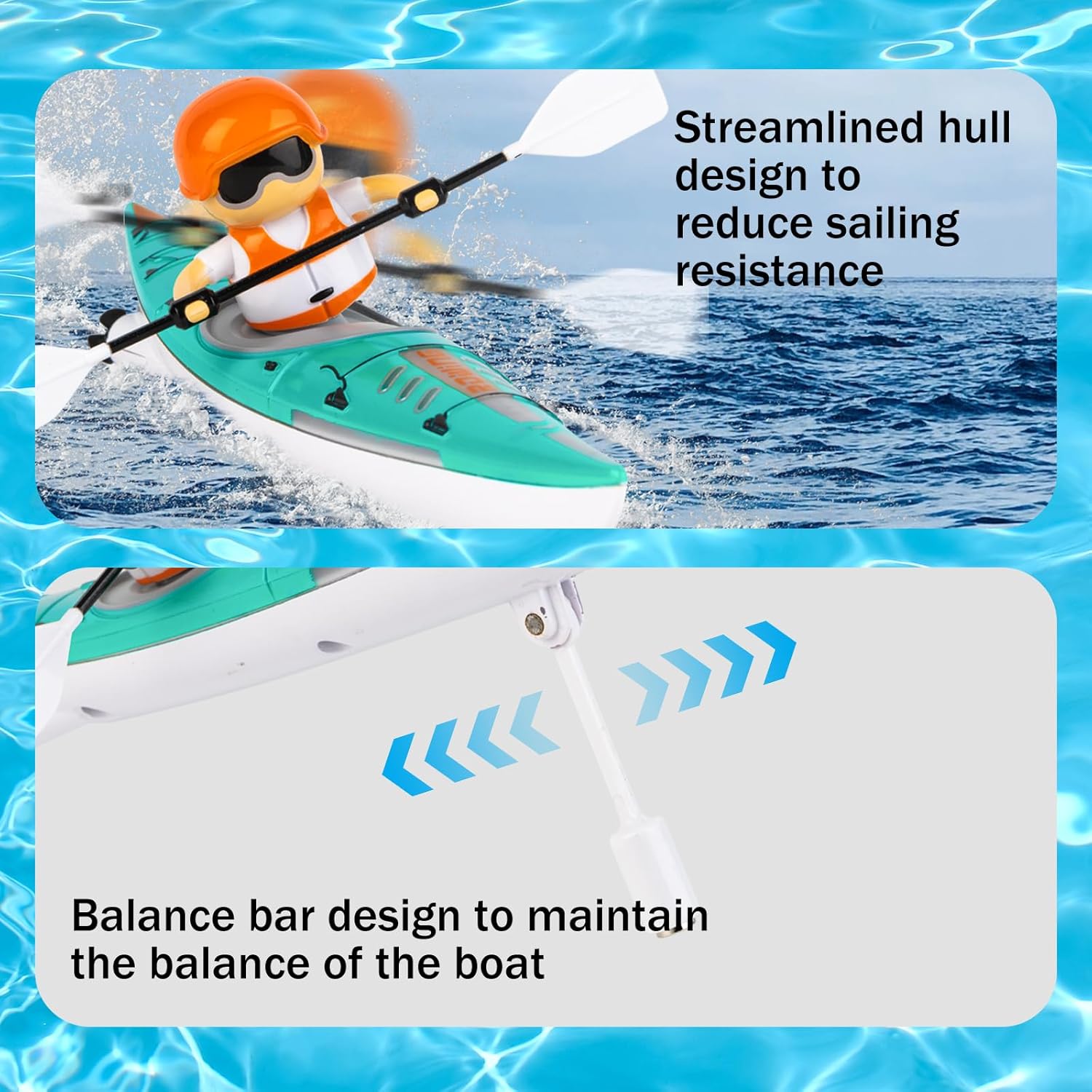 【Aspetto innovativo】RC kayak adotta la struttura di canottaggio antropomorfa, l'azione è realistica e affascinante, casco aerodinamico appuntito con struttura di bilanciamento subacqueo unica, per mantenere la barca non si ribalta. 【2 modi per giocare】RC barca toccare l'acqua per iniziare, il supporto a doppia modalità di guida, si può sperimentare il divertimento di pagaia, ma si può anche sperimentare la velocità della barca RC, dai bambini e gli adulti lo adorano! 【Forte potenza】La barca a controllo remoto veloce adotta il design a polpa a doppia vite, dotato di motori ad alta efficienza, utilizzando il dispositivo di conversione di energia ad alta efficienza, più risparmio energetico rispetto ai motori ordinari, viaggiare più veloce! 【Luci colorate abbaglianti】 Le barche RC hanno luci LED luminose incorporate, che facilita l'identificazione della posizione della barca in qualsiasi momento, e può essere chiaramente visto nell'ambiente buio di notte. 【Water Athletics】2.4GHZ Barca telecomandata utilizzando segnali di controllo remoto ad alta frequenza, supporta più dispositivi per giocare allo stesso tempo senza interferire l'uno con l'altro, si può godere di giocattoli d'acqua competizioni atletiche, ma anche per i ragazzi e le ragazze come un compleanno, Natale, Capodanno opzione ideale!