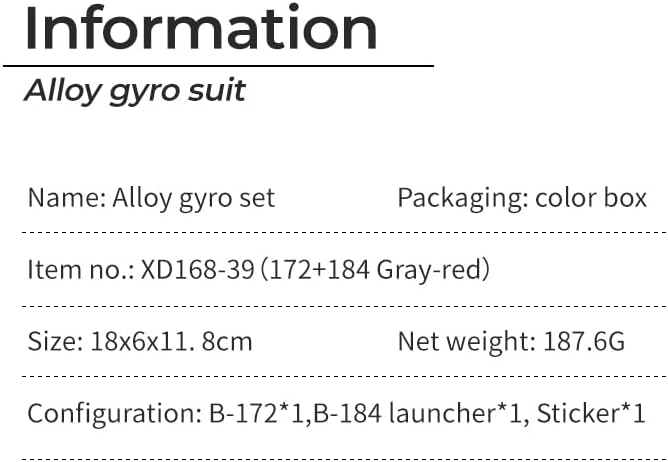 【Incluso】 Il set include 1 pz brust spinning top B-172 e un set di lanciatori, che si adattano perfettamente ai modelli di combattimento, specialmente nelle partite finali. Puoi scoprire il divertimento della battaglia nel gioco. 【Burst Tops】 La parte superiore della tuta Burst può essere "esplos in pezzi durante la battaglia (i tassi di esplosione variano). Esplode in una plastica di alta qualità che ha più impatto e potenza distruttiva, quindi i giroscopi sconfiggono l'avversario. 【Materiale】 Il materiale delle trottole da combattimento è in plastica e lega di alluminio. Il cerchio di attacco è realizzato in fusione di metallo di alta qualità, robusto e non si rompe facilmente. Resistente a cadute e urti, asta in lega, resistente all'usura e durevole, design ad anello in metallo superiore, riduce l'attrito e riduce il rumore. 【Progetta le tue trottole da combattimento】 Le nostre trottole da possono essere assemblate secondo le tue idee. Diverse scene possono essere assemblate su giroscopio con diversi poteri di combattimento. Colleziona la tua battaglia di top spin unica ora! 【Regalo perfetto】 È un ottimo gioco al coperto. I bambini possono giocare a questo trottola con i loro genitori o amici. Goditi la felicità che ti porta. Ideale per collezioni o come regalo, Pasqua, Halloween, Natale, compleanni e Capodanno.