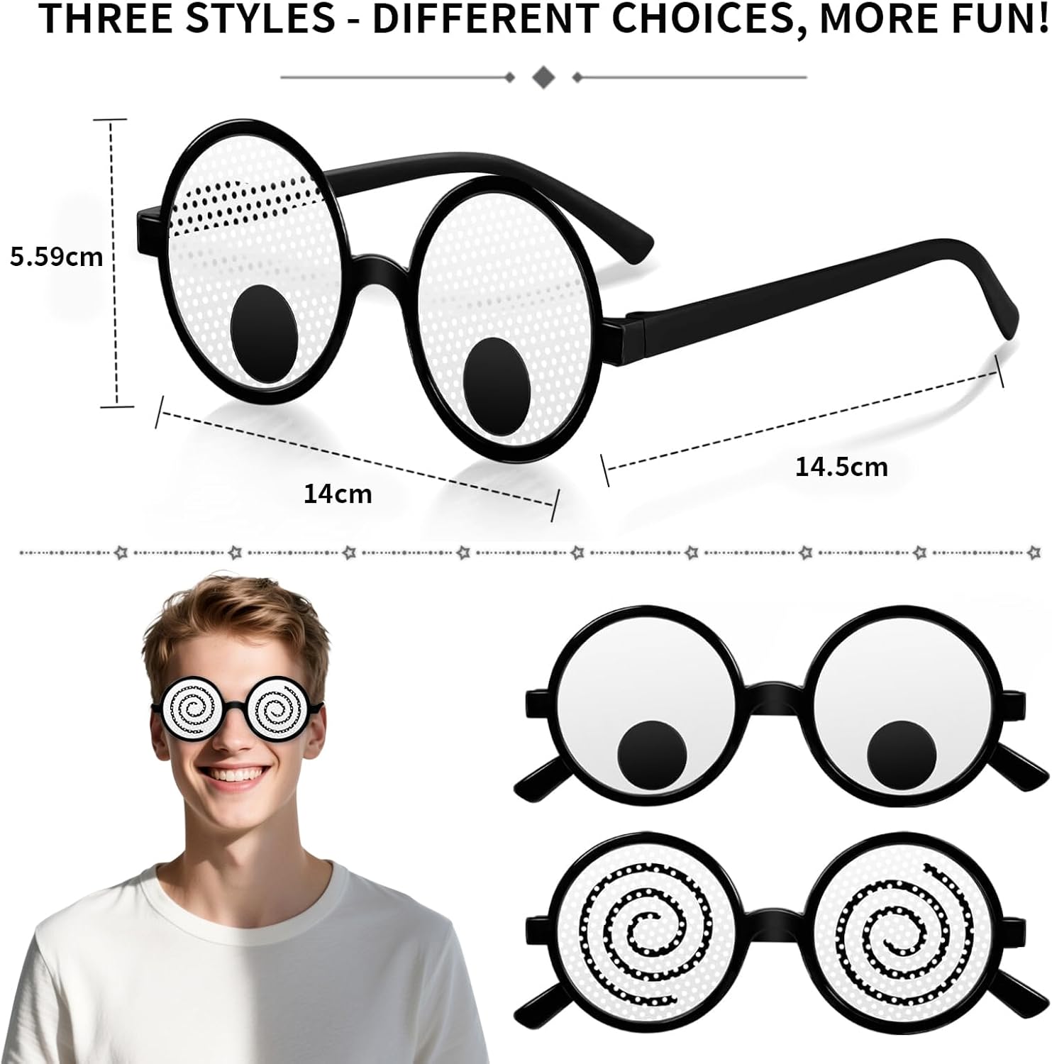 Descrizione prodotto 1. Divertente successo per le feste: con gli occhiali divertenti FrostyFlair portate immediatamente un'atmosfera a ogni festa. I tre occhiali da festa con occhi mobili si divertono a grandi e piccini e rendono ogni foto di gruppo un punto culminante, ideali per cosplay, compleanni o momenti di divertimento improvvisi 2. Versatili: che si tratti di occhiali da festa divertenti per serate a tema, come occhiali divertenti per adulti per carnevale o come accessori per feste per bambini, questi occhiali divertenti rendono ogni evento più colorato. Sono un successo anche per servizi fotografici o come accessorio di scena per costumi da cosplay. 3. Robusti e leggeri: il set di occhiali da festa è realizzato in plastica resistente, ma rimane comodamente leggero sul naso. Così puoi indossare gli occhiali divertenti per ore senza disturbarli: ideali per lunghe feste o serate danzanti folli 4. Enorme fattore lol: con i loro divertenti occhi mobili, questi occhiali sono un vero e proprio colpo d'occhio. Si combinano facilmente con altri accessori e portano immediatamente il buon umore, sia all'interno, all'esterno o come piccolo espediente in ufficio. 5. Regalo perfetto: questi occhiali da festa per adulti sono un'idea originale per amici, familiari o colleghi. Sia come regalo, sorpresa alla prossima festa o semplicemente per rallegrare la vita quotidiana, con questi divertenti occhiali il divertimento è assicurato Avviso di sicurezza Be careful when using.