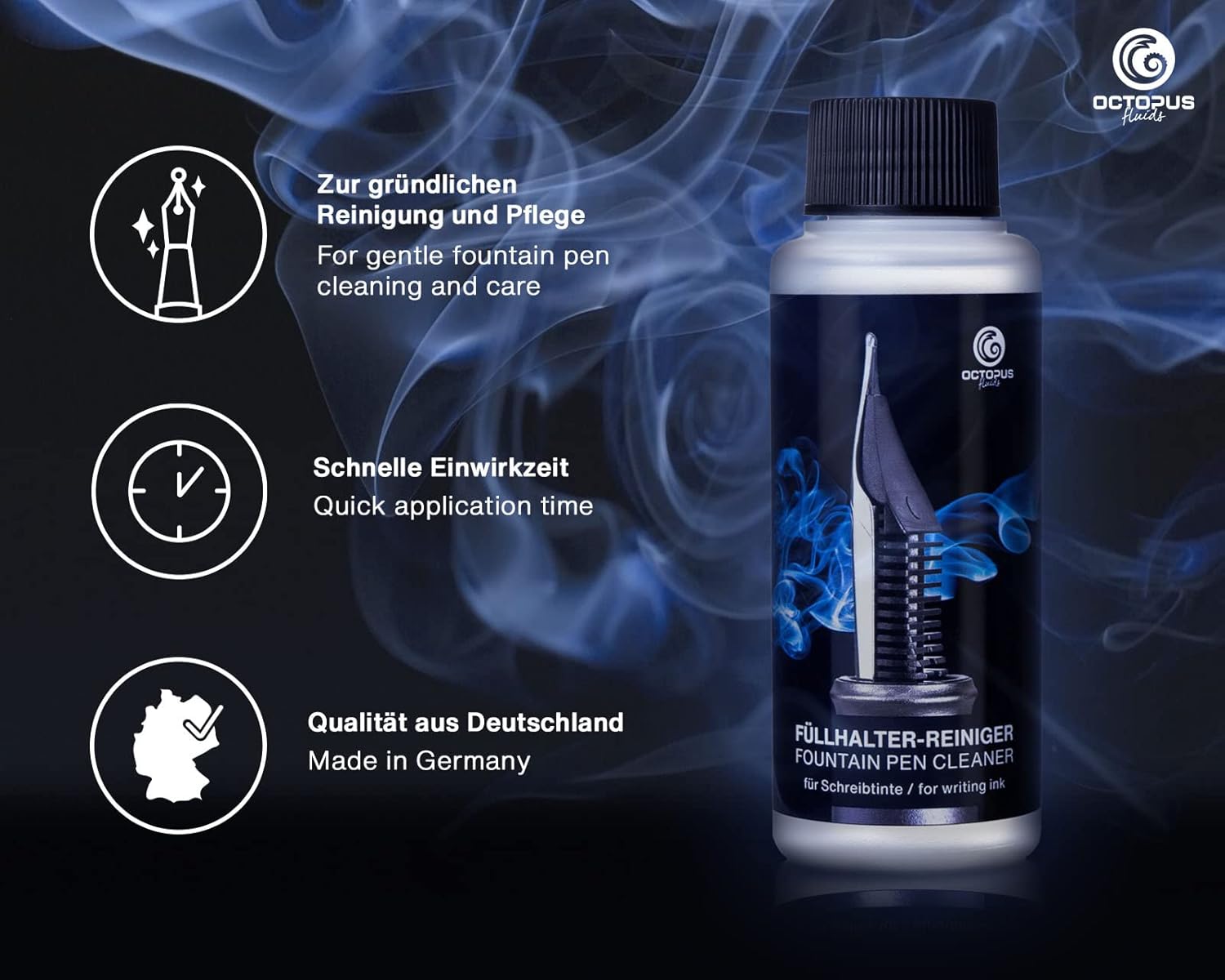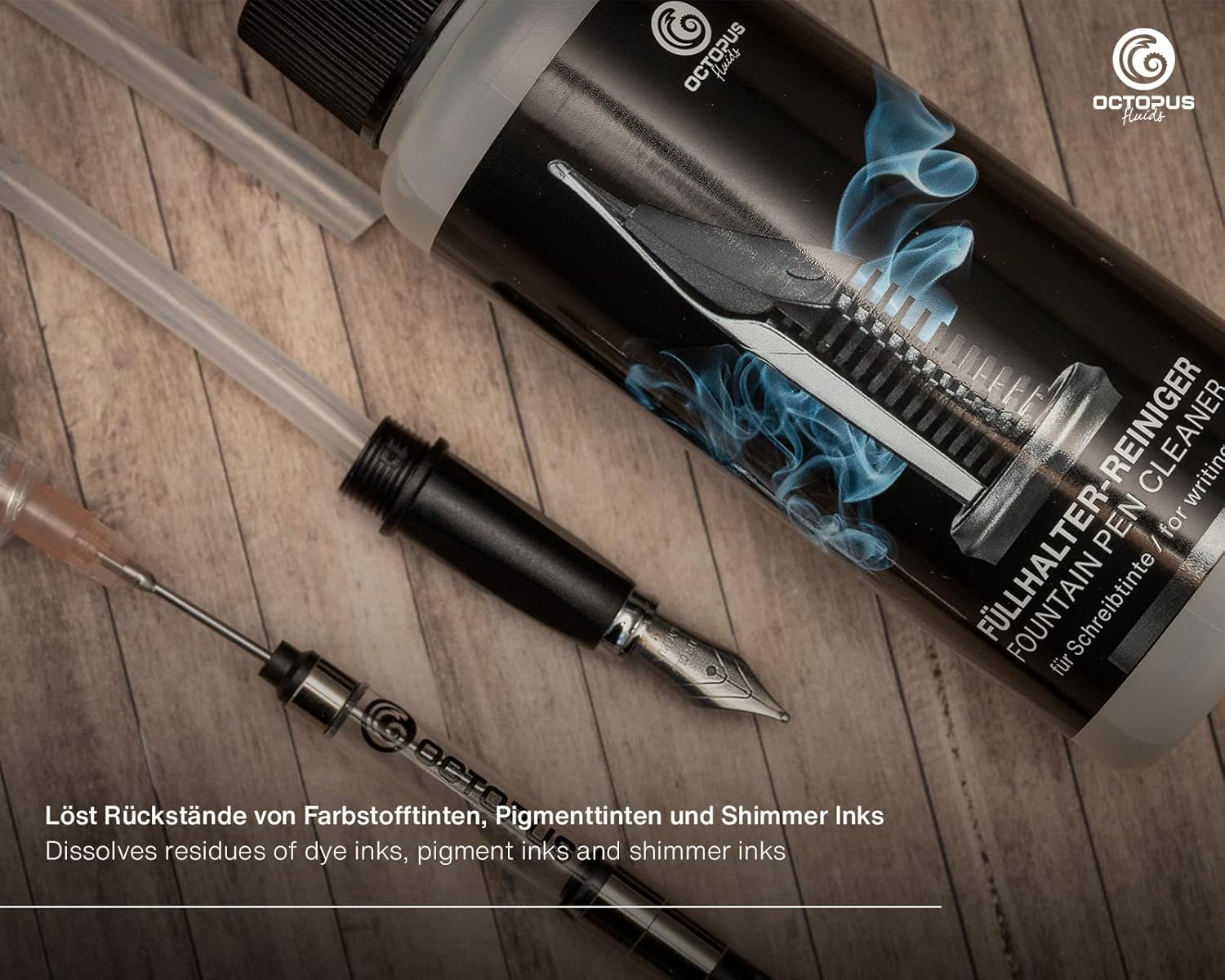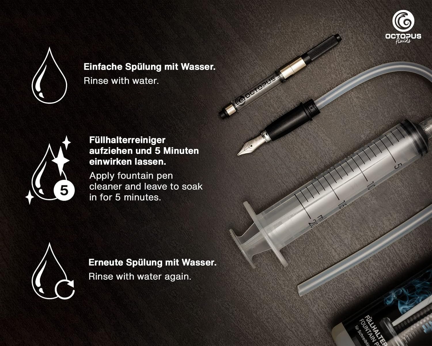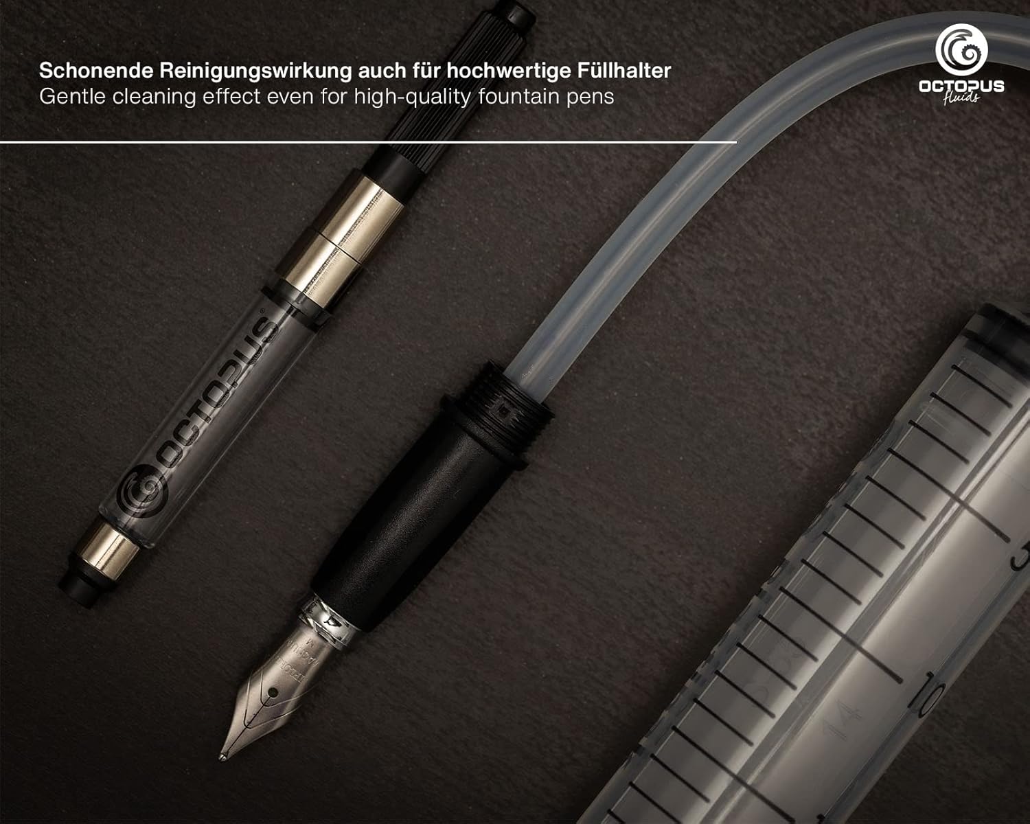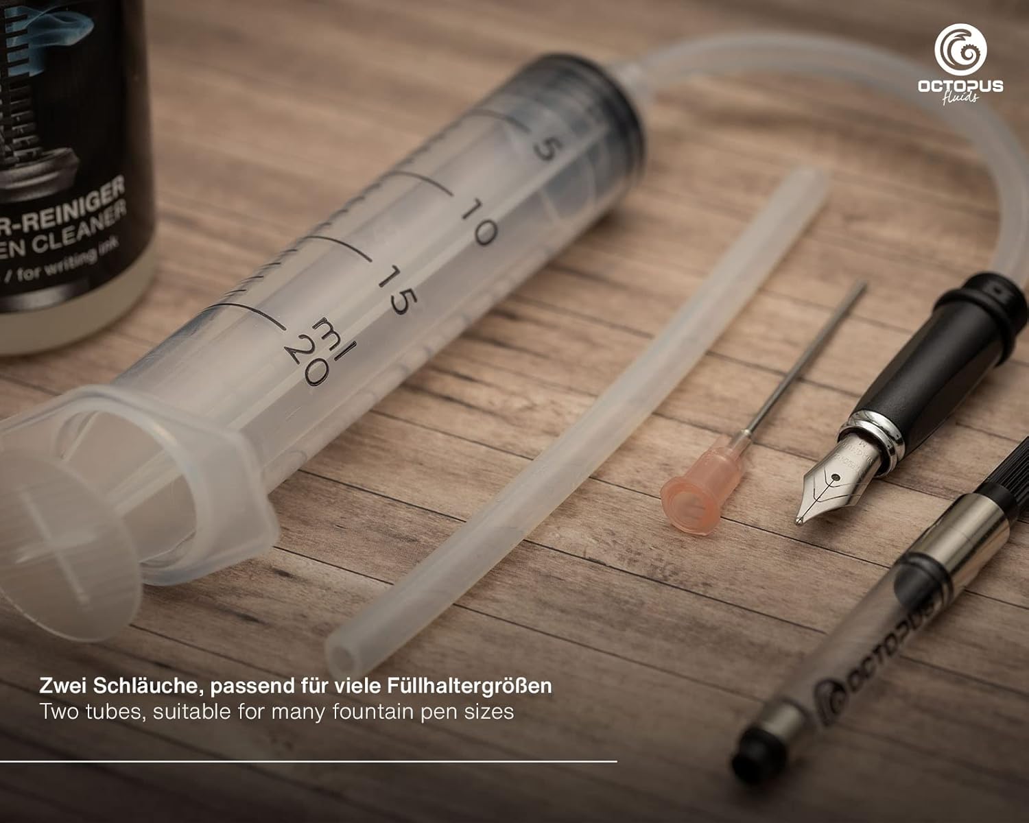 SET PULITORE PER PENNE STILOGRAFICHE per la pulizia rapida e approfondita di penne stilografiche a stantuffo, cartucce di riempimento e penne stilografiche con sistema a cartuccia. Adatto anche per la pulizia di pennini di vetro, pennini per calligrafia e convertitori. RIMUOVE IL RESIDO ASCIUGATO dagli inchiostri per stilografica idrosolubili e impermeabili, dagli inchiostri pigmentati e a prova di documento, dagli inchiostri luccicanti e dagli inchiostri per schizzi. PULIZIA RAPIDA E ACCURATA delle penne stilografiche in pochi minuti grazie alla siringa di pulizia inclusa nel set con due adattatori per tubi di diverse dimensioni e la cannula per la pulizia dei convertitori. Il tubo più piccolo è adatto per penne stilografiche con sistema a cartuccia standard (ad esempio Pelikan, Diplomat, Faber Castell, Kaweco, Cleo Skribent, Caran D'Ache, Waterman), quello più grande è adatto per Parker o Lamy. DELICATO per l'alimentazione dell'inchiostro, pennino e guarnizioni. MADE IN GERMANY dal produttore di inchiostri Octopus Fluids GmbH & Co. KG.