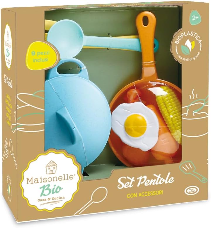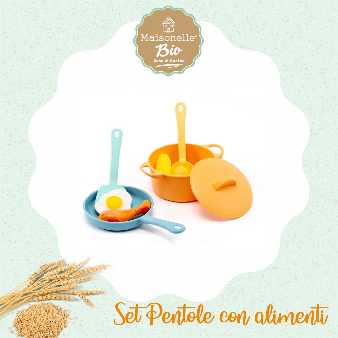 SET PENTOLE: Il set cucina bambini Maisonelle Bio offre ai bambini un'esperienza di gioco di ruolo realistica, stimolando la loro immaginazione e incoraggiando il gioco creativo. GIOCO CREATIVO E INTERATTIVO: Grazie alla qualità e alla sicurezza del materiale utilizzato, i bambini possono immergersi in un gioco di ruolo coinvolgente, creando le proprie storie e interagendo con gli accessori in modo sicuro e divertente. CONTENUTO DELLA CONFEZIONE: Il set pentole per bambini include: 1 pentola, 1 padella con coperchio, mestoli e alimenti. Offre una gamma completa di accessori per arricchire il gioco e ampliare la creatività dei bambini. IDEA REGALO ECOSOSTENIBILE: Questo set offre un'esperienza coinvolgente che stimola i sensi e favorisce lo sviluppo sensoriale dei bambini, mentre la sua impronta ecologica ridotta lo rende un regalo consapevole. Realizzato in bioplastica. MAISONELLE - Crescere giocando: La linea di casa e cucina che ha conquistato tanti piccoli aspiranti chef grazie alla qualità e all’inconfondibile stile country chic