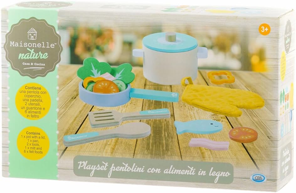 PLAYSET PENTOLINI: Il set cucina giocattolo per bambini Maisonelle offre ai bambini un'esperienza di gioco di ruolo realistica, stimolando la loro immaginazione e incoraggiando il gioco creativo. GIOCO CREATIVO E INTERATTIVO: Grazie alla qualità e alla sicurezza del materiale utilizzato, i bambini possono immergersi in un gioco di ruolo coinvolgente, creando le proprie storie e interagendo con gli accessori in modo sicuro e divertente. CONTENUTO DELLA CONFEZIONE: Il set include: 1 pentola con coperchio, 1 padella, 2 utensili, 1 guantone e 6 alimenti in feltro. Offre una gamma completa di accessori per arricchire il gioco di simulazione e ampliare la creatività dei bambini. IDEA REGALO ECOSOSTENIBILE: Questo set offre un'esperienza coinvolgente che stimola i sensi e favorisce lo sviluppo sensoriale dei bambini, mentre la sua impronta ecologica ridotta lo rende un regalo consapevole. Realizzato in legno. MAISONELLE - Crescere giocando: La linea di casa e cucina che ha conquistato tanti piccoli aspiranti chef grazie alla qualità e all’inconfondibile stile country chic