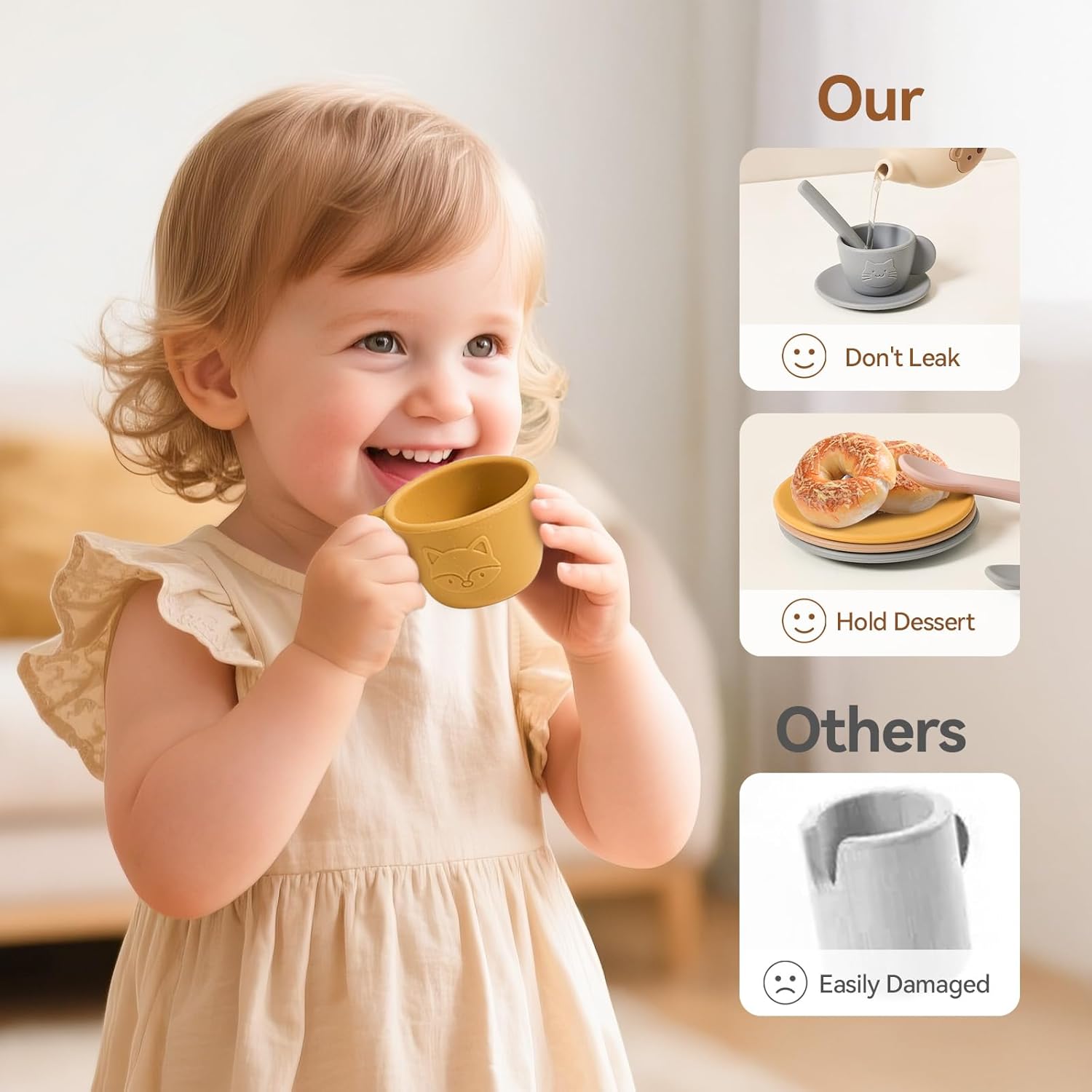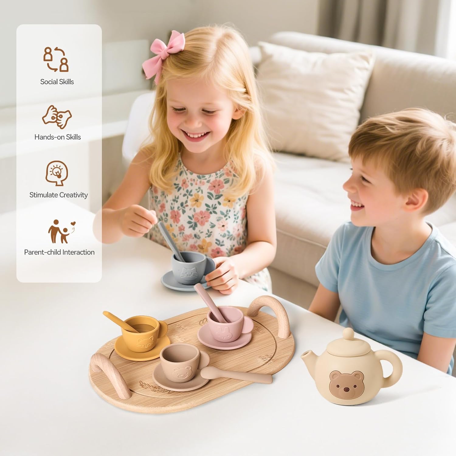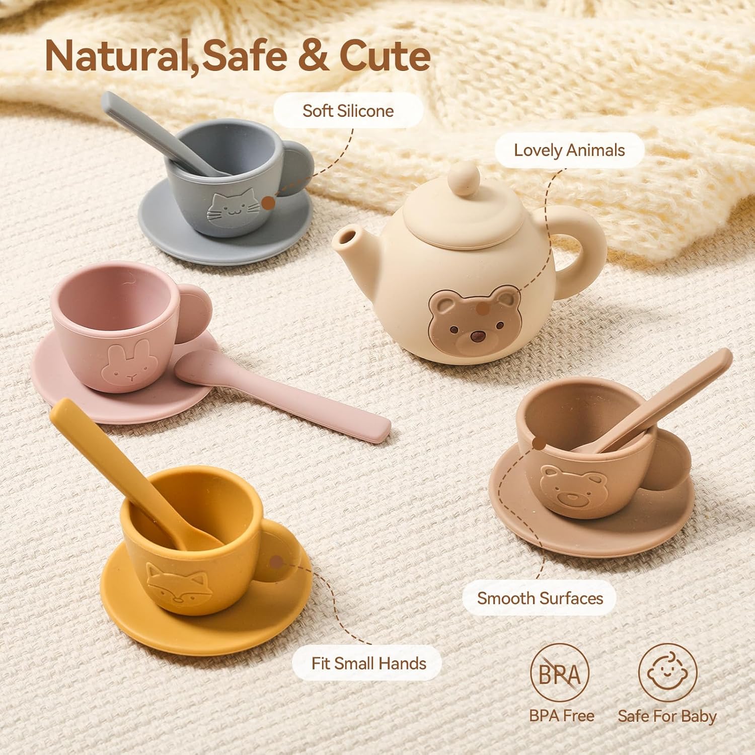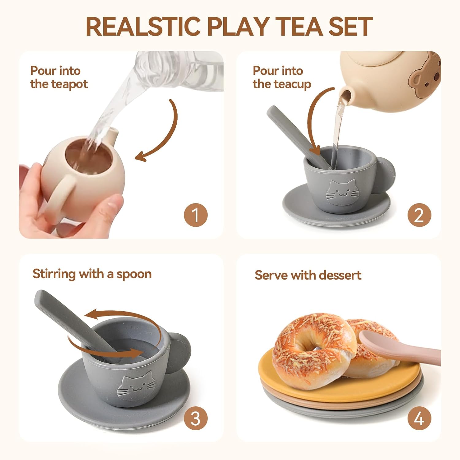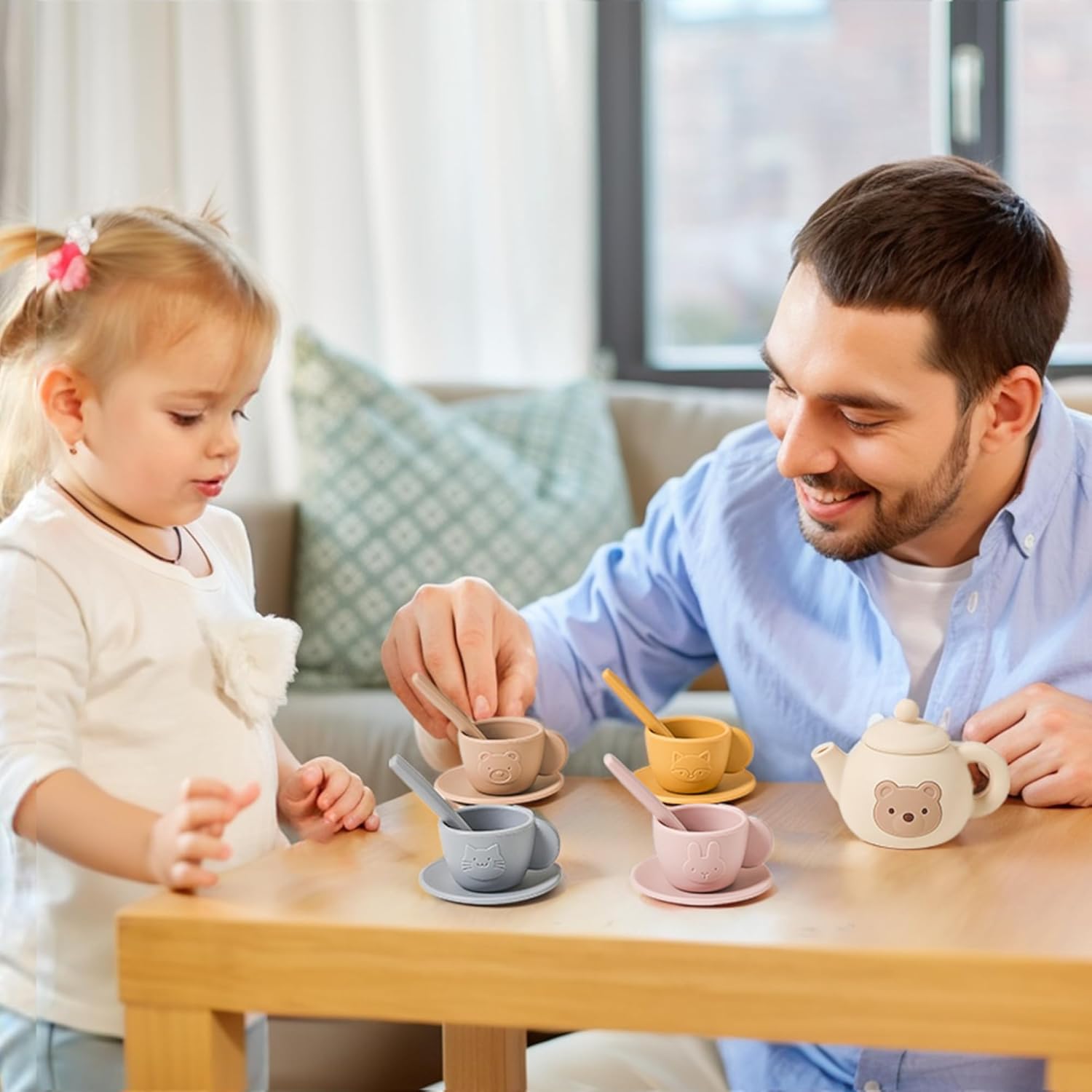 【Set da tè per giochi di finzione per bambini】 Include 1 teiera in silicone a forma di orso (capacità 110 ml), 4 tazze in silicone (capacità 26 ml), 4 sottobicchieri e 4 cucchiaini per un'autentica esperienza di tea party. Perfetto per sviluppare le abilità sociali e il legame genitore-figlio 【Set da tè in silicone sicuro e resistente con vassoio in legno】 Realizzato in silicone 100% alimentare, privo di BPA, morbido, resistente ai morsi e alle cadute, per una sicurezza totale durante il gioco. Conforme agli standard di sicurezza internazionali (certificato EN71) 【Giocattolo educativo per lo sviluppo】 Disegni di animali in rilievo 3D (orsi, gatti, volpi, conigli) per stimolare il gioco fantasioso dei bambini da 1 a 6 anni. Tutto il necessario per tea party fantasiosi. Incoraggia le capacità motorie fini attraverso la pratica del versare, promuove le capacità di condivisione/sociali e sviluppa il linguaggio attraverso il gioco di ruolo. Supporta i principi di apprendimento Montessori per bambini da 1 a 6 anni 【A prova di perdite e facile da pulire】 Tutte le tazze e la teiera possono contenere acqua vera senza perdite, rendendo il gioco di finzione più realistico. Tutti i componenti in silicone sono lavabili in lavastoviglie. Teiera adatta al microonde (fino a 220 °C/428 °F) per giocare con bevande calde. Teiera leggera perfetta per le mani piccole 【Regalo perfetto per i bambini】 Il set pronto all'uso è un ottimo regalo di compleanno/Natale per bambini e bambine dai 3 anni in su. Promuove il gioco fantasioso senza schermi con un adorabile design a tema orsacchiotto. Una scelta regalo premurosa che unisce divertimento e apprendimento