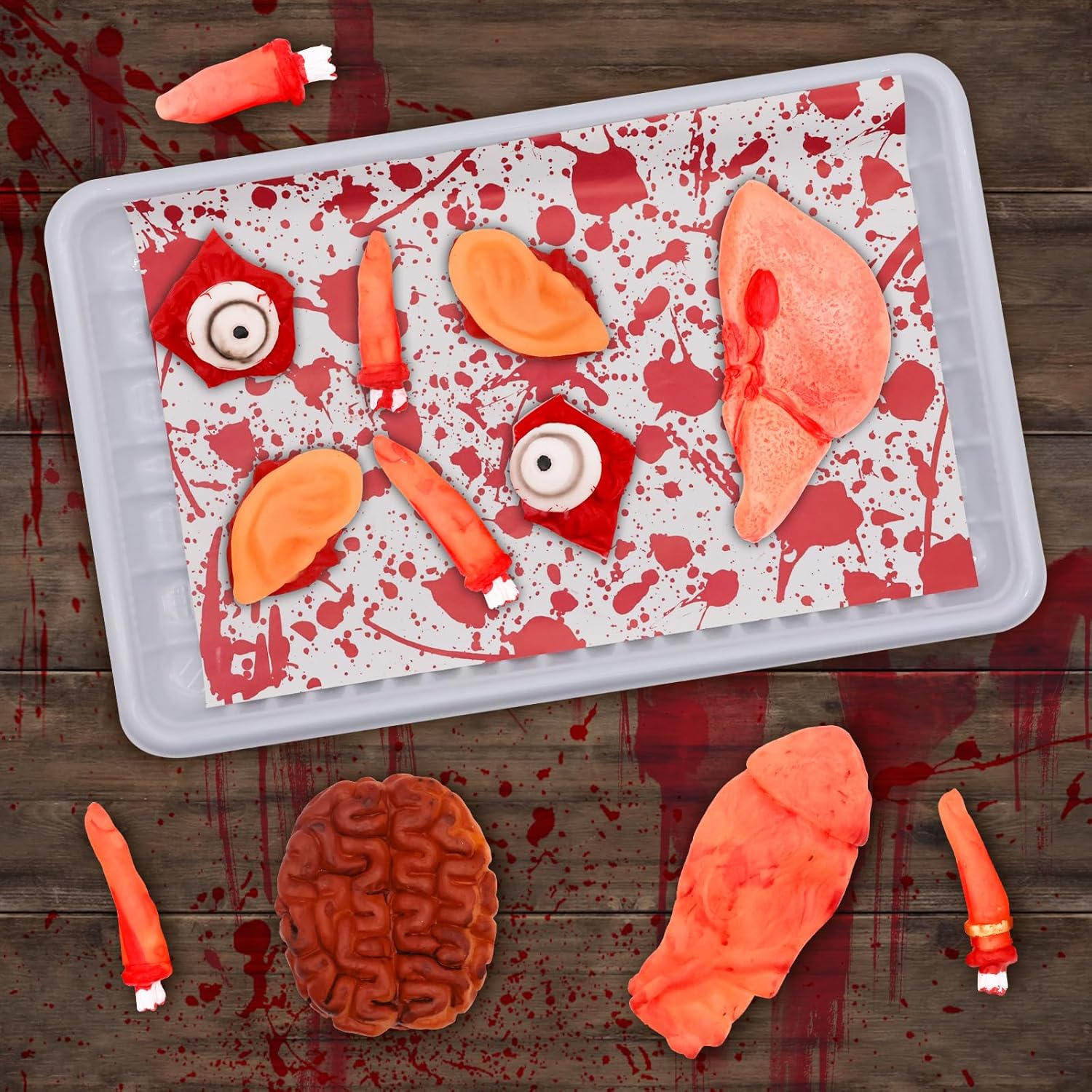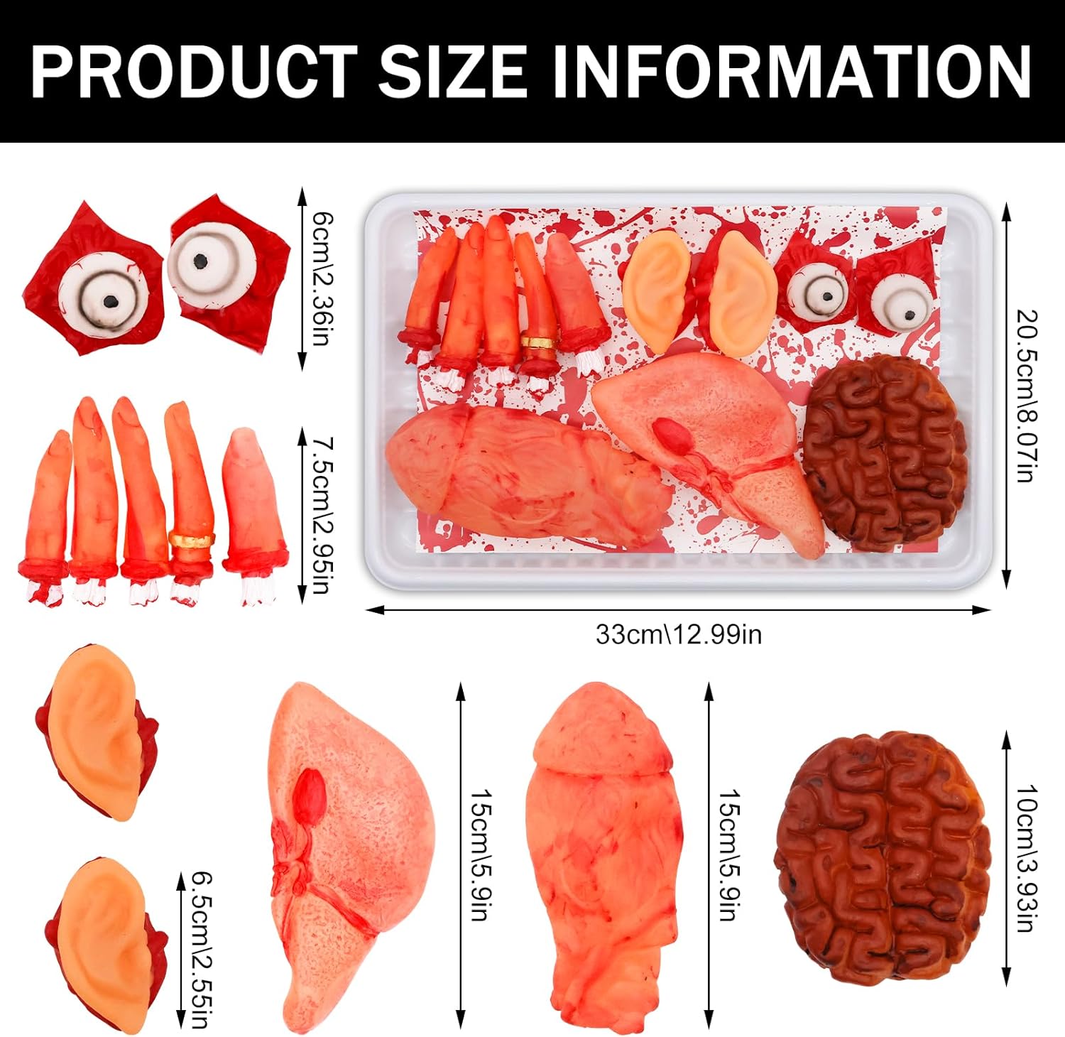 PARTI DEL CORPO TAGLIATE HORROR: riceverai 2 bulbi oculari, 5 dita, 2 orecchie, 1 fegato, 1 cuore e 1 cervello, 12 pezzi in totale per soddisfare le tue esigenze di decorazione malvagie e divertenti. MATERIALE DI ALTA QUALITÀ: gli organi insanguinati sono realizzati in lattice di alta qualità, morbido al tatto e con una forma realistica, sanguinante e flessibile. Questi organi insanguinati hanno un design molto realistico e hanno le stesse dimensioni degli organi reali. APPLICAZIONE: può essere utilizzato come accessorio di Halloween in cucina, bagno, cortile, stanze, portici e ingressi di casa. Daranno a te, ai tuoi amici e ai tuoi ospiti un'esperienza indimenticabile in una casa stregata o in una festa. MULTIUSO: Gli oggetti di scena insanguinati di Halloween sono organi umani finti e sanguinanti realistici con disegni raccapriccianti di mani e piedi, perfetti per decorazioni di Halloween, decorazioni di case stregate, oggetti di scena per spettacoli teatrali, trucchi magici, oggetti di scena per il primo di aprile, feste a tema zombie e altre occasioni. DECORAZIONE PERFETTA DI HALLOWEEN: queste protesi sono spaventose da morire, perfette per feste, Halloween, primo di aprile, spettacoli teatrali, oggetti di scena e altri oggetti di scena decorativi di Halloween. Sorprendi o spaventa i tuoi ospiti della festa di Halloween con queste decorazioni di Halloween!