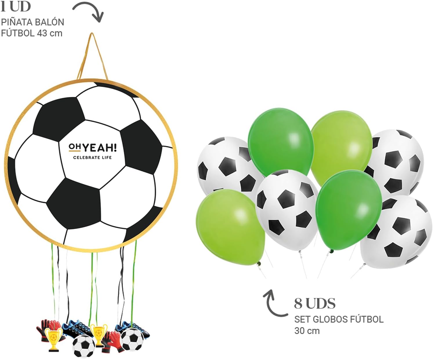 ⚽COMPONENTI: Pignata Pallone misura Ø 43 cm + Confezione da 8 palloncini opachi lattice a tema calcio Ø 30 cm. Design accattivante e colorato: facciamo una festa incredibile! Se stai pianificando di festeggiare un compleanno o una festa a tema, non puoi dimenticare di includere nella tua lista questa fantastica pignatta con palloncini in lattice che lascerà tutti i tuoi ospiti a bocca aperta. Oltre alla musica e al divertimento, questa pignata sarà al centro dell'attenzione, assicurandoti un'esplosione di gioia e colore al tuo evento! ⚽ PUOI METTERE NEL SITO PIÙ COOL DELLA PARTIA: Preparati per un'esperienza unica piena di divertimento ed eccitazione! Ha dei nastri per i bambini per tirare, rompere e cadere tutti i giocattoli o le caramelle! *La pignata viene venduta vuota. ⚽FACILE DA RIEMPIre: il modo migliore per godersi è mettere la pignata all'aperto e in un luogo rialzato. L'abbiamo riempita fino all'alto e... Inizia il gioco! ⚽ RESISTENTE: la carta/cartone che utilizziamo proviene da foreste sostenibili e neutre in carbonio e soddisfa gli standard ambientali.