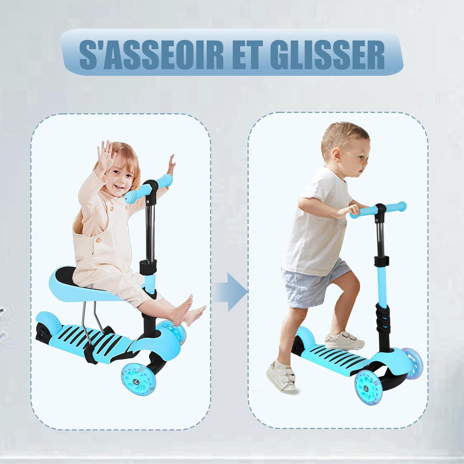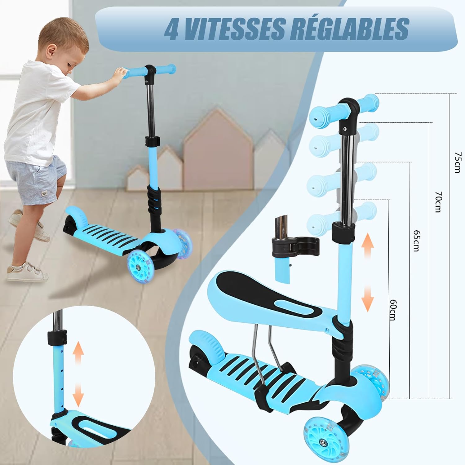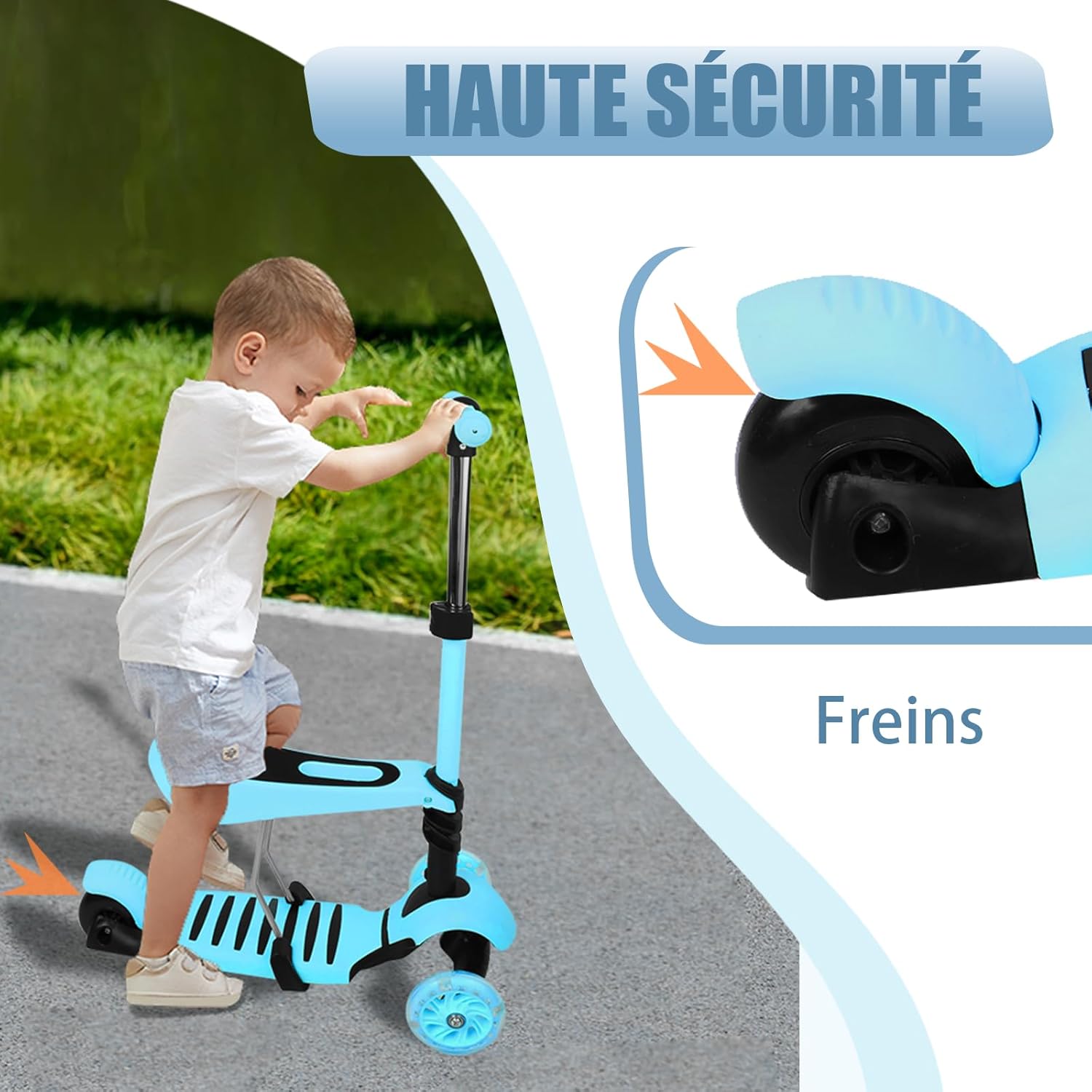 Scooter 3 in 1: lo scooter per bambini con certificazione di sicurezza e design 3 in 1 può essere utilizzato come ausilio per la deambulazione per neonati, passeggini o scooter. Sviluppa le capacità motorie e l'equilibrio del bambino divertendosi: il ribaltamento laterale è efficacemente evitato grazie a 2 ruote e un limitato grado di inclinazione. 2 Le ruote in PU estremamente elastiche e resistenti formano una forte struttura triangolare. Manubrio regolabile: Manubrio regolabile e rimovibile con impugnatura in gomma morbida, range di altezza 68-73-78 cm. Adatto alla crescita del tuo bambino. Design per bambini dai 3 agli 8 anni. Ruota lampeggiante a LED: 2 LED lampeggianti nelle ruote: queste luci si accendono quando le ruote girano. Queste luci lampeggianti sono divertenti per i bambini, soprattutto di notte. Struttura stabile: il manubrio a T può essere ruotato di 45 gradi a sinistra e a destra. Le maniglie imbottite in gomma offrono una presa ottimale. Grazie al freno della ruota posteriore facilmente accessibile, lo scooter può essere frenato molto rapidamente. Il poggiapiedi antiscivolo garantisce un'esperienza. Peso massimo: 30 kg