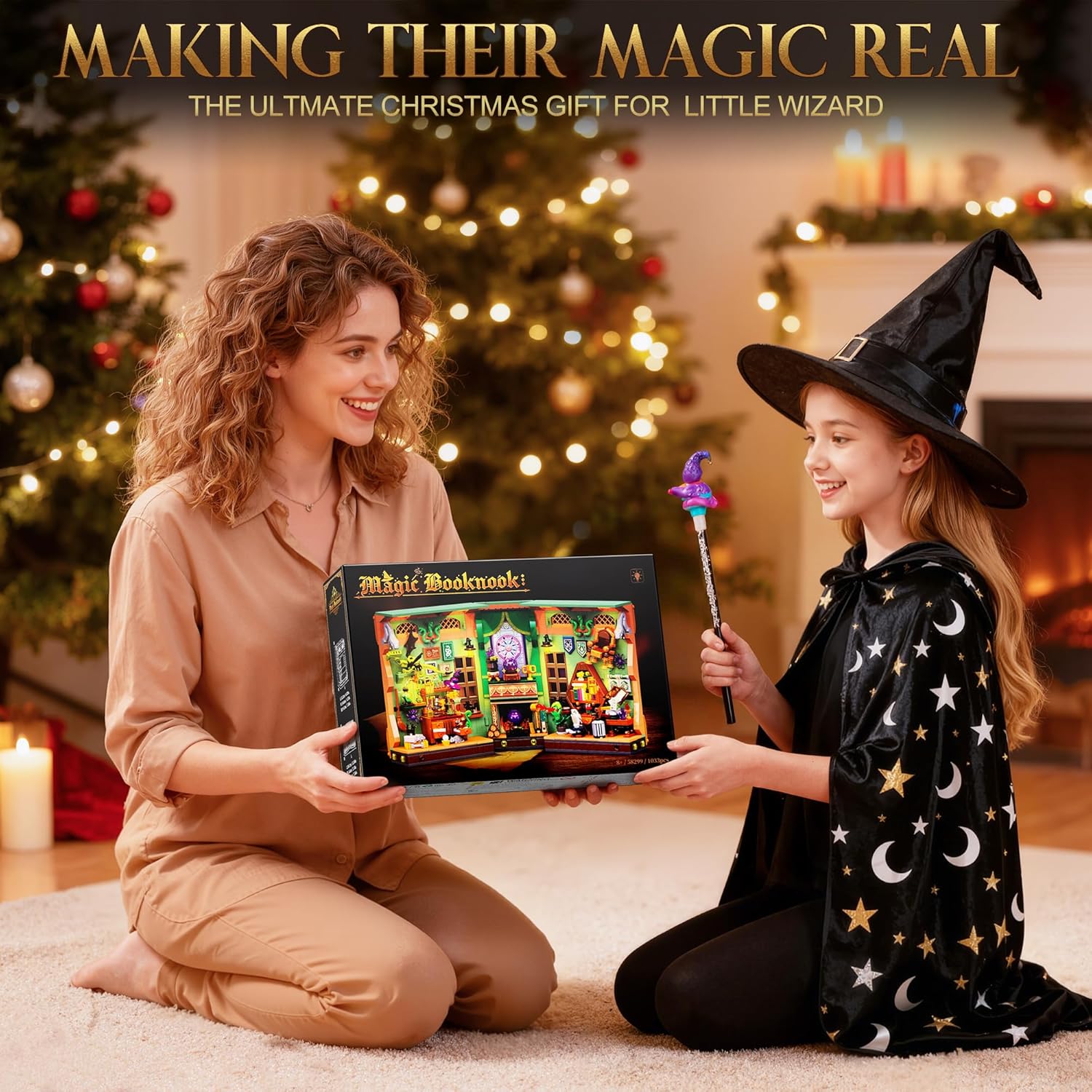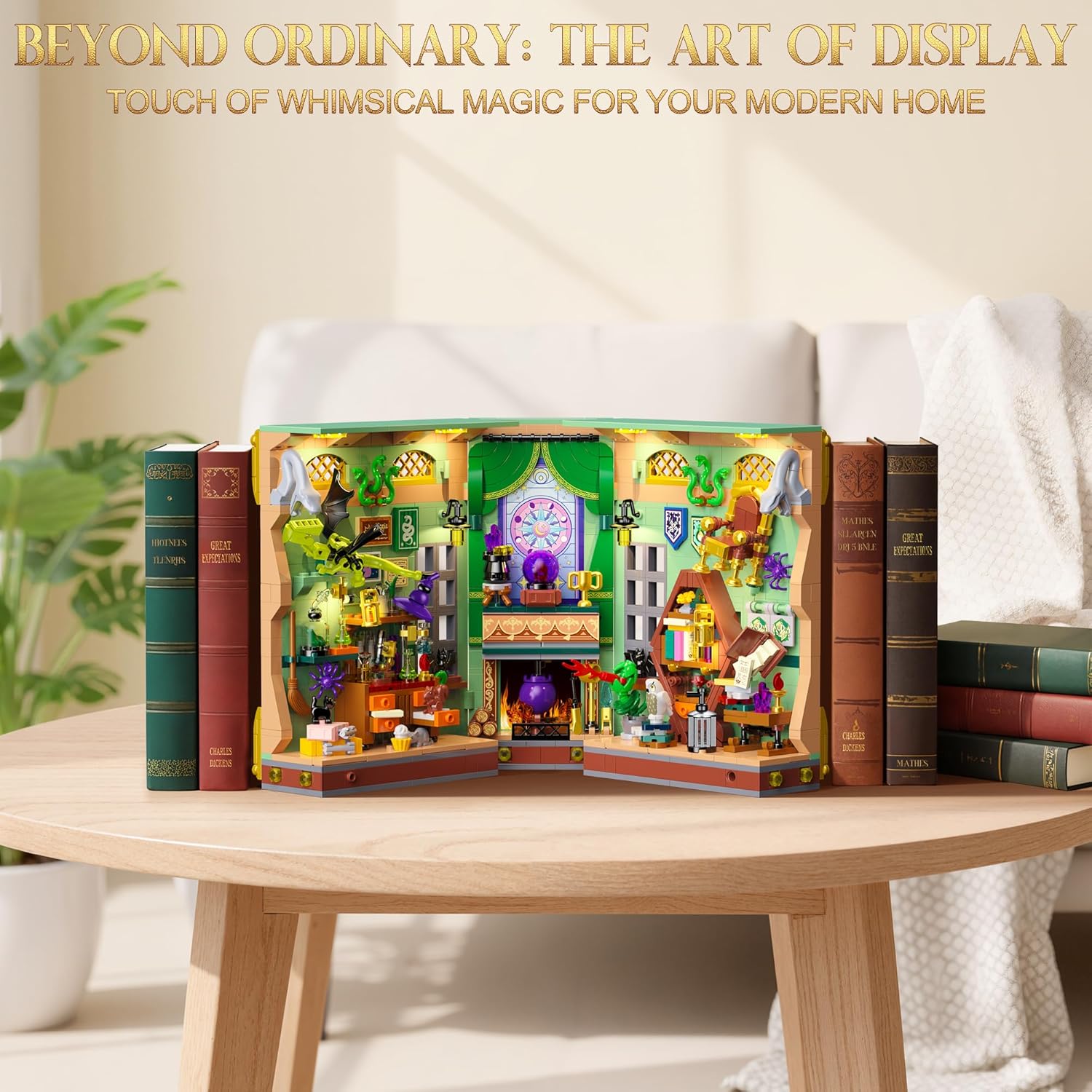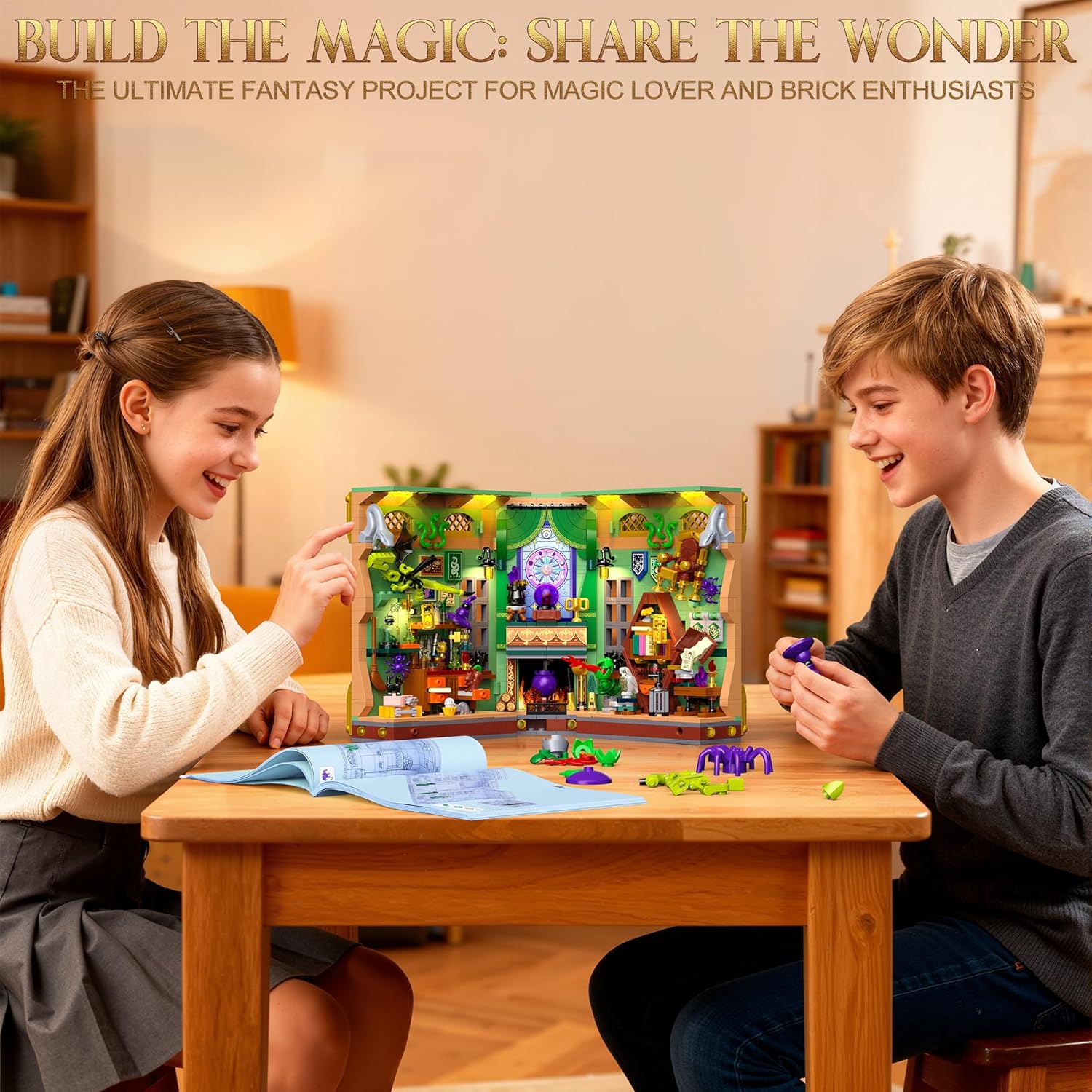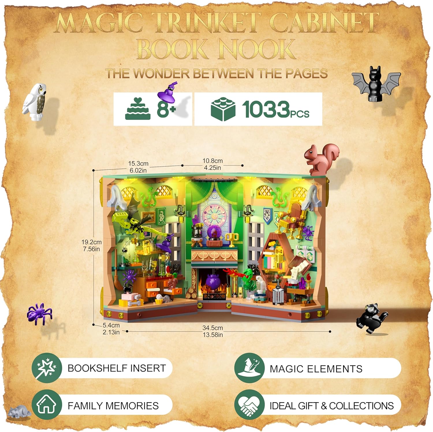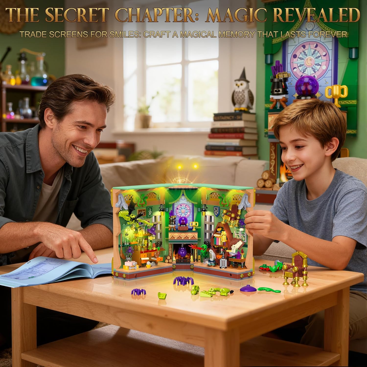 SET DA COSTRUZIONE ANGOLO DEL LIBRO DELLA POZIONE MAGICA — Più che un semplice set da costruzione, è un portale per un altro mondo. Chiuso, questo tomo antico adorna con eleganza la tua biblioteca e i suoi contorni rivelano la magia che racchiude. Apritelo da 0° a 180°: il libro si trasforma in un portale dimensionale. Ogni dettaglio sussurra leggende di antiche stregonerie, invitandoti in un regno fantastico. Il tuo viaggio magico inizia non appena apre. LA MAGIA PRENDE VITA — Un ufficio stregato, una biblioteca magica, un laboratorio di pozioni e una sfera di cristallo... Una poltrona levita nell'aria, ricreando le meraviglie della magia. Una pianta Piranha si sveglia davanti a un gufo. Una bottiglia di essenza di rana fuma mentre un gatto nero custodisce erbe rare. La sfera di cristallo rivela il tuo oroscopo, accanto a un calderone ribollente che attende i tuoi esperimenti con le pozioni! DECORAZIONE ELEGANTE – Immergiti in un vibrante mondo in miniatura con questo splendido kit per angolo libro. Molto più di un semplice set da costruzione, è una collezione squisita e un raffinato elemento decorativo. Per esaltarne i dettagli, questo magico angolo di libri è dotato di un ingegnoso sistema di illuminazione. La luce calda illumina delicatamente ogni angolo, creando un'atmosfera magica e misteriosa che ti trasporta in un mondo magico. KIT DI COSTRUZIONE DI QUALITÀ — Costruisci un universo magico con questo set da 1033 pezzi. Composto da mattoncini standard di alta qualità, ogni elemento liscio e facilmente identificabile garantisce un assemblaggio robusto. La guida illustrata rende il montaggio accessibile ai bambini dagli 8 anni in su e agli adulti. Dal primo all'ultimo mattone, vivi l'esperienza di un artigiano che decifra i misteri del destino nel tuo mondo magico. IDEA REGALO CREATIVA — Scatena l'immaginazione con il nostro giocattolo costruibile! Molto più di un gioco per bambini, è un elemento decorativo unico. Perfetto per ragazze, ragazzi, adolescenti e adulti dagli 8, 9, 10, 11, 12 anni in su. Regalo ideale per la festa dei bambini, Natale, Halloween, Pasqua, compleanni, Ringraziamento o Capodanno! Il suo fascino magico sedurrà tutti.