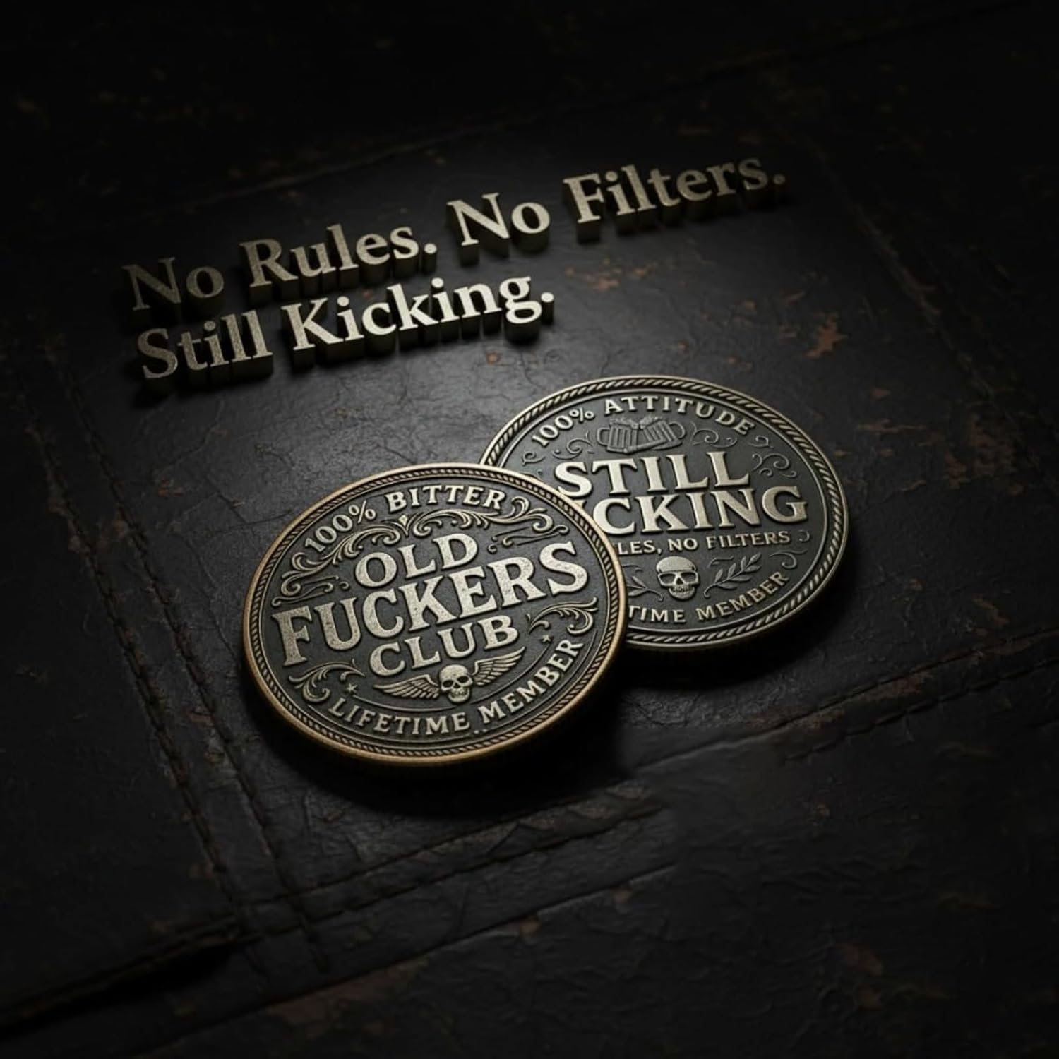 FESTEGGIA LA TUA ISCRIZIONE - Mostra il tuo status leggendario con la Moneta per Socio a Vita dell'Old Fckers Club*. Caratterizzata da scritte audaci, raffinate volute e un design ribelle, questa moneta da collezione segna il tuo percorso con orgoglio, risate e un pizzico di carattere. MONETA SFIDA A DUE FACCE – Il retro presenta l'iconico motto "Still Kicking – No Rules, No Filters" e boccali di birra tintinnanti: un omaggio a chi vive liberamente e ride a crepapelle. Un perfetto simbolo di umorismo per adulti, sia per i ribelli di sempre che per gli amanti della birra. REGALO DIVERTENTE PER OGNI OCCASIONE – Cerchi un regalo divertente per la pensione o qualcosa di unico per un compleanno? Questa moneta regalo scherzosa porta risate e nostalgia in ogni momento. Ideale per uomini, donne e amici che si rifiutano di prendere la vita troppo sul serio. ARTIGIANATO DI ALTA QUALITÀ – Realizzata in lega resistente con una ricca finitura metallica anticata, questa moneta sfida commemorativa è solida al tatto e splendida da esporre. Un oggetto da collezione di alta qualità per adulti che unisce umorismo a uno stile senza tempo. UMORISMO AUDACE E ATTEGGIAMENTO SENZA TEMPO – "Senza regole. Senza filtri. Continuo a calciare". Questa moneta dell'Old Fckers Club celebra coloro che non si addolciscono mai con l'età, coloro che ancora alzano un bicchiere, raccontano storie selvagge e ridono più forte che mai. Sfoggia con orgoglio la tua iscrizione all'Old F*ckers Club.