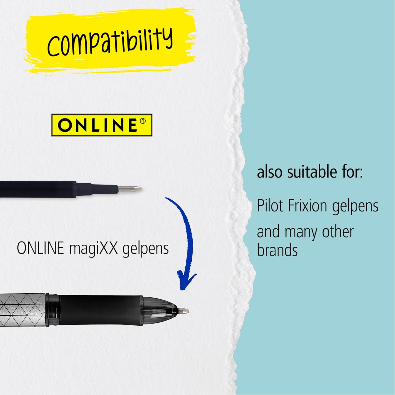 SCRIVERE IN MODO RILASSATO: cancellate semplicemente i piccoli errori di scrittura - l'inchiostro può essere rimosso completamente senza sbavature. Basta con le barrature, i segni di spunta e i fogli di lavoro antiestetici, grazie alle penne gel cancellabili. GRANDE SENSO DI SCRITTURA: le penne gel ONLINE sono caratterizzate da un flusso d'inchiostro uniforme e da un colore omogeneo. Le ricariche di ricambio per penne cancellabili sono ideali per imparare a scrivere e sono pratiche per la vita quotidiana e l'ufficio. PER L'AMBIENTE: con le ricariche per penne cancellabili si possono evitare i rifiuti di plastica. Invece di smaltire la penna, è sufficiente inserire un refill di ricambio. Set con 3 ricariche. OFFLINE CON ONLINE - LA QUALITÀ DEL MARCHIO ONLINE: Noi di ONLINE siamo un'azienda familiare tedesca che dal 1991 produce con entusiasmo e passione articoli di cancelleria di alta qualità, innovativi, funzionali e dal design accurato, trasportando gli appassionati di scrittura in un mondo di creatività.