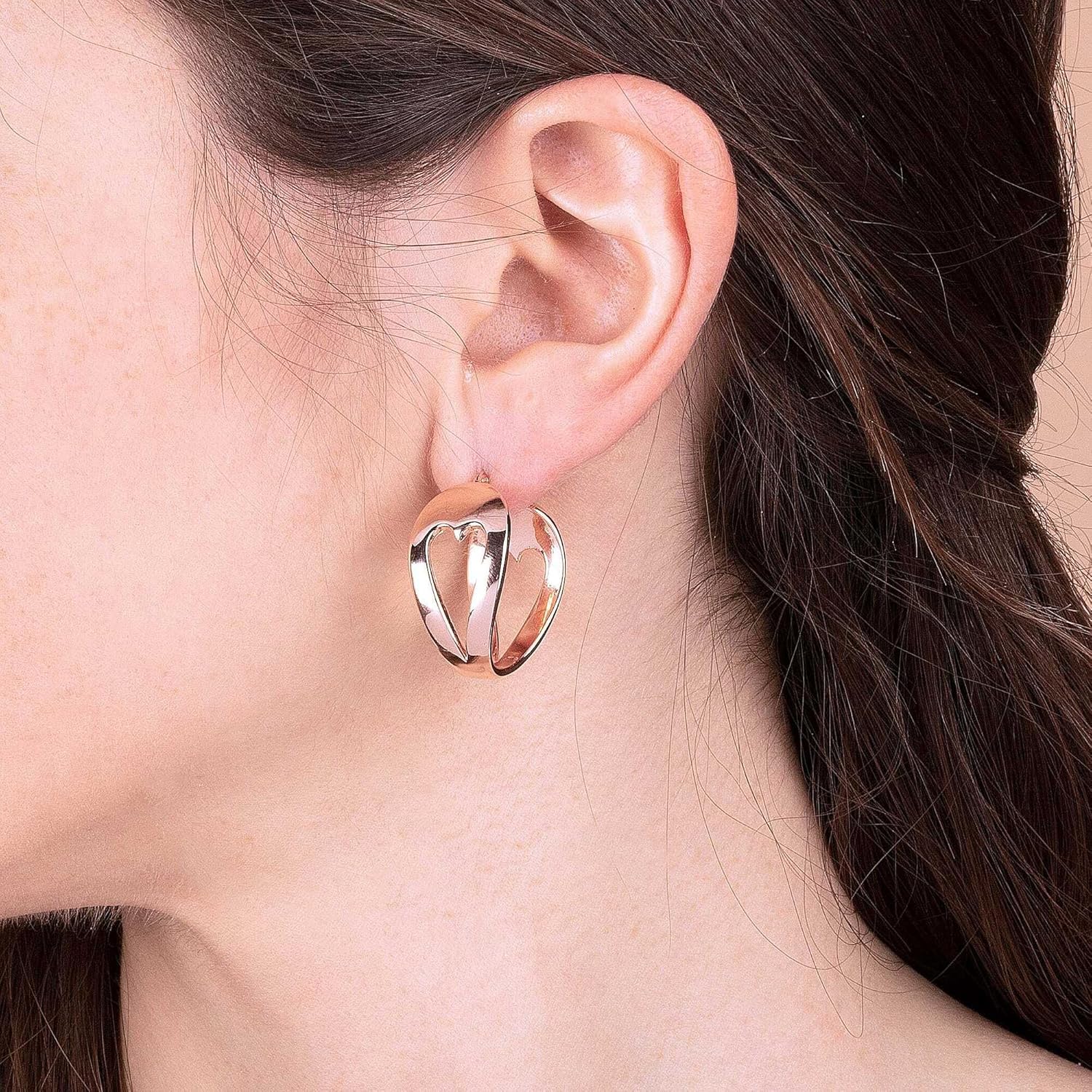Orecchini da donna a cerchio di Bronzallure della collezione Purezza. Realizzati in lega Golden Rosé, placcati oro rosa 18kt, contraddistinti da un doppio cuore; chiusura a baionetta. Lega brevettata Golden Rosé Designed and made in Italy. Nickel free, cadmium free. Ipoallergenici. Peso g13.2. Taglia Unica. La referenza è WSBZ01769.R