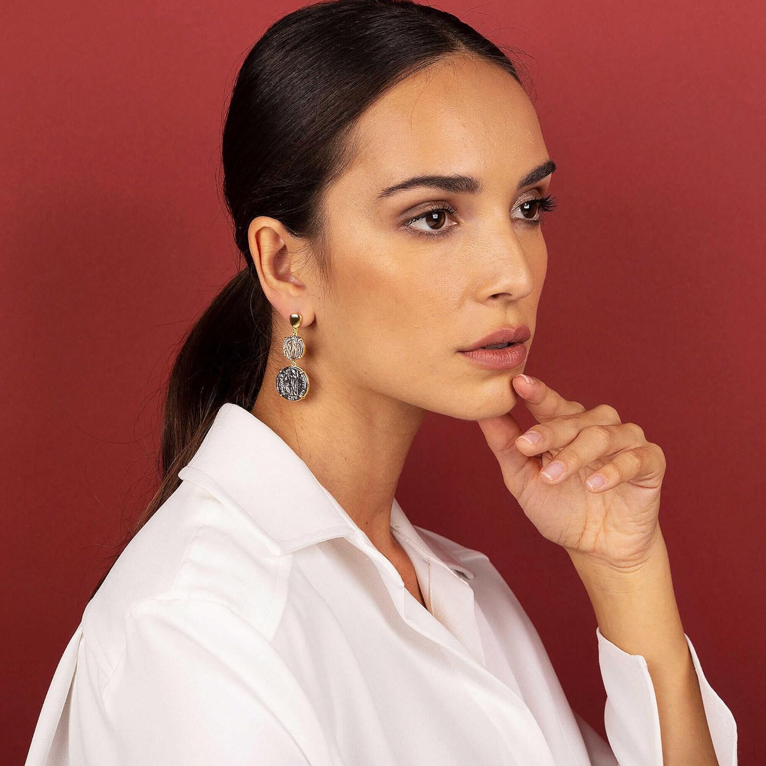 Orecchini da donna pendenti di Etrusca della collezione Creta. Gioielli realizzati in lega Golden, placcata oro giallo 18kt, con contro-maglia martellata e doppia moneta (piccola 15 mm/grande 21 mm); chiusura a perno e farfalla; lunghezza di 4.5 cm. Lega brevettata Golden. Designed and made in Italy. Ipoallergenici. Taglia Unica. Peso g15.3. La referenza è WSET00544.BIC
