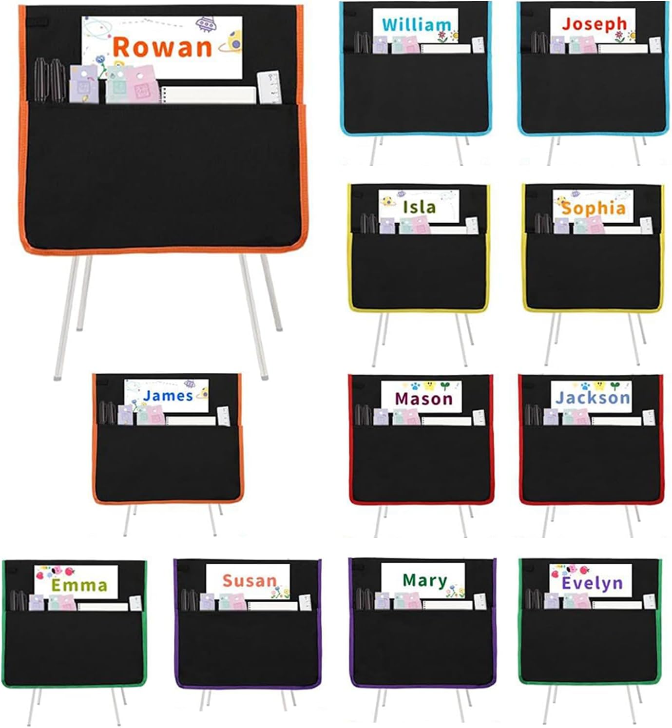 Stabile e facile da installare: progettate per fissare la schiena in modo sicuro, queste borse per sedie offrono un metodo di montaggio slip-on che garantisce comfort e stabilità, promuove aule organizzate con facilità d'uso Maggiore durata: l'organizer per sedia è realizzato in robusto tessuto Oxford 900D con elevata resistenza all'umidità e resistenza all'abrasione, è lavabile in lavatrice e offre una lunga durata grazie al materiale di qualità adatta all'uso quotidiano Multiuso flessibile: perfettamente adatto per aule, aree d'arte, sale scientifiche e camere per bambini, combina un'organizzazione intelligente con un design accattivante per diverse esigenze Organizzazione scolastica che fa risparmiare tempo: set da 12 con doppio numero di carte nome (24 pezzi) per un utilizzo flessibile. La larghezza di 38 cm appositamente progettata consente una vestibilità antiscivolo su sedie di classe standard. Sistema di archiviazione in classe: pratico sistema di organizzatore per sedie ottimizza la gestione dei materiali scolastici nella vita scolastica, crea più struttura per gli studenti e previene i compiti e gli strumenti di apprendimento persi grazie allo stoccaggio sistematico