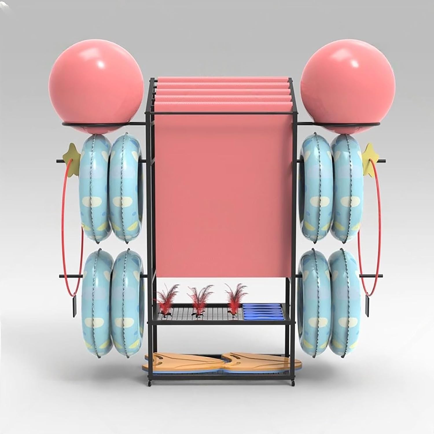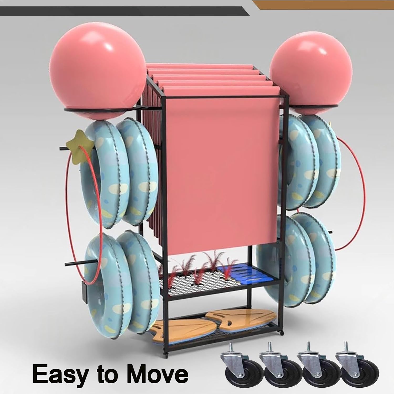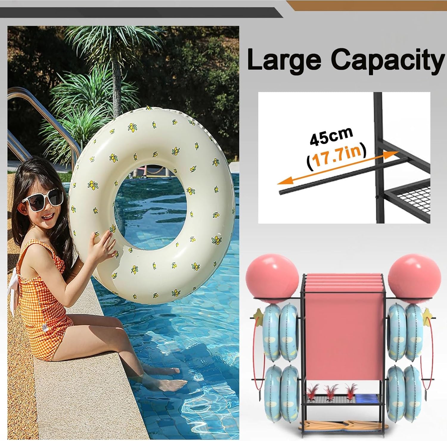 Soluzione multiuso: questo carrello versatile è progettato per contenere anelli da nuoto, asciugamani, occhiali e molto altro ancora, rendendolo perfetto per l'uso a bordo piscina, spiaggia, giardino o campeggio. Il suo design a telaio aperto garantisce un facile accesso a tutti i tuoi oggetti essenziali. Design spazioso e robusto: dotato di un'altezza di 175 cm con quattro traverse da 45 cm, questo carrello può appendere fino a otto anelli da nuoto. La sua struttura in ferro metallico rinforzato supporta fino a 45 kg, garantendo durata e stabilità senza oscillazioni. Maggiore mobilità: dotato di quattro ruote girevoli a 360 gradi, questo carrello si muove senza problemi su varie superfici. La sua mobilità consente un facile riposizionamento, migliorando comodità ed efficienza in qualsiasi ambiente. Costruzione durevole: realizzato in ferro metallico resistente con saldatura stretta, questo supporto galleggiante per piscina resiste alla deformazione e alla rottura. Il suo design robusto garantisce un uso a lungo termine, in grado di sostenere un peso significativo senza compromettere la stabilità. Facile da montare: questo carrello può essere montato rapidamente in tre semplici passaggi: disimballare, fissare gli accessori e fissare le ruote. Pronto per l'uso immediato, è ideale per esporre la merce o organizzare una varietà di articoli con tempi di installazione minimi.