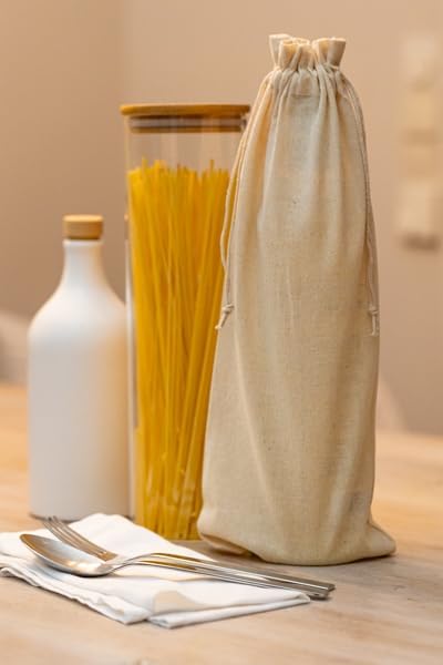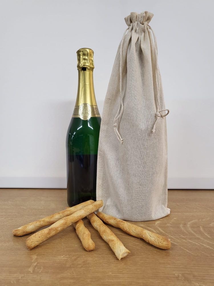 Borsa in cotone naturale, ecocertificata per vino, spumante, champagne... Borsa regalo con coulisse per bottiglie e piccoli oggetti lunghi Adatta per uso alimentare in cucina e in viaggio Ecologica ed evita sprechi, sostenibile La borsa giusta per Natale, compleanni, matrimoni, anniversari...