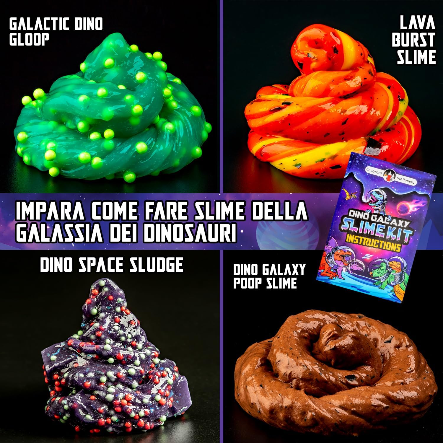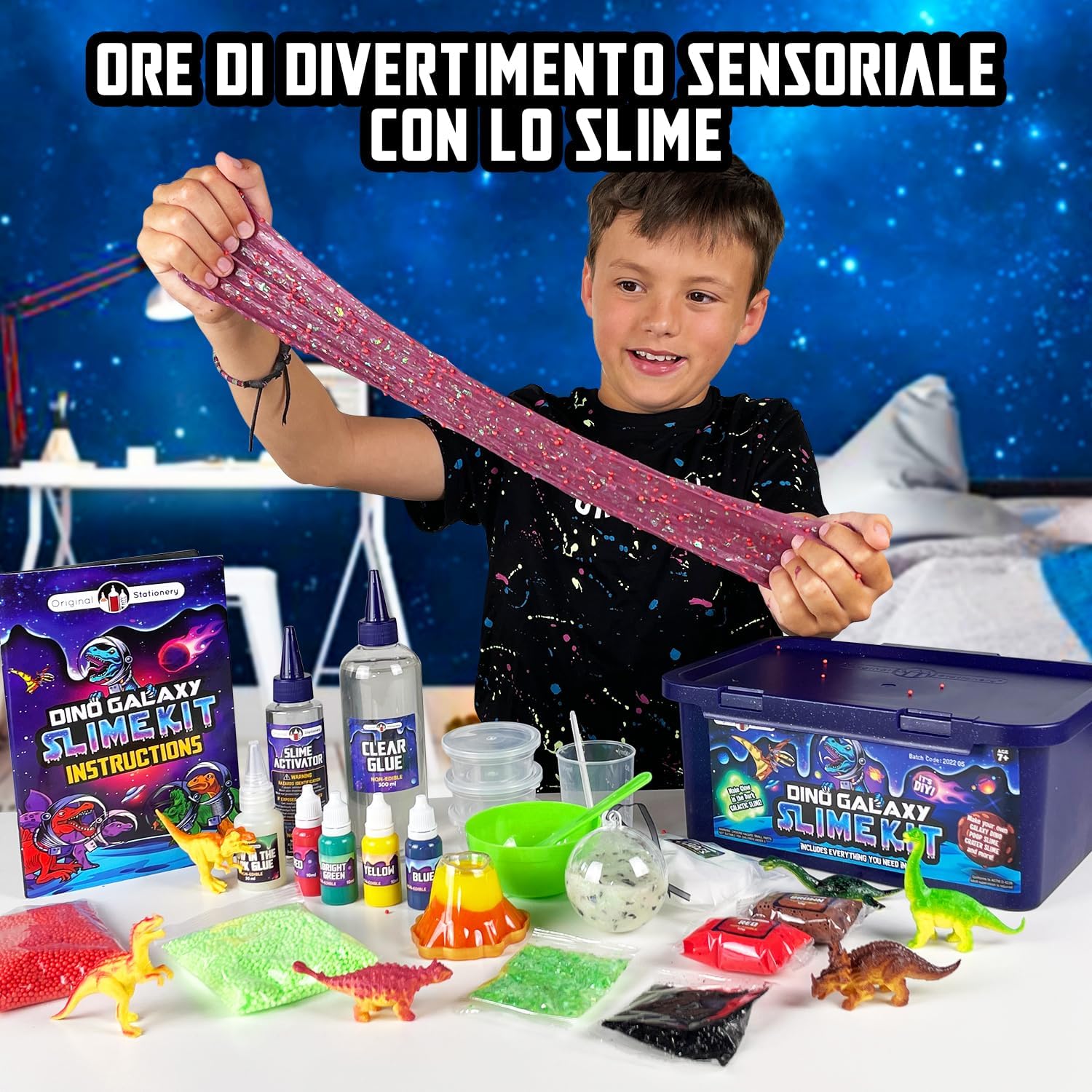 Crea un mondo dei dinosauri con contenitori per slime a forma di dinosauri e galassie in questo kit per slime completo fai da te. Ore di divertimento creativo lontani dagli schermi con il kit crea slime che include dinosauri giocattolo. Set fabbrica di slime cosmica per bambini che aiuta a sviluppare la coordinazione e la creatività. Sperimenta con gli accessori! realizza slime glow in the dark e galassie di slime incredibili con questo slime kit completo. Laboratorio slime dei dinosauri che permette di divertirsi creando slime, ottimo come regalo di compleanno per bambini.