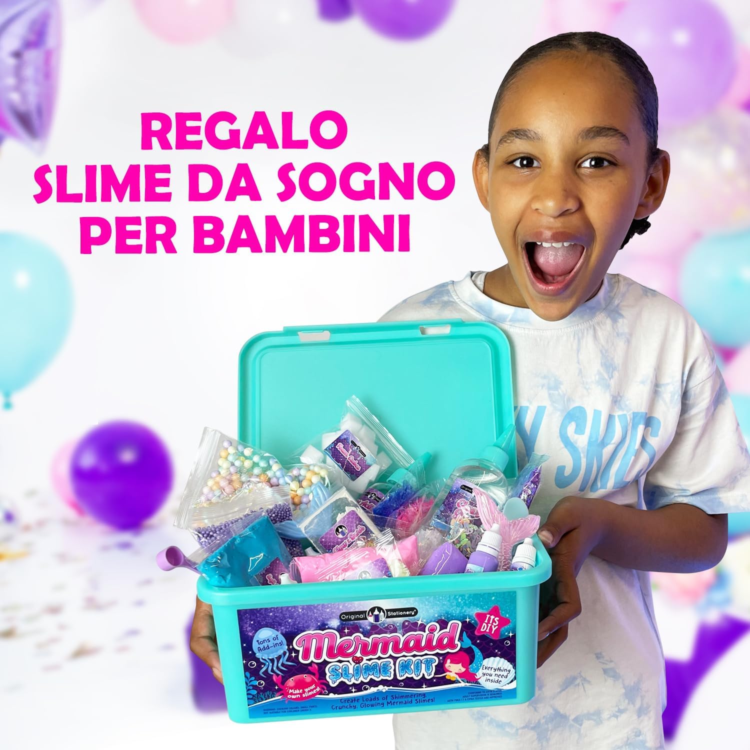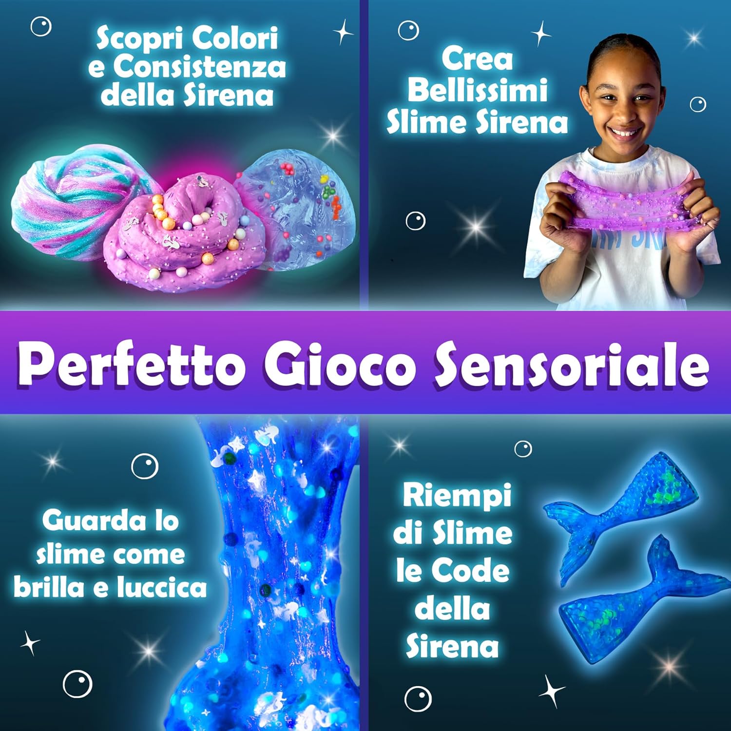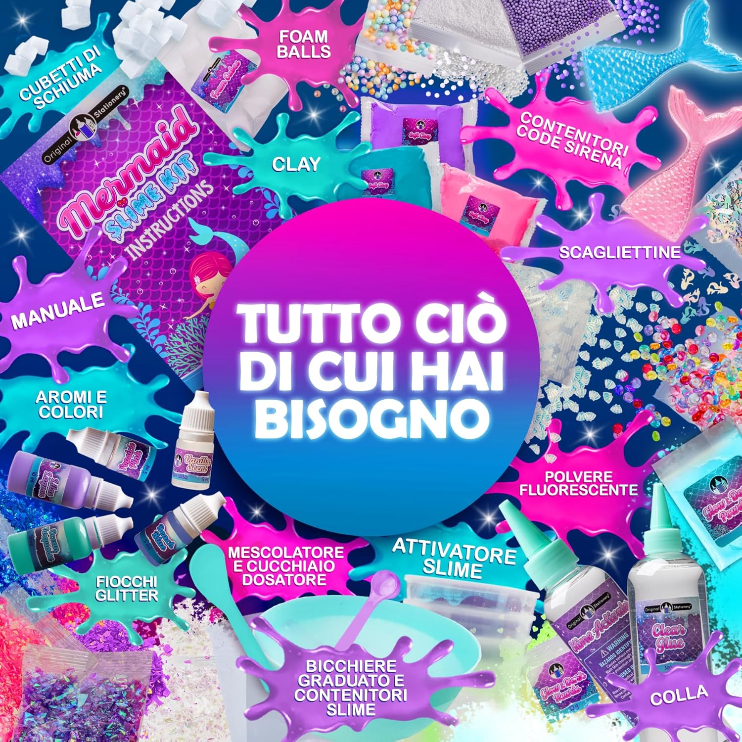 Kit Slime fai da te: scatola piena di tutti gli elementi di cui le ragazze hanno bisogno per realizzare un incredibile Slime di burro, soffice e anche slime marino glow in the dark! Ore di tempo creativo, lontano dagli schermi, con più di 20 accessori nel tuo kit slime fai da te completo e anche contenitori a forma di coda di sirena per riporre il tuo slime. Non dovrai acquistare nient'altro, il tuo laboratorio slime viene fornito con una ciotola per mescolare, contenitori per la conservazione, mescolatore, bicchiere graduato, cucchiaio, attivatore per slime e colla. Slime Fluffy di sirena, facile da riporre nei pratici contenitori ermetici, così i bambini possono giocare con il loro kit di slime il giorno successivo. Bellissimi giocattoli da sirena per ragazze e il miglior kit di slime, ottimo regalo per compleanno per ragazze da 10 a 12 anni.