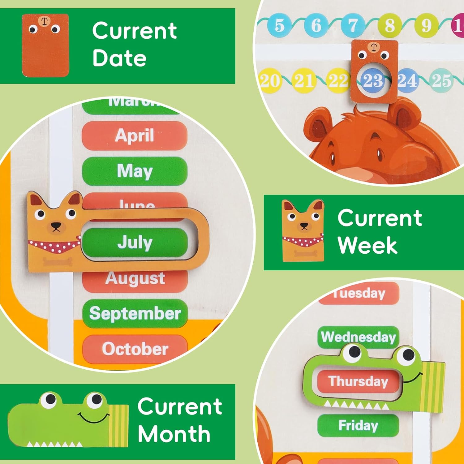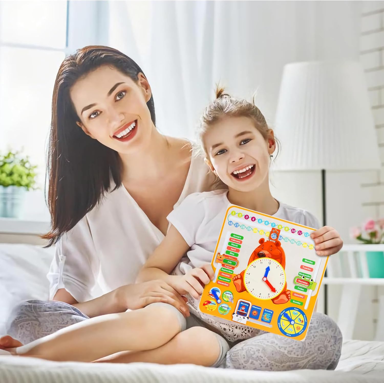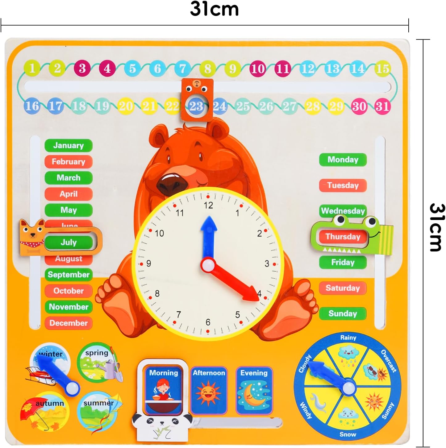 Strumento di Apprendimento Multifunzionale: Integra sette funzioni cognitive, tra cui quattro stagioni, tre periodi del giorno, la data, il tempo, ecc. Aiuta i bambini a imparare l'ora, i mesi e le cose comuni della vita quotidiana divertendosi. Interattivo: Include un piccolo calendario che può scorrere e una lancetta meteo che può essere ruotata, migliorando così l'abilità manuale e l'esperienza interattiva del bambino e rendendo l'apprendimento più divertente. Materiale sicuro ed ecologico: realizzato in compensato di teak addensato con taglio preciso e senza bave per garantire la sicurezza del bambino durante il gioco. Colorato e non facile da perdere, dura a lungo. Design accurato della staffa: staffa in legno gratuita, angolo ragionevole, facile per il bambino osservare l'ora e la data, sia per giocare che per guardare, è una buona scelta per i genitori per coltivare il concetto di tempo dei bambini. Gran regalo: questo eccellente giocattolo Montessori, con dimensioni di 30*30*2cm, è un grande regalo per i piccoli studenti. È molto adatto per i bambini che seguono la filosofia educativa Montessori, o come regalo di laurea per la scuola materna, premio per l'asilo nido, ausili didattici per la classe o sorpresa per il compleanno dei bambini.