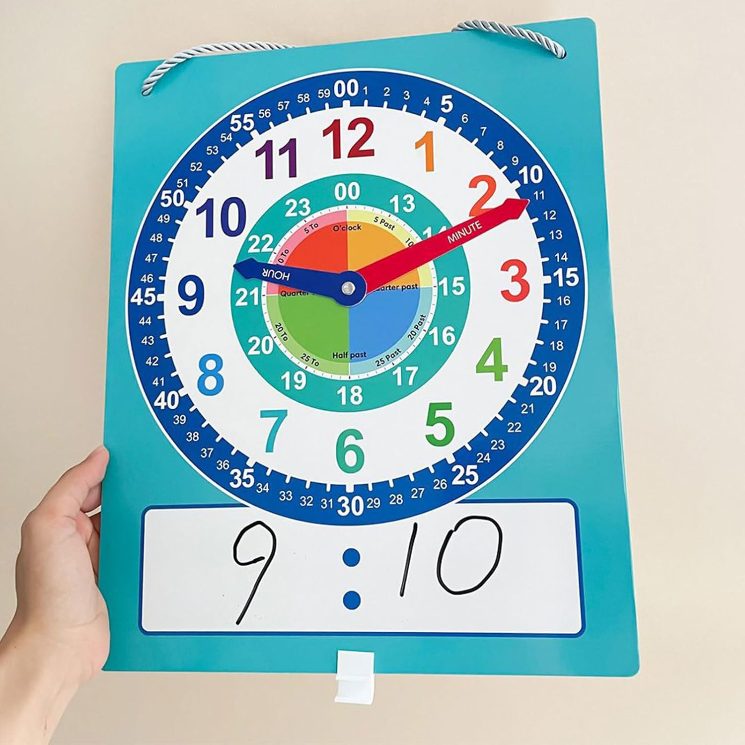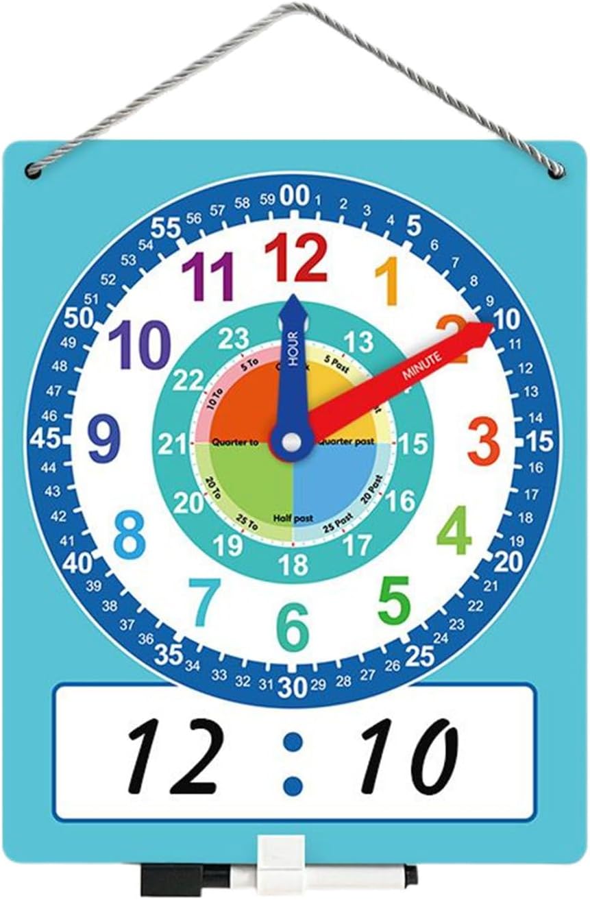Robusto strumento di apprendimento: con una robusta struttura in cartone, questo orologio di apprendimento è progettato per sospendere e incoraggiare l'impegno attivo per lo sviluppo delle abilità di percezione precoce Doppio lato ed efficiente: Aumenta lo studio collaborativo con un display fronte/retro e una pratica tabella di riferimento per la pratica della lettura del tempo. Visualizzabile da diverse angolazioni, favorendo un apprendimento efficiente Diverse applicazioni: stimola metodi innovativi per l'educazione del tempo, ispira strategie di apprendimento dinamico, supporta gli educatori nel coinvolgere efficacemente gli studenti Migliora la percezione del tempo: vengono illustrate una varietà di quadranti e rappresentazioni dell'ora, supportate da una guida visiva per una più facile comprensione e una maggiore efficacia di apprendimento Promuove la comprensione del tempo: design divertente e coinvolgente dell'orologio, completo di ore, minuti e secondi chiaramente contrassegnati, aiuta i bambini a cogliere efficacemente le sfumature del tempo