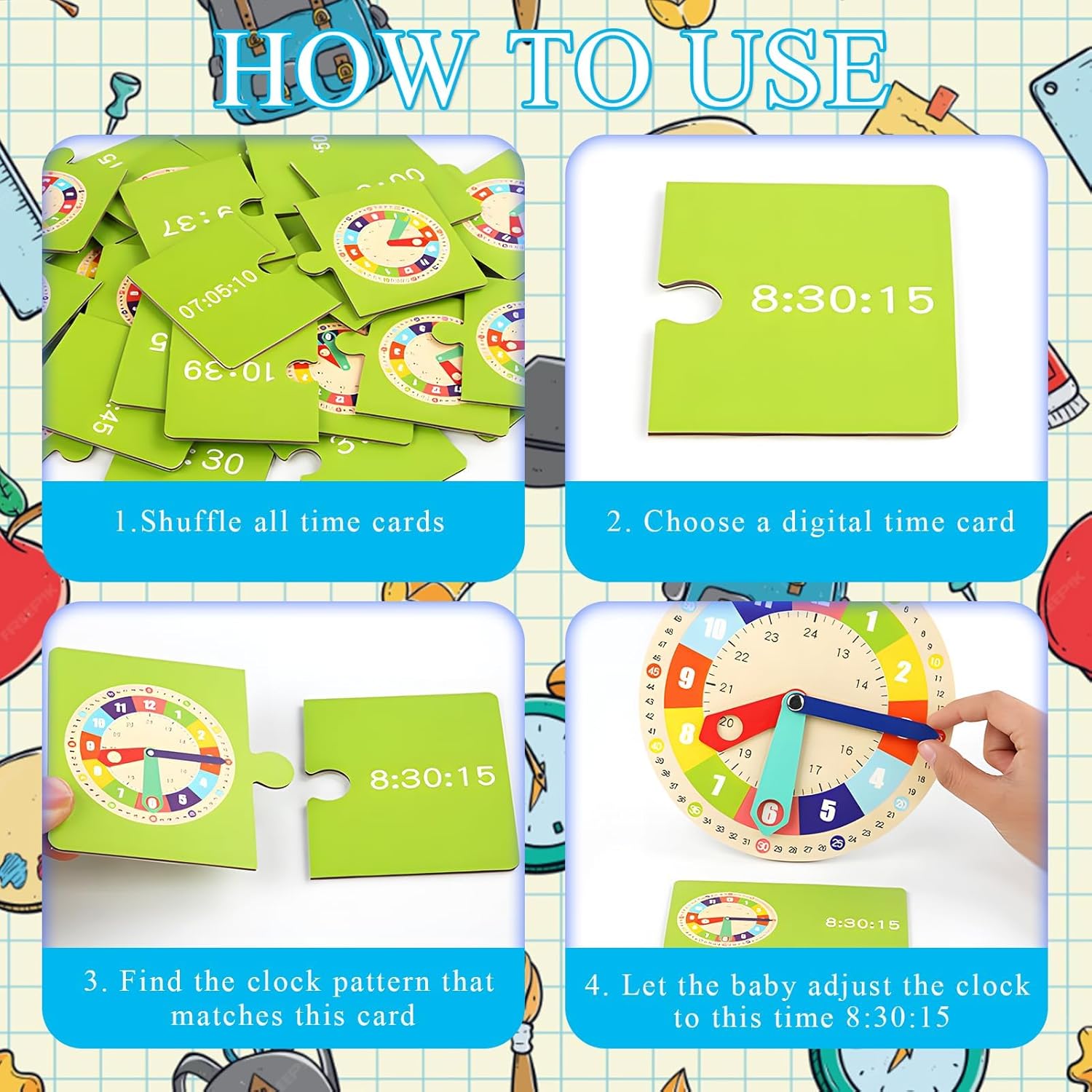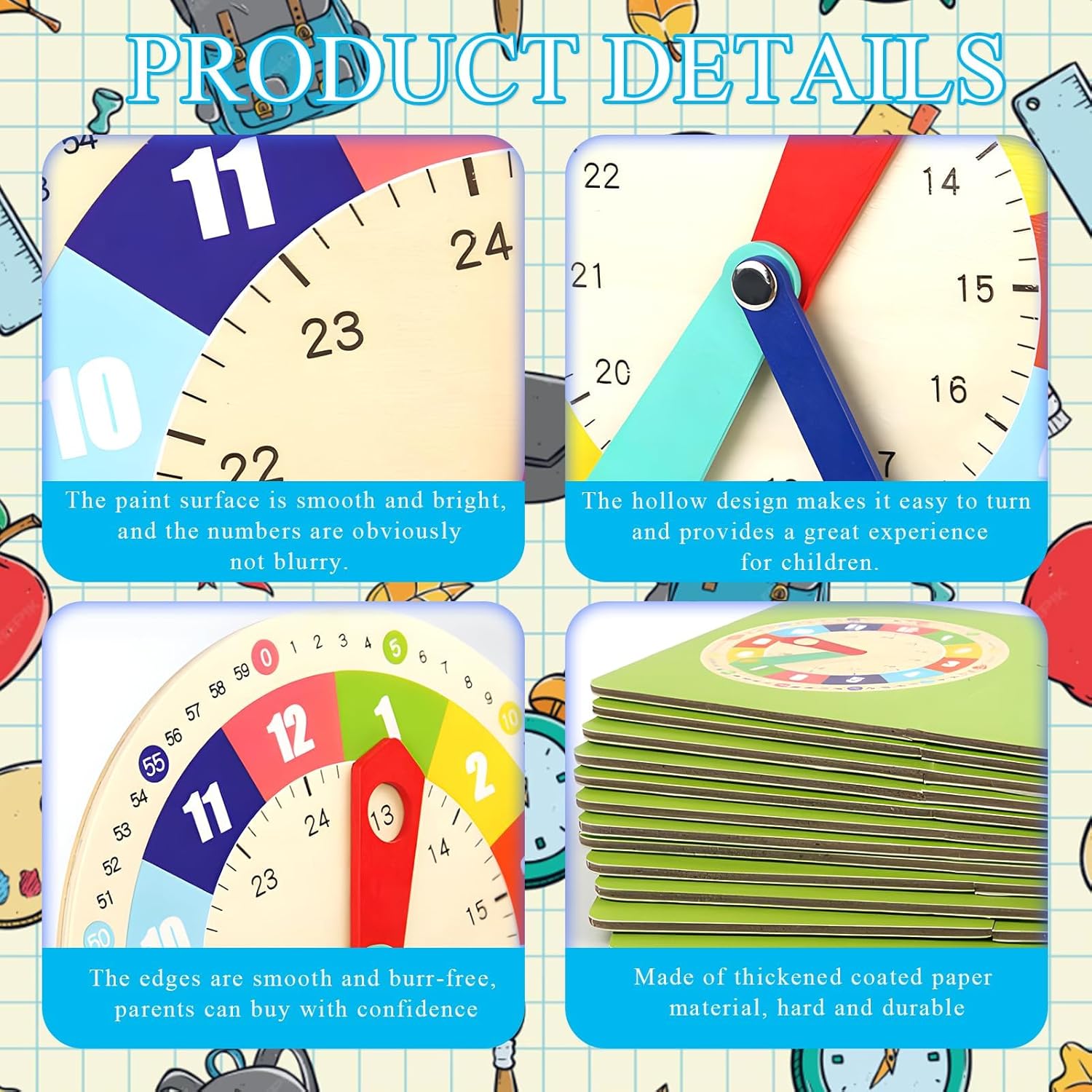 【Orologio Calendario per Bambini】Il prodotto include un orologio in legno, un supporto e 15 carte fronte-retro. L'orologio didattico per bambini ha lancette mobili delle ore, dei minuti e dei secondi che possono essere regolate in base all'ora segnata sulla carta. Con questo orologio calendario, tuo figlio imparerà facilmente tutte le informazioni sull'ora. 【Dimensioni】La dimensione dell'orologio didattico in legno per bambini è 17,5 * 17,5 cm, la dimensione del supporto è 7,3 * 4,3 cm e la dimensione della carta è 12,5 * 7,5 cm. È molto adatta per i bambini di età superiore a 3 anni da utilizzare durante l'apprendimento tempo. Non solo porta divertimento ai bambini, ma promuove anche la flessibilità, la concentrazione e le capacità di pensiero logico 【MATERIALE DI ALTA QUALITÀ】L'orologio didattico per bambini è realizzato in legno naturale di alta qualità senza scheggiature o spigoli vivi, la superficie della vernice è liscia e luminosa e i numeri ovviamente non sono sfocati. I cartellini fronte-retro sono realizzati in carta patinata spessa, che li rende robusti e durevoli in modo che i tuoi bambini possano giocarci senza preoccupazioni. 【Sviluppo Intellettuale】I bambini possono spostare la lancetta delle ore, dei minuti e dei secondi attraverso il tempo segnato sulla carta, imparando in modo interessante per aiutare i bambini ad apprendere facilmente la conoscenza del tempo e dei numeri, il che favorisce l'educazione precoce delle abilità di cronometraggio di base. 【Regalo Perfetto】Questo giocattolo Montessori in legno è molto dettagliato e colorato nel design, che può attirare l'attenzione dei bambini. È un regalo ideale per ragazzi e ragazze, i bambini lo adoreranno.