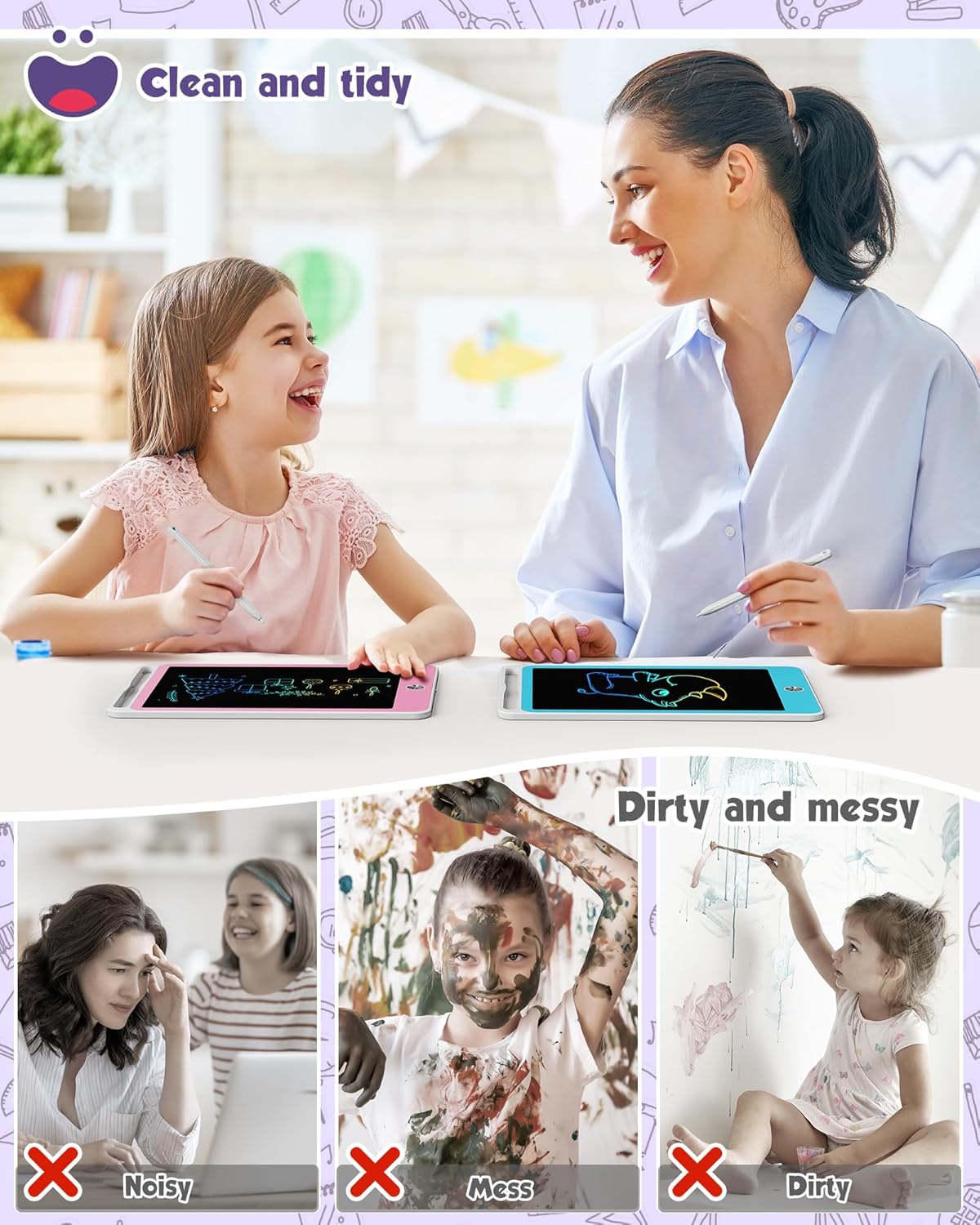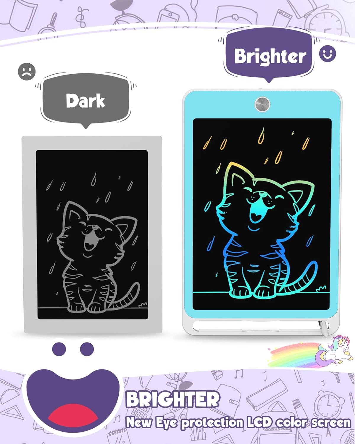 【Giocattolo da scrittura da 2 pezzi da 8,5 pollici】 Tavoletta da disegno per bambini 3 4 5 6 7 Giocattoli educativi per ragazzi e ragazze di 8 anni. Può imparare, scrivere, disegnare, prendere appunti e memorizzare cose. I bambini non discutono più sui giocattoli. Regalo di compleanno perfetto, Pasqua, Festa dei bambini, Natale, rientro a scuola, regalo di Capodanno. Design per la protezione degli occhi, dipingi il mondo dell'infanzia di tuo figlio e il miglior giocattolo educativo che ogni bambino dovrebbe avere. 8,5 pollici Può essere trasportato nello zaino della scuola, può essere utilizzato anche quando si viaggia all'aperto in qualsiasi momento.,Design del pulsante di cancellazione, più facile da usare: un pulsante del tablet magico per bambini cancella e blocca lo schermo. La batteria integrata può cancellare 100.000 volte, come un pezzo di carta infinito e dire addio a polvere e inchiostro. Il tablet perfetto per bambini per giocattoli dai 3 anni in su.,Design con cordino per penna: non c'è bisogno di cercare una penna ovunque, premi diversi spessori per disegnare linee di diverso spessore, un buon assistente per lasciare messaggi e ricordare cose. Tieni il tuo bambino occupato in aereo, in macchina, a scuola AVVERTENZA - PERICOLO DI SOFFOCAMENTO - Piccole parti. Non per bambini sotto i 3 anni. Contiene una batteria a bottone o una batteria a cella piatta. Pericoloso se ingerito – Vedi