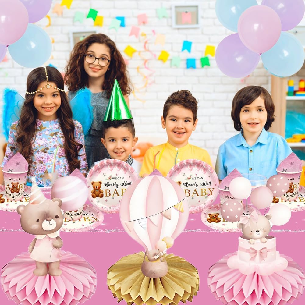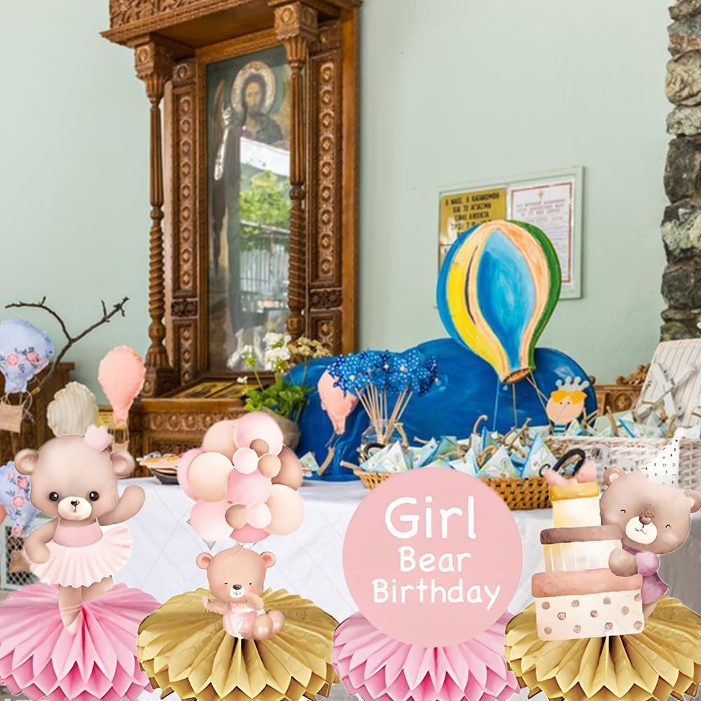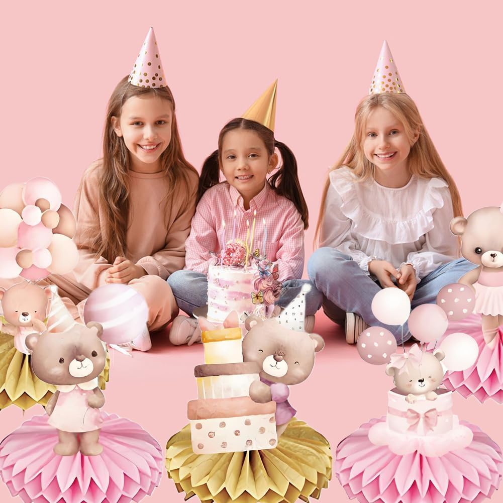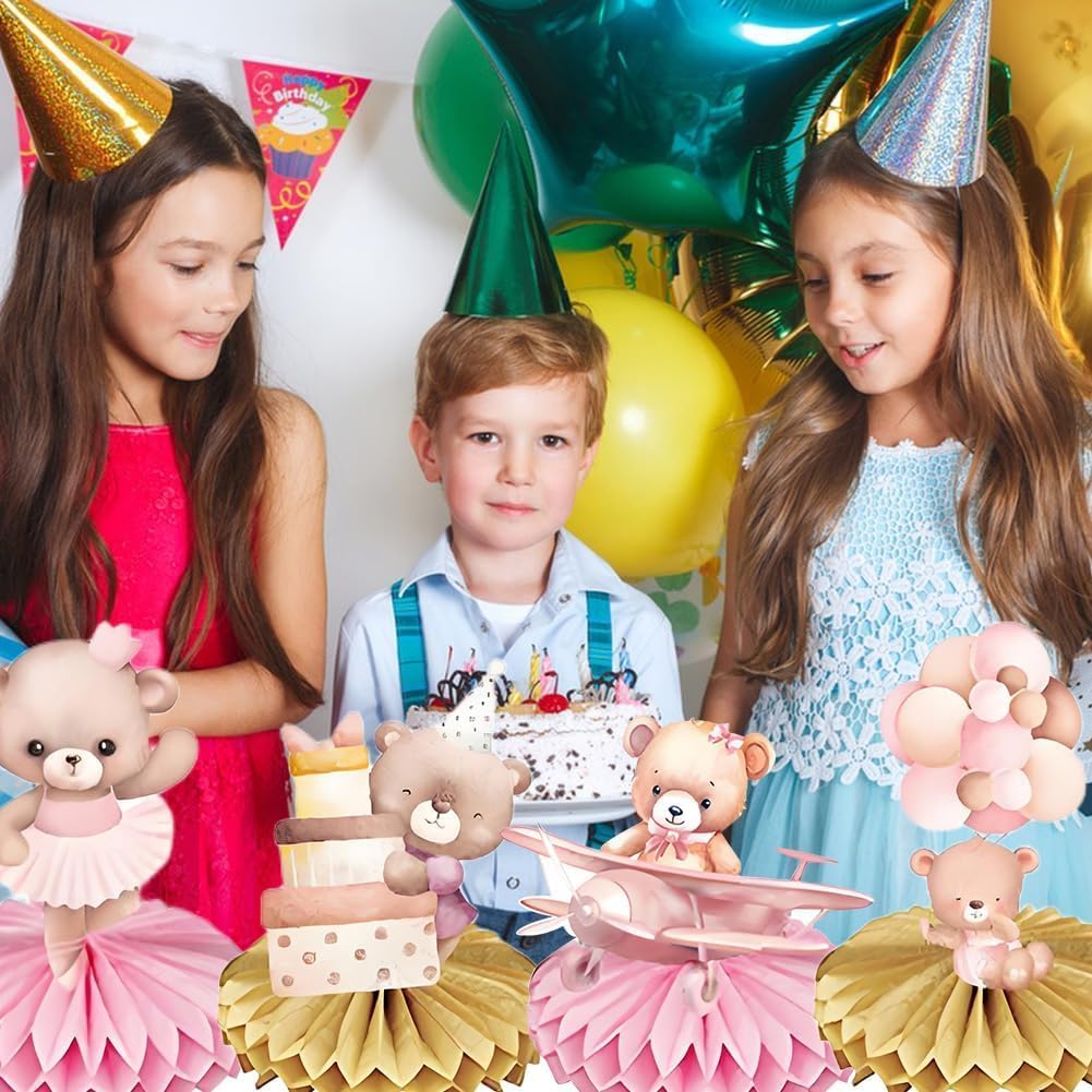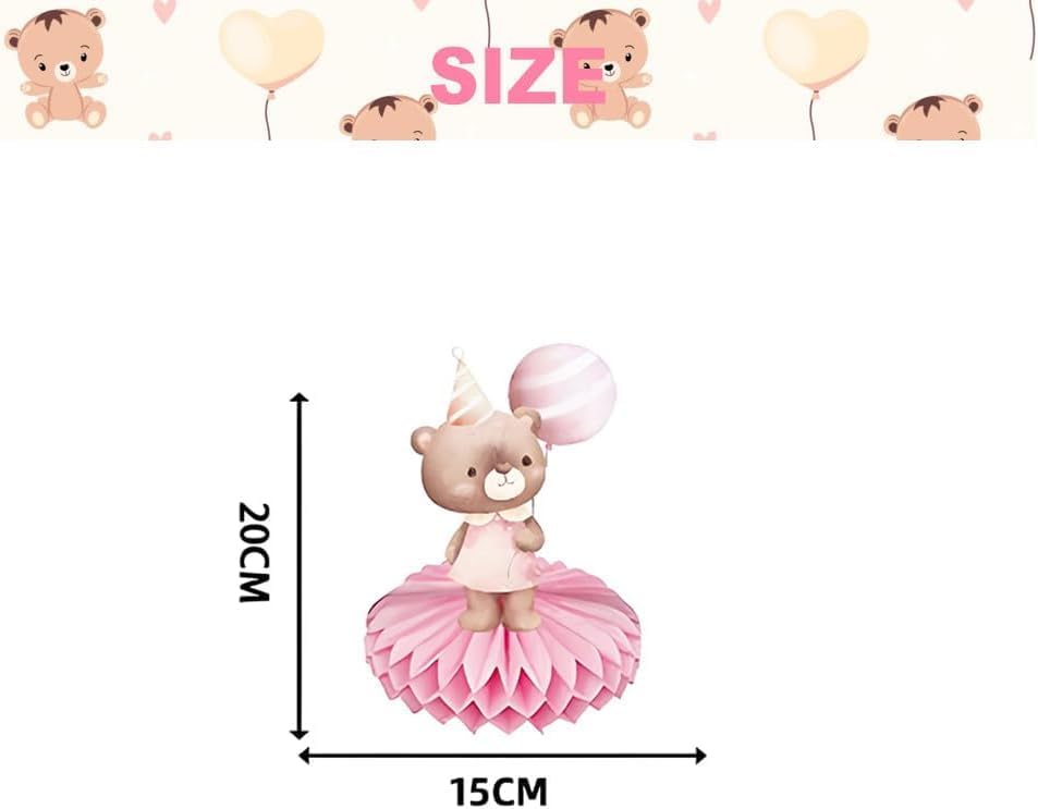 Ornamento a nido d'ape con orso rosa. Riceverai 9 decorazioni per feste a tema orso. Quantità sufficiente e stili ricchi soddisfano le vostre esigenze di decorazione quotidiana della vostra festa a tema. Materiale premium: gli ornamenti a nido d'ape sono realizzati in carta di alta qualità con stampa a colori vivaci e attireranno sicuramente l'attenzione degli ospiti della festa. Facile da installare: prima staccare l'adesivo della palla a nido d'ape, attaccare la palla a nido d'ape sull'area fissa della carta, ripetere il passaggio successivo sull'altro lato della carta e infine posizionarla sul tavolo. Il miglior regalo per le feste: il set di decorazioni a tema orso rosa è sufficiente per offrire gli accessori necessari e portare i vostri ospiti in un'esperienza indimenticabile per rendere felici le persone. Ampia applicazione: il centrotavola rosa per feste di compleanno, baby shower, feste di pianoforte, feste di canto, riunioni di famiglia, ecc.