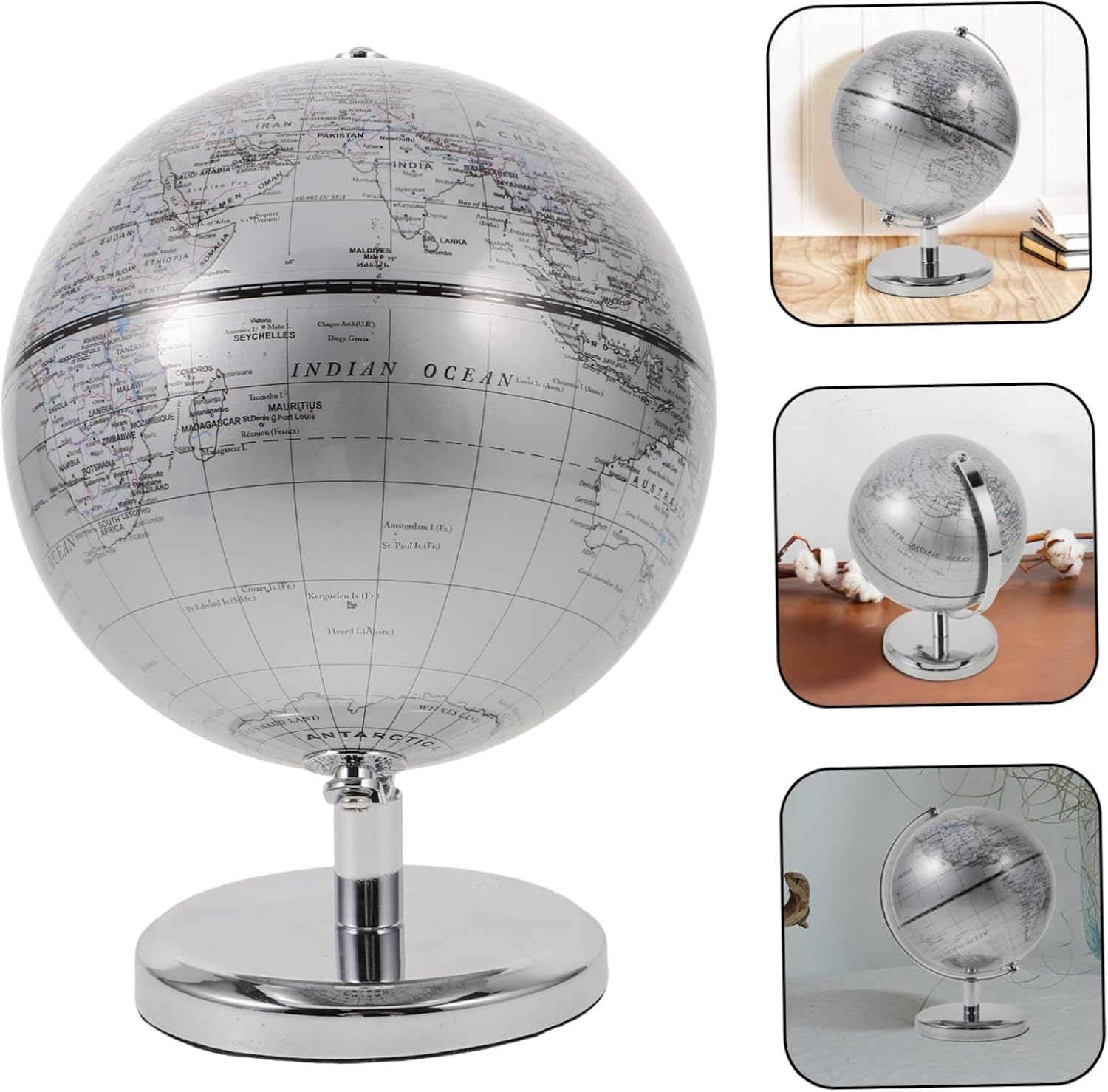 Estetica : il globo argentato aggiunge un tocco moderno e sofisticato a qualsiasi ufficio o domestico, globo terrestre per insegnanti, decorazione a forma di sfera di Globo con sfera di plastica: questo globo è un eccellente strumento educativo, che ti aiuta a conoscere vari paesi e le loro posizioni geografiche, globo terrestre di plastica Globo con mappa didattica: la finitura argentata elegante e contemporanea di questo globo perfettamente con l'estetica degli interni moderni, aggiungendo un tocco di raffinatezza a qualsiasi stanza, globo da scrivania per ufficio Design contemporaneo: la finitura argentata di questo globo offre un aspetto contemporaneo che adatta bene all'arredamento moderno, ornamento rotondo della , globo educativo per Mappa del globo terrestre: realizzato con materiali in pp, questo globo è costruito per durare, offrendo una durevolezza eccezionale e una sensazione che la prova del tempo, globo geografico per