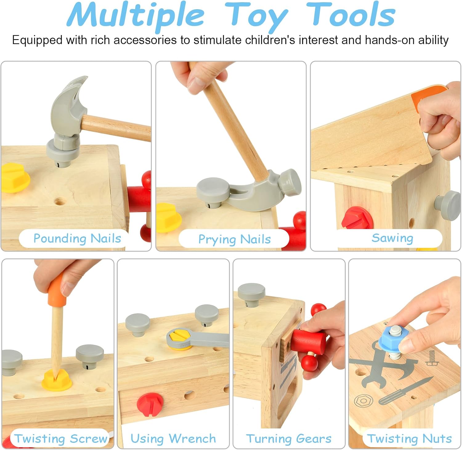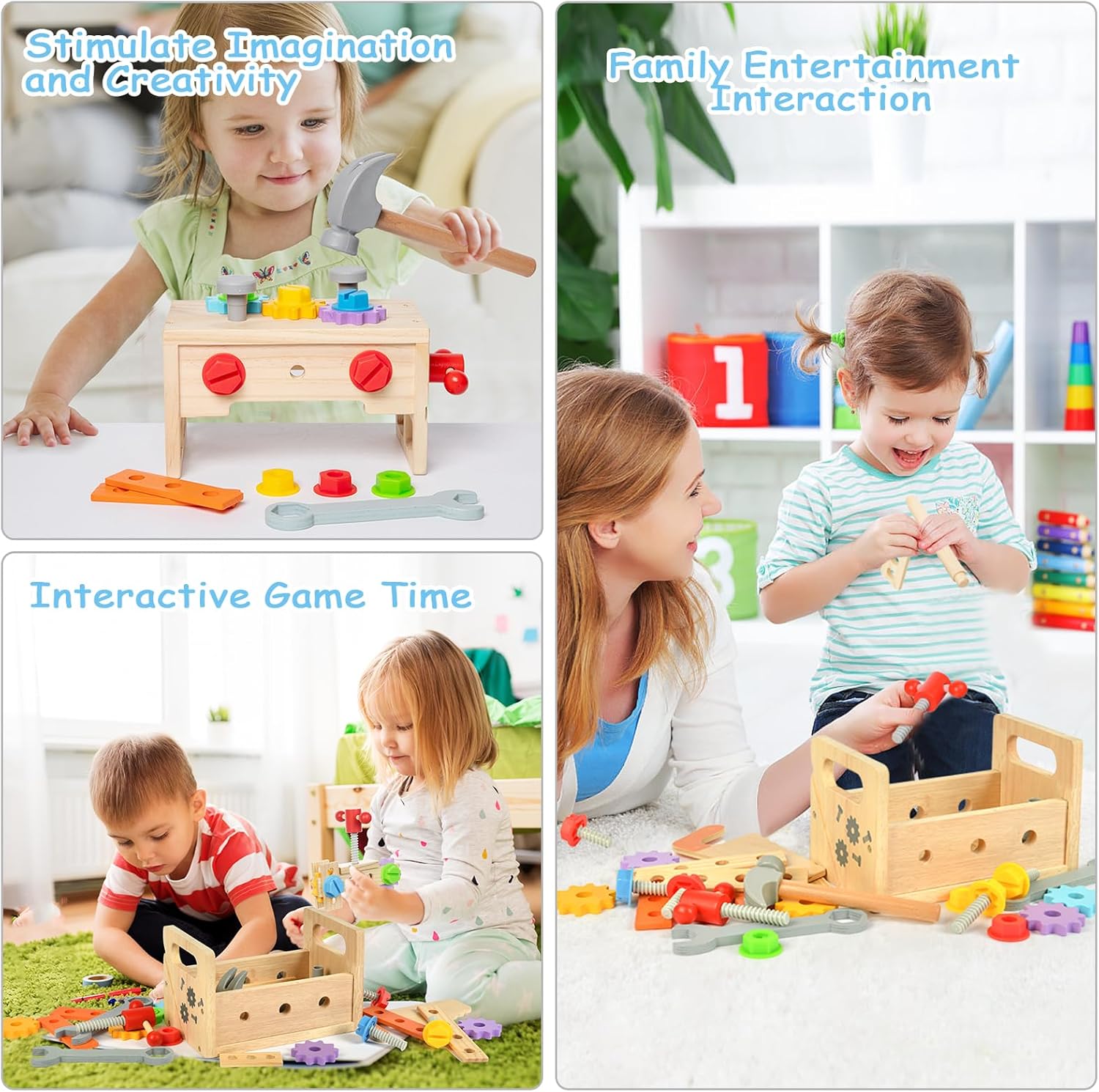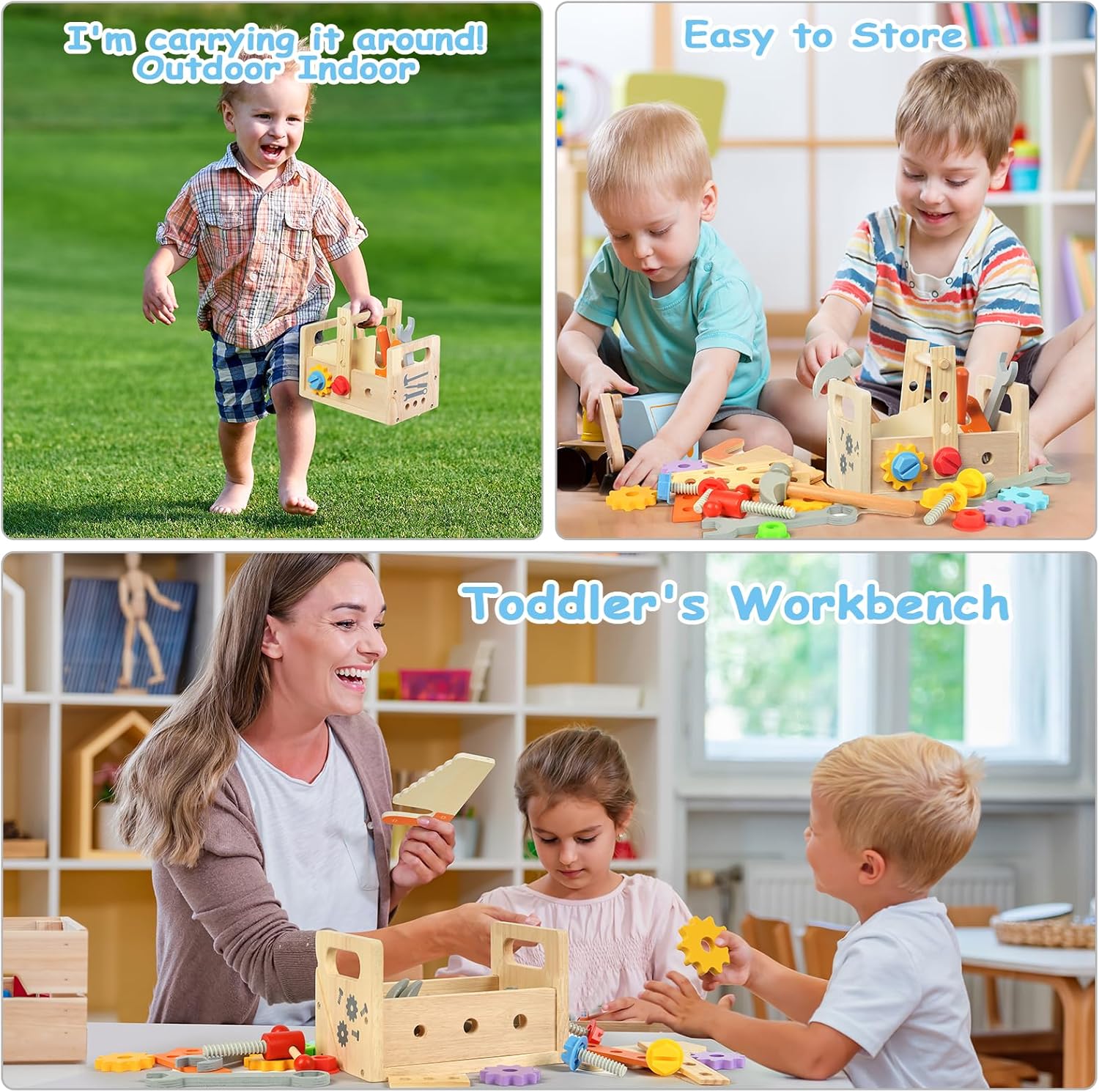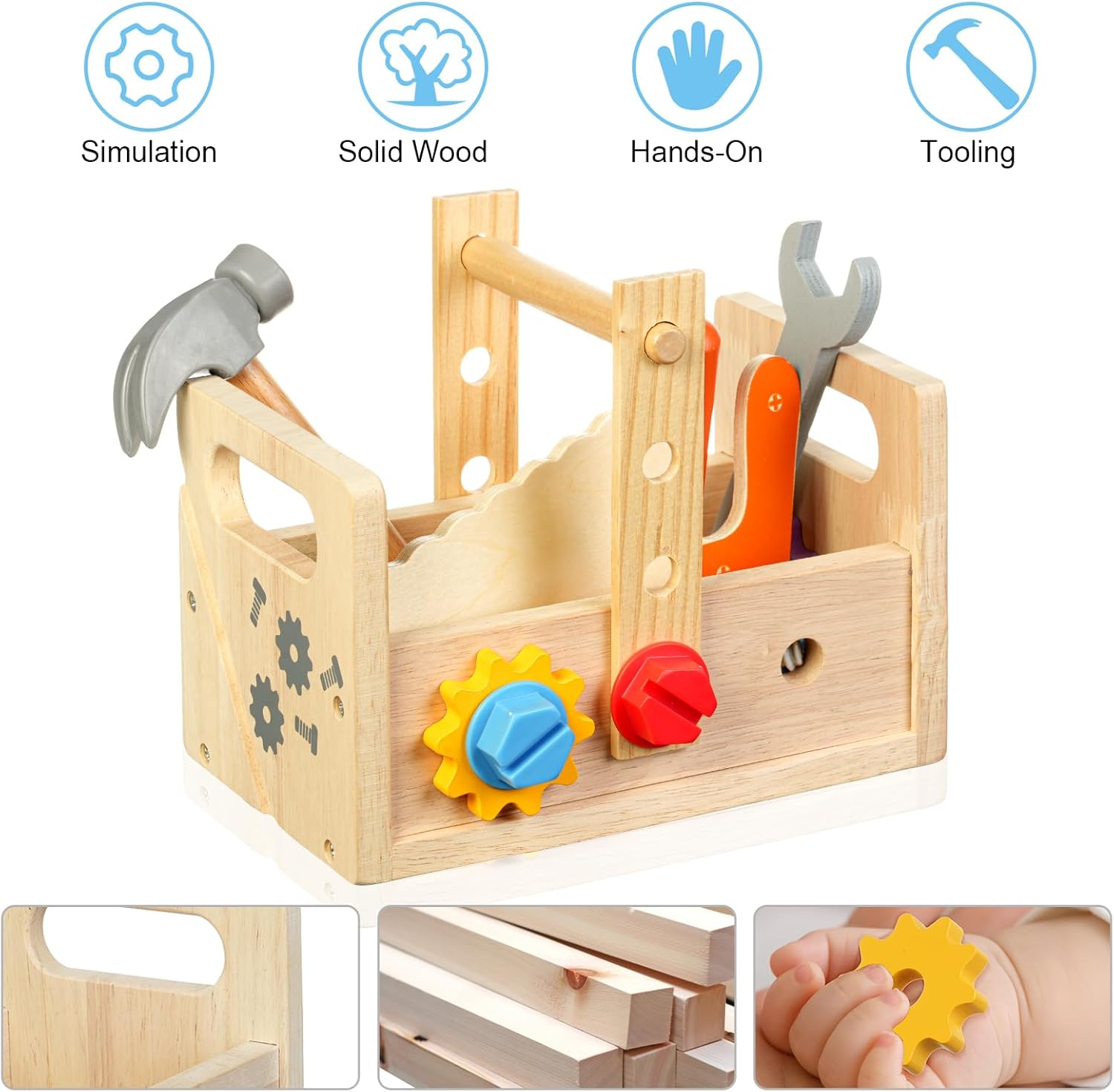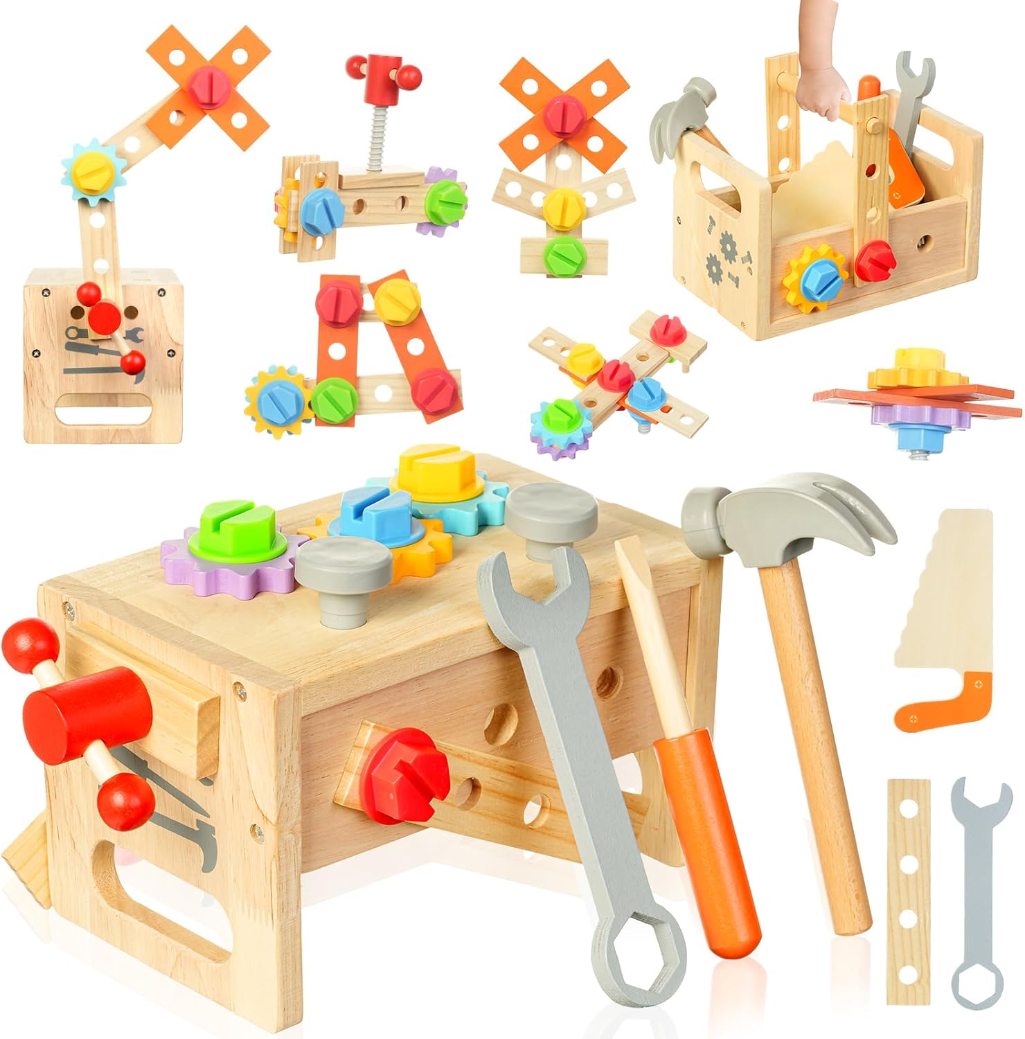 🗜【GIOCATTOLI IN LEGNO PER BAMBINI】La nostra cassetta degli attrezzi per bambini contiene banco da lavoro in legno, cacciavite, martello, sega per legno, chiave inglese, maniglia, blocco di legno, ingranaggio, vite, chiodo, dado esagonale e altri piccoli accessori. Il tuo piccolo si divertirà con i giochi di ruolo con questi strumenti in legno 🪓【GIOCATTOLI IN LEGNO SICURI E DI ALTA QUALITÀ】Giocattoli per bambini Gli strumenti giocattolo Montessori sono realizzati in legno massello di alta qualità, angoli arrotondati a 360° senza sbavature, adatti ai bambini, possono resistere all'uso e al gioco a lungo termine, hanno un aspetto bello e colorato, sensazione tattile comoda e sicura, particolarmente adatta come regalo per ragazzi e ragazze di età compresa tra 2 3 4 5 6 anni 🛠【SCATOLA ATTREZZI IN LEGNO 3-IN-1 FAI DA TE】 Il set di attrezzi per bambini è facile da montare e smontare, è un perfetto giocattolo educativo fai-da-te che può essere utilizzato come tavolo per attrezzi per bambini, scatola di immagazzinaggio, con la maniglia rivolta verso l'alto, può essere considerato come un contenitore per bambini che può essere facilmente trasportato ovunque; capovolgilo e diventa uno sgabello da lavoro su cui i bambini possono creare e posizionare gli strumenti 🔩【SVILUPPARE ABILITÀ E AUMENTARE L'INTERAZIONE】 I bambini possono imparare a usare un cacciavite per girare viti, martellare chiodi, usare chiavi inglesi, segare legno e giocare con gli ingranaggi attraverso il set di strumenti. Possono dare pieno gioco alla loro immaginazione, esercitare la coordinazione occhio-mano e ampliare il loro pensiero. Anche i genitori possono giocarci. I bambini realizzano insieme giocattoli di legno per migliorare i sentimenti 🧰【REGALO PERFETTO PER I BAMBINI】La cassetta degli attrezzi Montessori in legno è un regalo eccellente per i bambini dai 3 agli 8 anni. Il set di strumenti in legno per bambini ha un significato educativo, migliora l'abilità pratica dei bambini ed è molto favorevole alla crescita dei bambini. Un regalo perfetto per i bambini nel giorno dei bambini, compleanni, Halloween, Natale e altre festività