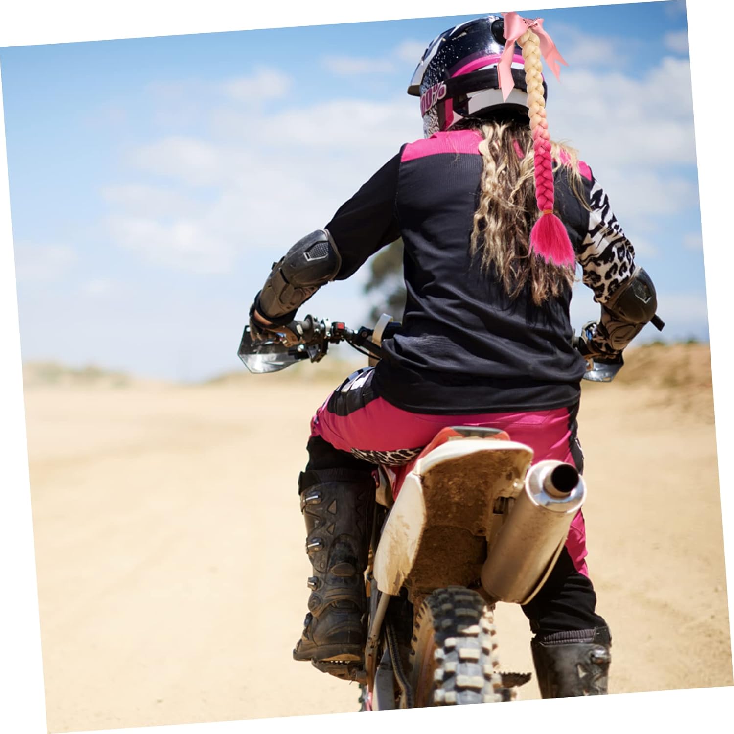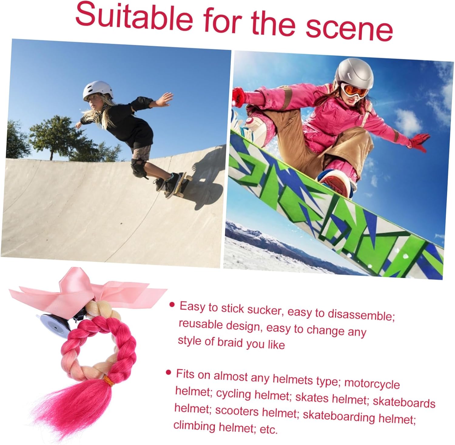 dei pacchetti 1 decorazione per casco Caratteristiche - Dimensioni: circa 58x5x5 cm/treccia del casco 22,79x1,97x1,97 pollici. - Materiale: seta in fibra chimica ad alta temperatura, ABS, decorazione in treccia di PU per casco. - Design a ventosa, un metodo di installazione semplice e facile per l'ornamento del casco. - Realizzato in materiale di , sicuro, inodore e durevole come accessorio decorativo per casco. - Adatto alla maggior dei caschi, unisex, perfetto per ornamento a treccia per casco da donna, uomo, ragazza, ragazzo e bambino. - Delizioso design a forma di treccia, dimensioni ridotte, colore brillante, che lo rendono un ornamento per casco speciale e attraente. - Decorazione unica per casco, mostra la decalcomania con la treccia del tuo casco. Descrizione della merce Decorazione a treccia per casco Non cade facilmente. Adesivo per casco C'è una ventosa che può essere attaccata a qualsiasi superficie liscia, adatta per la decorazione del casco. Decorazione a treccia per casco La nostra adorabile decorazione per parrucca a treccia è di piccole dimensioni, facile da trasportare e non cade facilmente. Decorazione per casco Realizzata con materiali molto resistenti e durevoli. Parrucca a treccia per casco Questo è un adorabile lavoretto decorativo