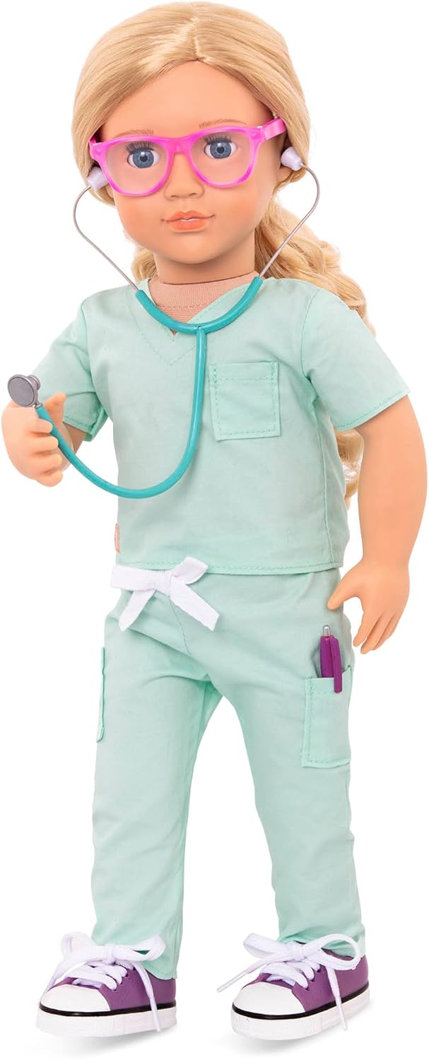 Scopri questo costume medico Deluxe della marca Our Generation Include un set completo di vestiti: un costume da chirurgo, occhiali e un paio di scarpe da ginnastica Include anche accessori medici: stetoscopio, raccoglitore medico, matita e maschera I vestiti si adattano a polsi di 46 cm Le bambole sono vendute separatamente