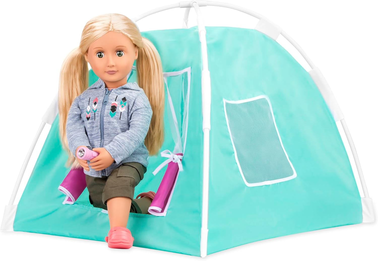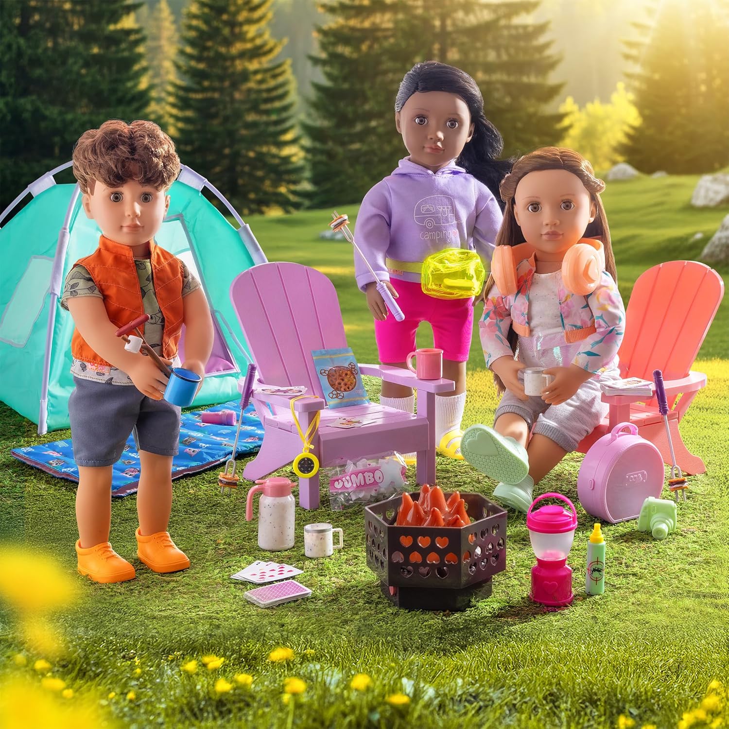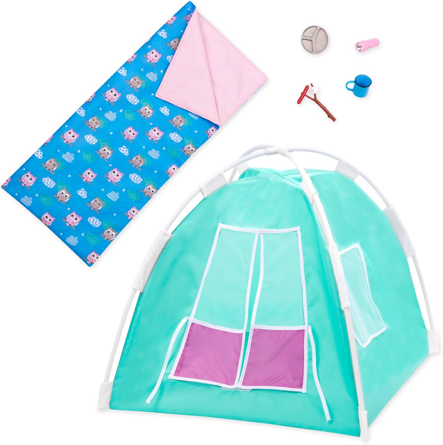 Accessori da campeggio per bambole da 46 cm: invita i tuoi amici a vivere avventure all'aria aperta con il set Happy Camper per bambole Our Generation da 46 cm! Include: tenda, otto pali con cinque attacchi, sacco a pelo, spiedo, piatto, tazza e torcia. Facile da montare: la tenda richiede un assemblaggio minimo; Vengono fornite istruzioni passo passo facili da seguire. Crea le tue composizioni: compatibile con la maggior parte delle bambole da 46 cm e i loro accessori. Età consigliata: questo set è consigliato a partire dai 3 anni (parti piccole).