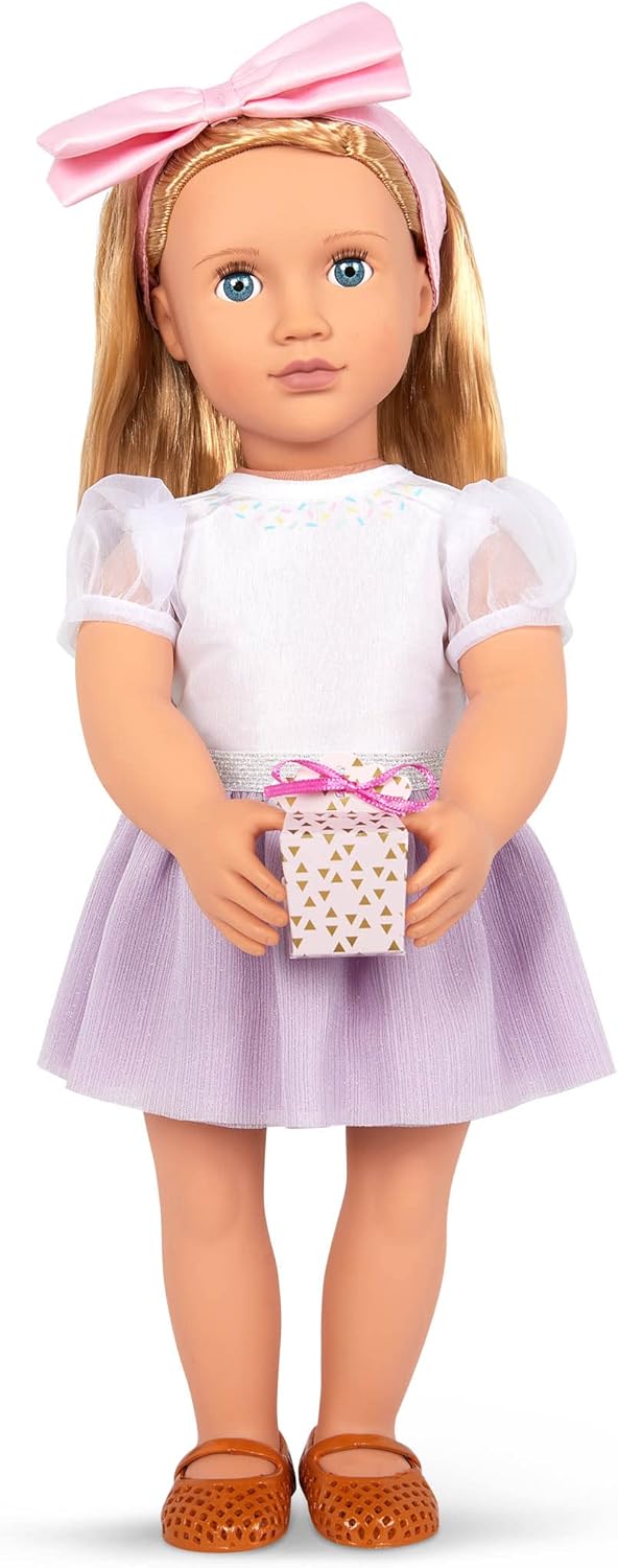 Vestito di compleanno per bambola da 46 cm: festeggia il giorno speciale della tua bambola nel modo più semplice con il vestito Our Generation Sweet Wishes! Funzionalità divertenti: nascondi il cupcake o un oggetto divertente all'interno della confezione regalo e fai una grande sorpresa al tuo migliore amico! Include: un top con paillettes colorate sul colletto, una gonna a pieghe, una fascia per capelli con un grande fiocco, scarpe, un cupcake e una confezione regalo. Mix & Match: il completo è dotato di chiusure facili da aprire per indossarlo e toglierlo rapidamente; compatibile con la maggior parte delle bambole, degli abiti e degli accessori da 46 cm. Età consigliata: per bambini sopra i 3 anni (parti piccole).