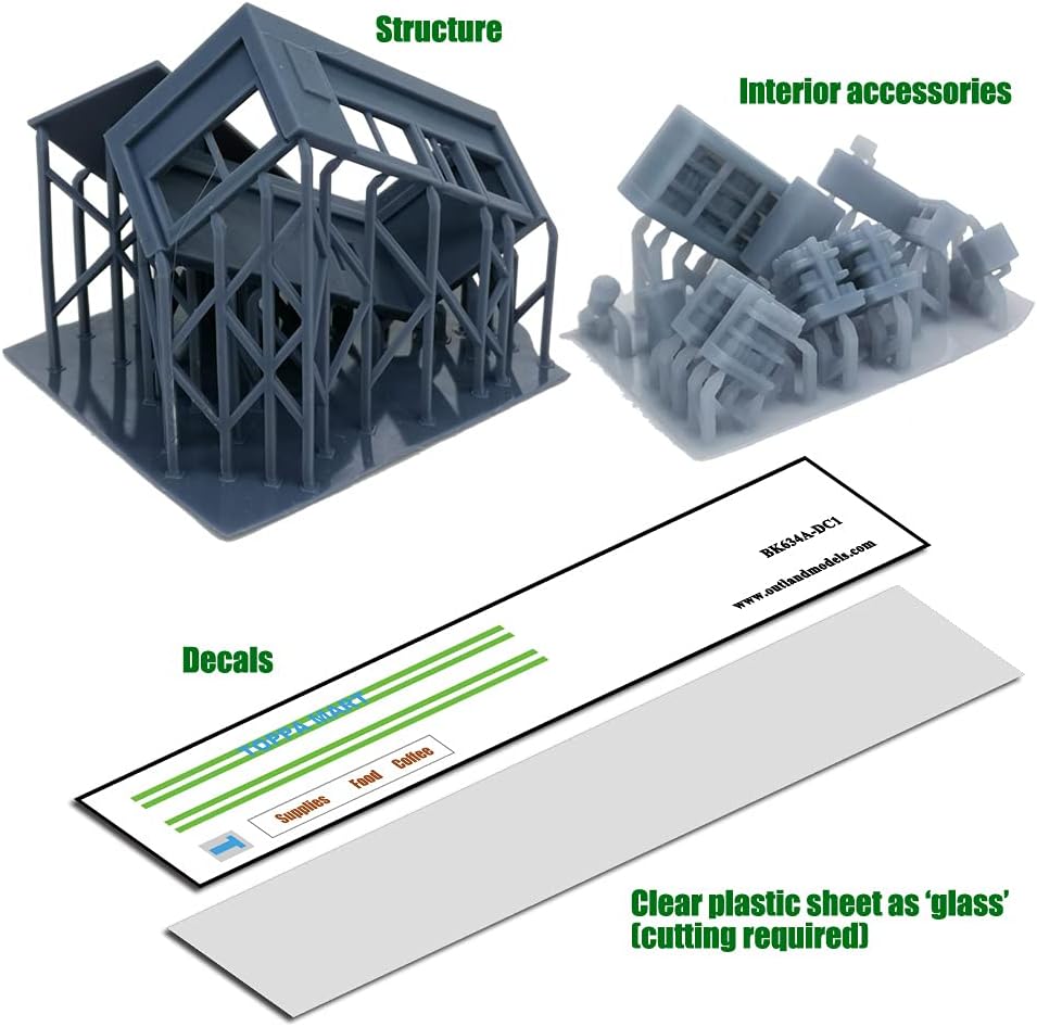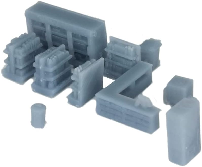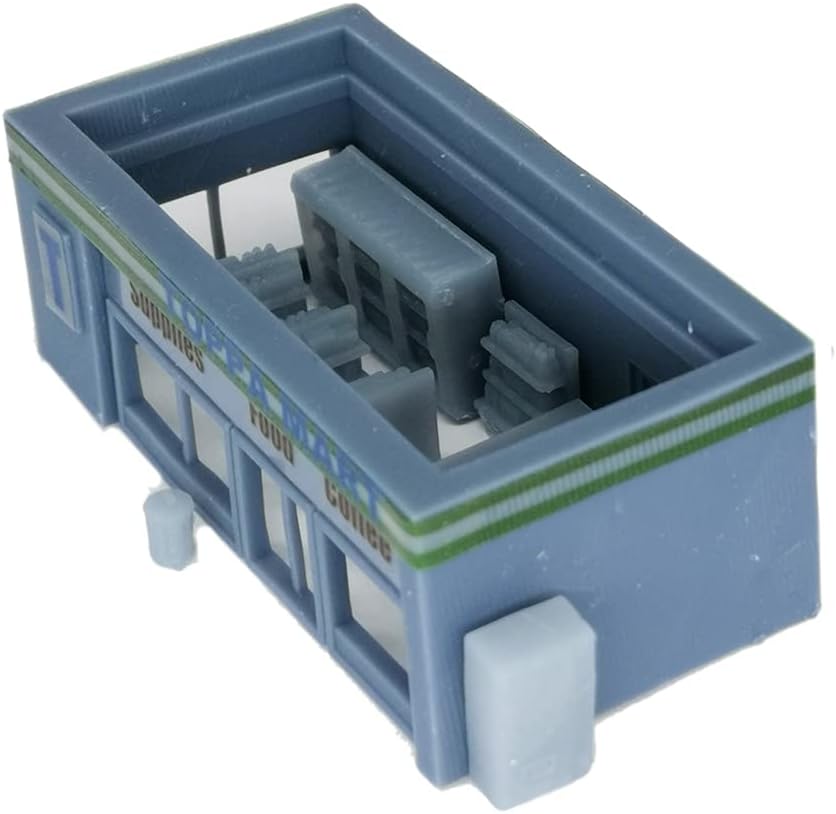 Questo prodotto è creato da una stampante 3D, non è verniciato nel suo colore originale come nella foto, alcune parti potrebbero richiedere il montaggio utilizzando la colla. I motivi di stampa sulla superficie potrebbero essere visibili se si guarda attentamente. Per motivi tecnici e sicuri di trasporto, alcune parti possono avere un foglio molto sottile sotto di esso o una struttura di supporto che si collega ad esso in alcuni punti (si prega di controllare l'ultima immagine), potrebbe essere necessario rimuovere il prodotto con una fresa (come si rimuovono le parti da una canna in un kit modello). Materiali: resina, Scala: Z Scala/1:220, Dimensioni: 52mm x 26mm x 19mm (H) Questo kit include: costruzione di minimarket, tutti i dettagli accessori come nella foto, un foglio adesivo (taglio richiesto), un foglio di plastica trasparente (usato come 'vetro', taglio richiesto)