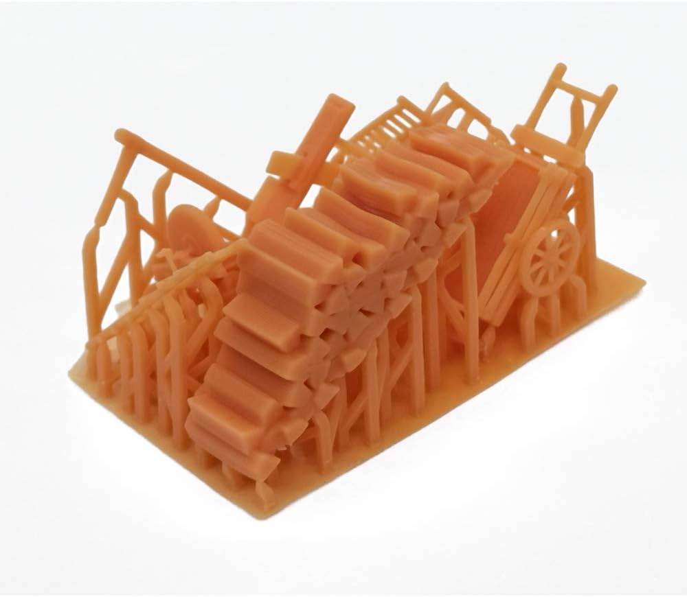 Questo prodotto è stato creato da una stampante 3D, questo prodotto non è verniciato nel suo colore originale come nella foto. Per motivi tecnici e di sicurezza il prodotto può essere dotato di una lamiera sottostante molto sottile o di una struttura di sostegno che si collega in alcuni punti (vedi ultima foto). Potrebbe essere necessario rimuovere il prodotto con un taglierino (proprio come rimuovi le parti da una molla in un kit modello). Questo articolo include: carro, scala, panca, colonna di tronchi, abbeveratoio, pietra per affilare, banco da falegnameria, rullo di fieno, palo di aggancio. Materiale: resina. Scala: scala HO/1:87.