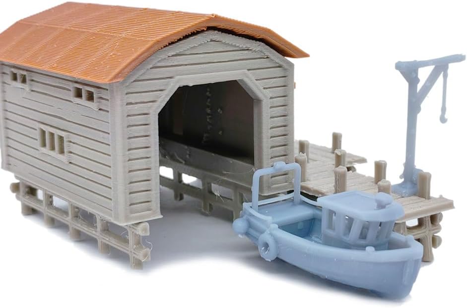 Questo prodotto è realizzato con stampante 3D, non è verniciato nel colore originale come in foto, alcune parti potrebbero richiedere il montaggio tramite colla. I motivi di stampa sulla superficie possono essere visibili se li guardi attentamente. Per ragioni tecniche e di sicurezza del trasporto, alcuni particolari potrebbero essere consegnati con una lamiera sottostante molto sottile o con una struttura di sostegno che si collega ad essa in determinati punti (controllare l'ultima immagine). Potrebbe essere necessario rimuovere il prodotto con un taglierino (come quando si rimuovono le parti da un canale di colata in un kit modello). Materiali: Resina e PLA, Scala: N/1:160 Dimensioni scala: Casa: 102 mm x 86 mm x 54,50 mm (A), Barca da pesca: 48,50 mm x 24,50 mm x 24,50 mm (A), Barca da carico: 54 mm x 23,50 mm x 9,50 mm (A)