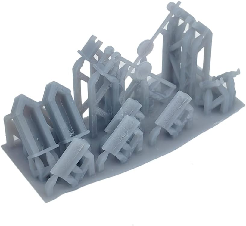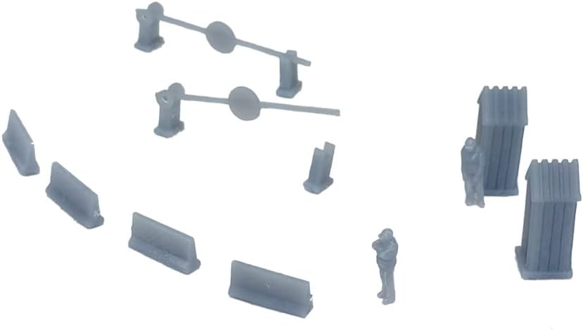 Questo prodotto è realizzato da una stampante 3D. Non è dipinto nel colore originale mostrato. Alcune parti potrebbero richiedere assemblaggio con la colla. Se guardati con attenzione, i motivi stampati possono essere visibili sulla superficie. Per motivi tecnici e sicuri per il trasporto, alcune parti possono essere dotate di una lamiera molto sottile sottostante o di una struttura di supporto collegata in alcuni punti (vedi ultima immagine). Potrebbe essere necessario rimuovere il prodotto con un taglierino (proprio come si rimuovono le parti da una ghisa in un kit modello). Materiale: resina, traccia: Z traccia / 1:220 Questo articolo include: 2 barriere d'ingresso, 2 capanni piccoli, 4 blocchi stradali, 2 guardie di sicurezza