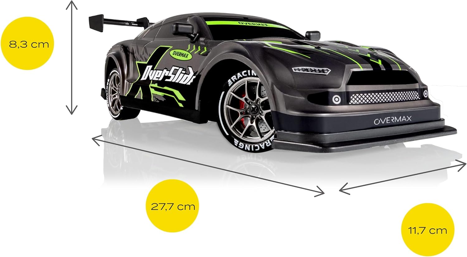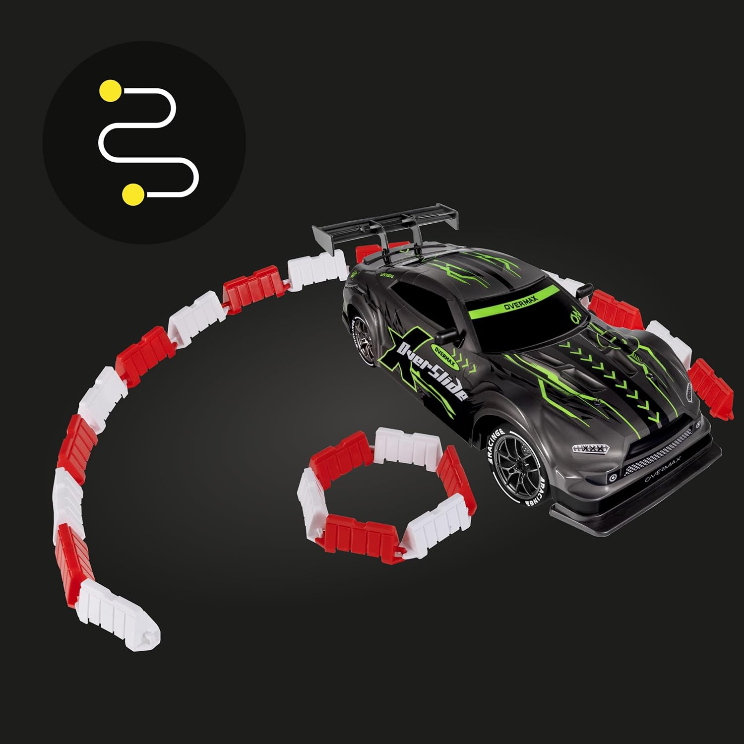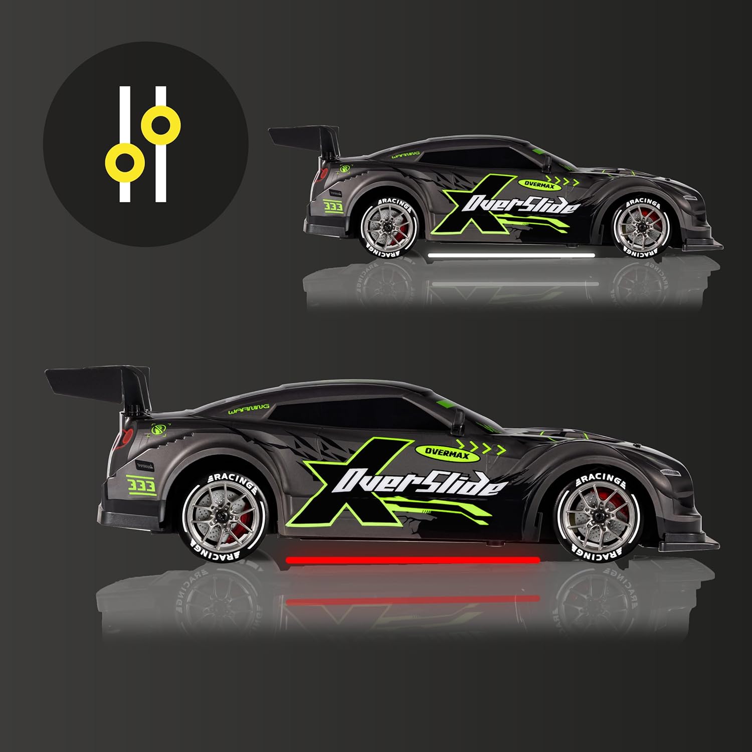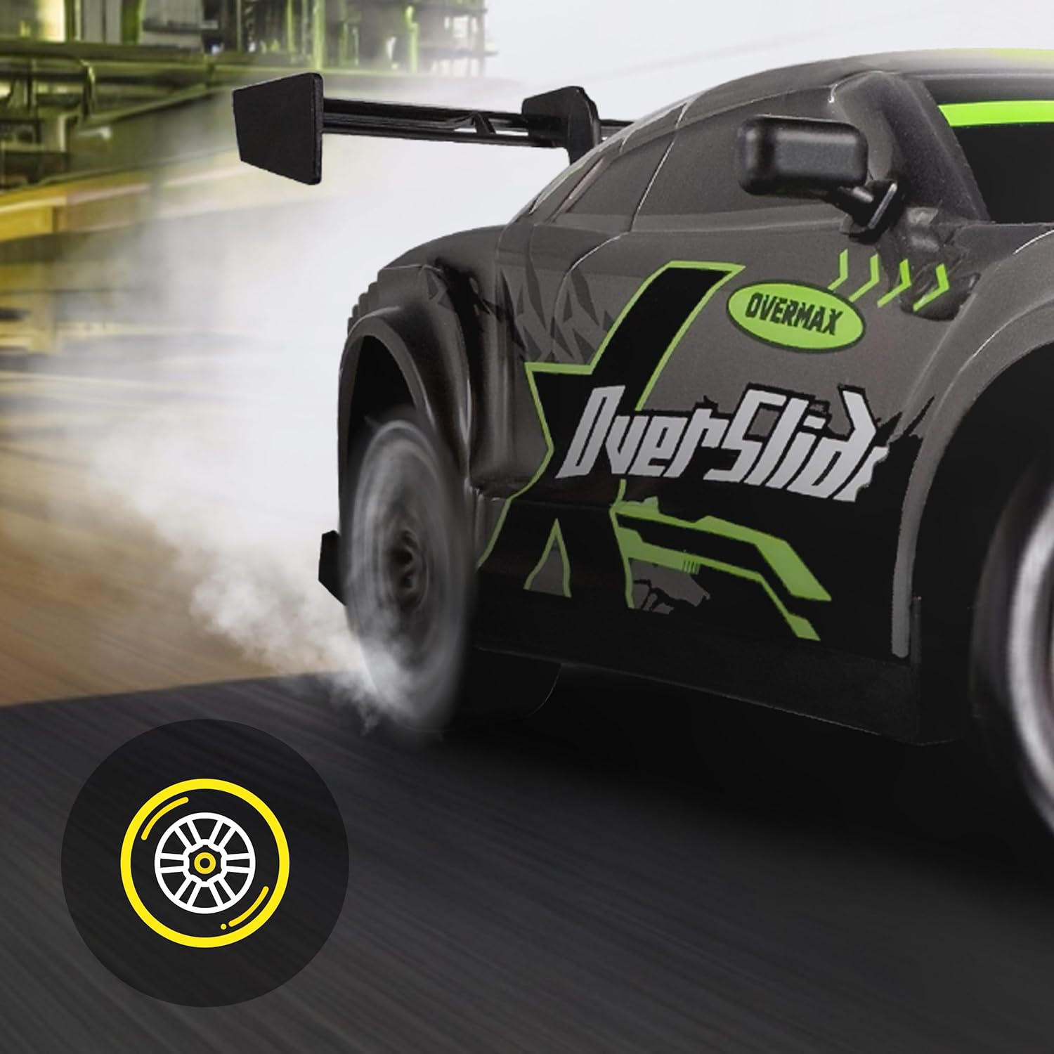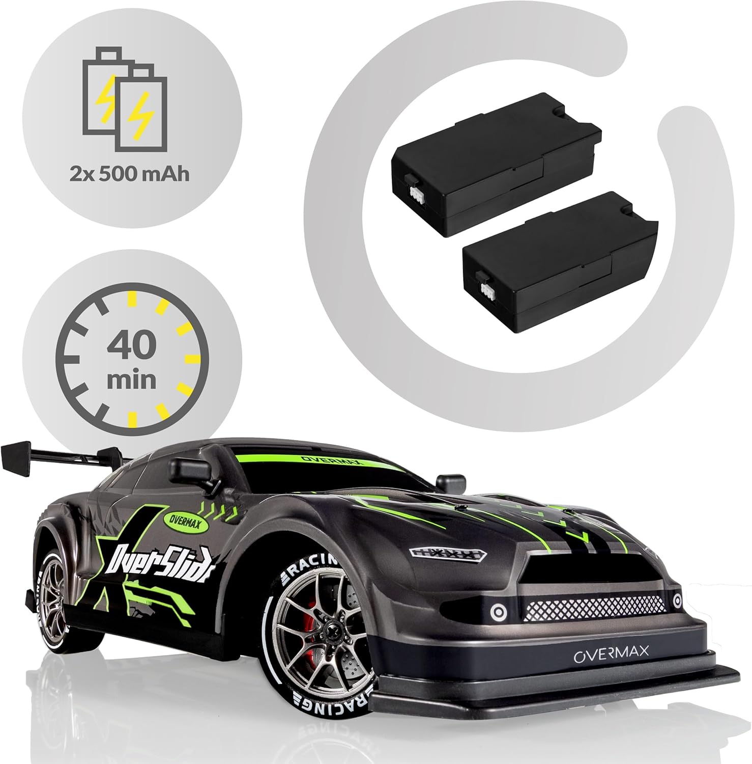 DIVERTIMENTO PIENO DI EMOZIONI: realizzata in scala 1:16, l'auto da corsa X-Overslide per drift sarà una fonte di divertimento sia per i bambini che per gli adulti. Il modello è dotato di 2 set completi di ruote: le ruote in plastica liscia consentono slitte spettacolari, mentre le ruote in gomma con battistrada garantiscono una migliore aderenza sui tratti dritti. VELOCITÀ E PRESTAZIONI: l'auto telecomandata per bambini RC accelera fino a 20 km/h con una portata del controller di 80 m. 2 modalità di guida consentono di adattare le prestazioni alle capacità dell'utente. Il set include due batterie con capacità di 500 mAh. Il tempo di funzionamento dopo la ricarica completa di una pila consente la guida ad alte prestazioni dopo 20 min (in totale 40 min). TRAZIONE 4x4: una partenza rapida dell'auto da drift RC è possibile grazie all'affidabile trazione integrale, che garantisce una migliore aderenza su diverse superfici. L'auto radiocomandata è dotata di un comodo controller intuitivo. Il canale di comunicazione criptato consente a più veicoli di giocare contemporaneamente senza interferenze di segnale. EFFETTI LUMINOSI LED: l'illuminazione del sottoscocca non solo migliora l'aspetto dinamico del veicolo RC, ma indica anche la modalità di velocità attivata. Inoltre, l'auto è dotata luci anteriori e posteriori a LED che aggiungono ancora più fascino e divertimento all'esperienza di gara. KIT DI OSTACOLI + SCOCCA AGGIUNTIVA: sono inclusi anche gli ostacoli, in modo da poter creare le proprie sfide ed esercitarsi nelle manovre. La scocca aggiuntiva consente di modificare l'aspetto del veicolo in base alle proprie preferenze.