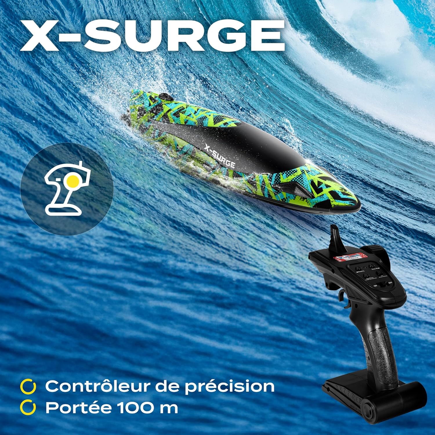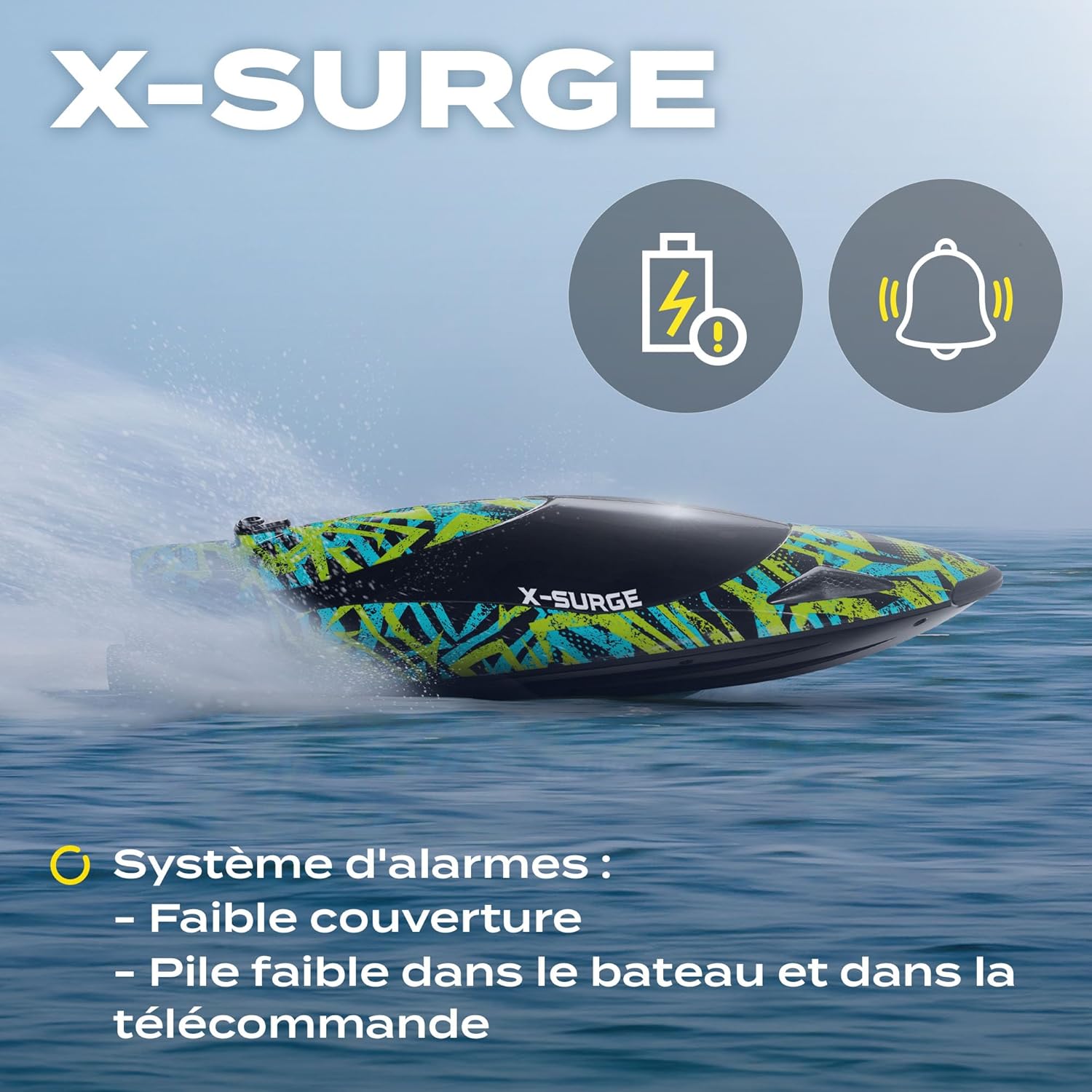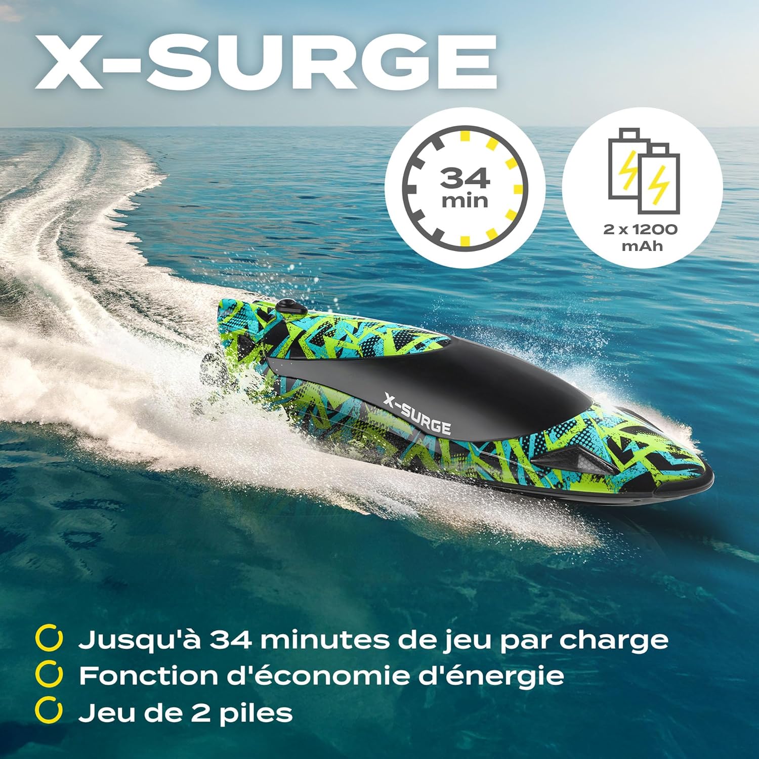 | Type de Batterie(s) / Pile(s) | Deux batteries Li-Ion 7,4 V 2000 mAh incluses pour le bateau. Télécommande alimentée par 3 piles AA 1,5 V (non incluses). |
