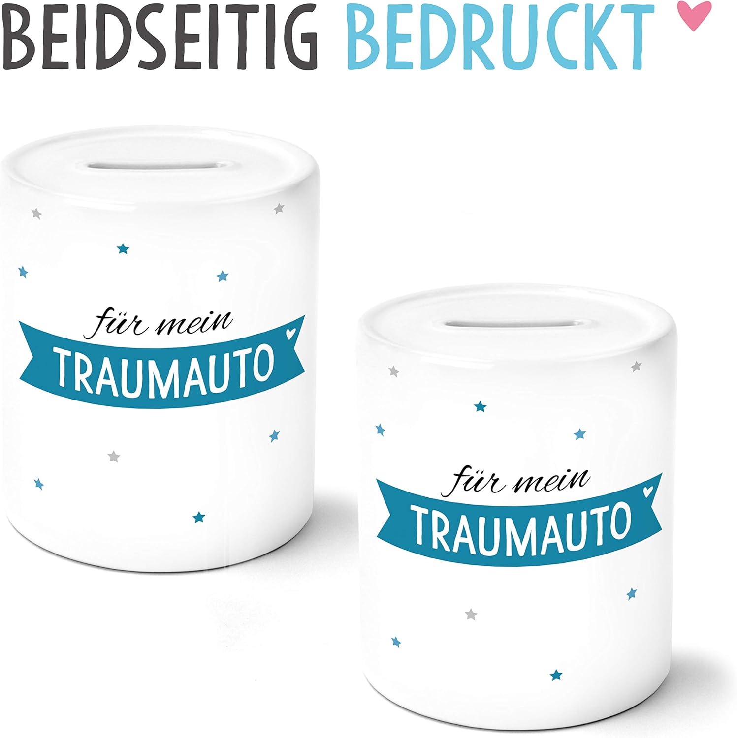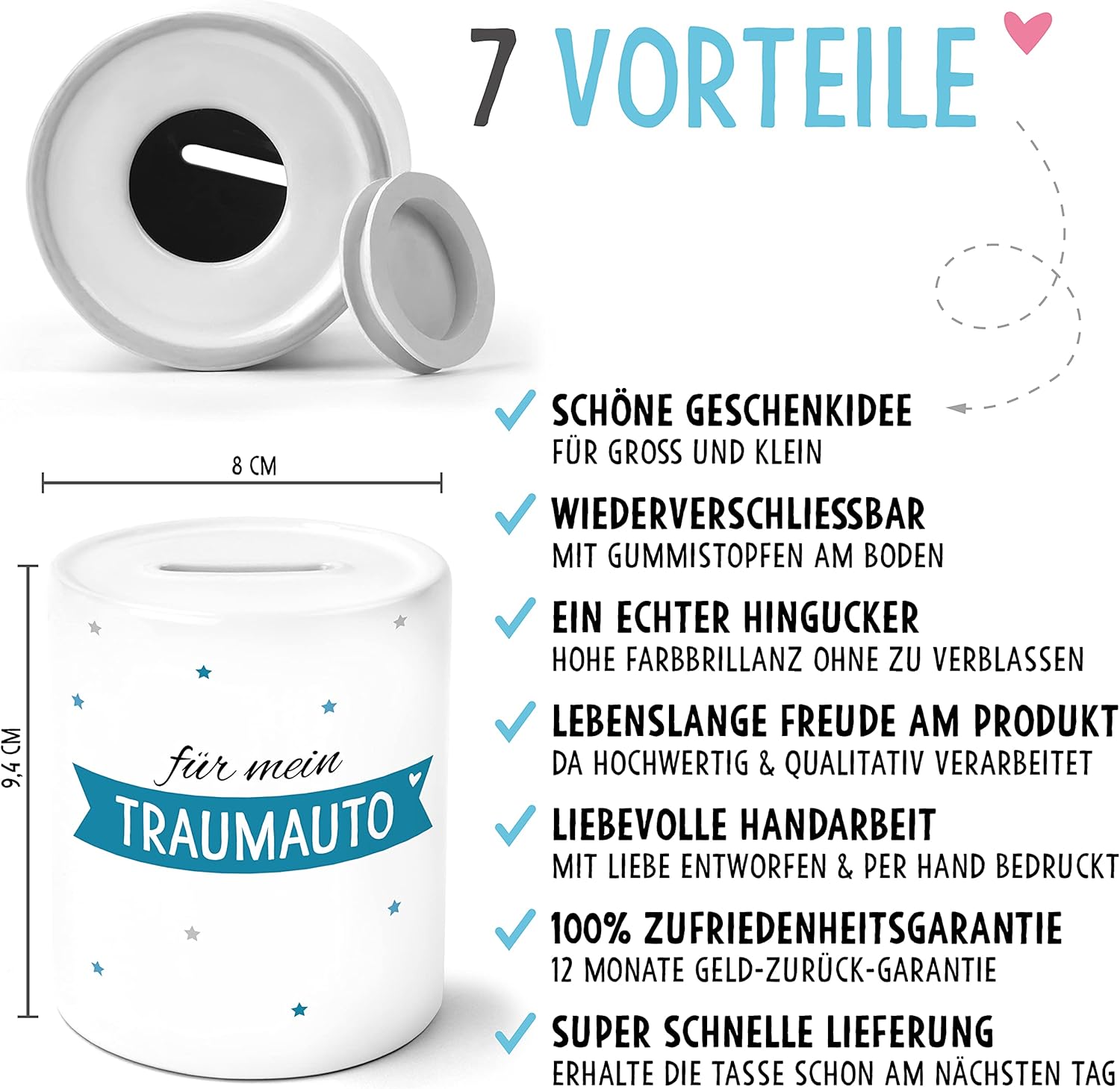 PERSONALIZZAZIONE FACOLTATIVA: puoi personalizzare facoltativamente il prodotto, in modo da ricevere un regalo individuale. Per fare ciò, seleziona la versione personalizzabile, clicca su PERSONALIZZA ORA e inserisci il nome o il testo desiderato. ELEVATA BRILLANTEZZA DEI COLORI: Il salvadanaio dal design amorevole che misura 8,2 x 8,2 x 9,5 cm colpisce per l'elevata brillantezza dei colori e la resistenza grazie alla stampa a trasferimento termico. Il salvadanaio con scritta è imballato in modo sicuro e consegnato in una graziosa confezione regalo. ALTA QUALITÀ: Il salvadanaio individuale in ceramica con chiusura in gomma è molto facile da pulire, resistente ai graffi e di altissima qualità grazie allo speciale rivestimento, quindi possiamo garantire una vita di divertimento. BELLISSIMA IDEA REGALO: il prodotto dal design amorevole è una bella idea regalo per Natale, compleanno o Pasqua. Sorprendi tuo figlio, figlia, figlioccio o nipote con un regalo carino che viene dal cuore. SODDISFAZIONE AL 100%: Il prodotto è realizzato a mano con amore nella nostra fabbrica in Germania. La qualità dei nostri prodotti è molto importante per noi. Se sei ancora insoddisfatto, riceverai indietro i tuoi soldi!