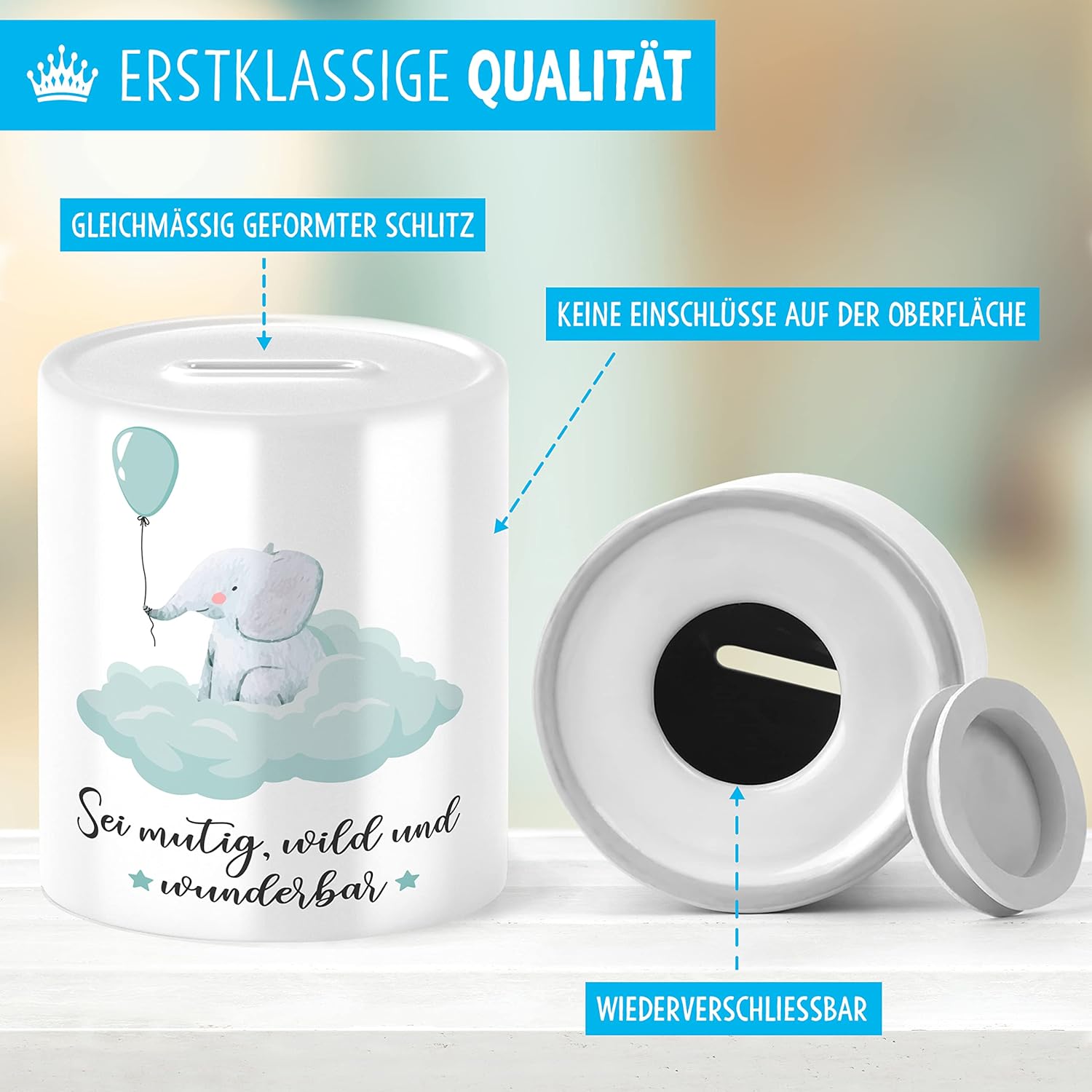 PERSONALIZZAZIONE FACOLTATIVA: puoi personalizzare facoltativamente il prodotto, in modo da ricevere un regalo individuale. Per fare ciò, seleziona la versione personalizzabile, clicca su PERSONALIZZA ORA e inserisci il nome o il testo desiderato. ELEVATA BRILLANTEZZA DEI COLORI: Il salvadanaio dal design amorevole che misura 8,2 x 8,2 x 9,5 cm colpisce per l'elevata brillantezza dei colori e la resistenza grazie alla stampa a trasferimento termico. Il salvadanaio con scritta è imballato in modo sicuro e consegnato in una graziosa confezione regalo. ALTA QUALITÀ: Il salvadanaio individuale in ceramica con chiusura in gomma è molto facile da pulire, resistente ai graffi e di altissima qualità grazie allo speciale rivestimento, quindi possiamo garantire una vita di divertimento. BELLISSIMA IDEA REGALO: il prodotto dal design amorevole è una bella idea regalo per Natale, compleanno o Pasqua. Sorprendi tuo figlio, figlia, figlioccio o nipote con un regalo carino che viene dal cuore. SODDISFAZIONE AL 100%: I nostri prodotti sono realizzati artigianalmente con amore nella nostra fabbrica in Germania. La qualità dei nostri prodotti è molto importante per noi. Se sei ancora insoddisfatto, riceverai indietro i tuoi soldi!