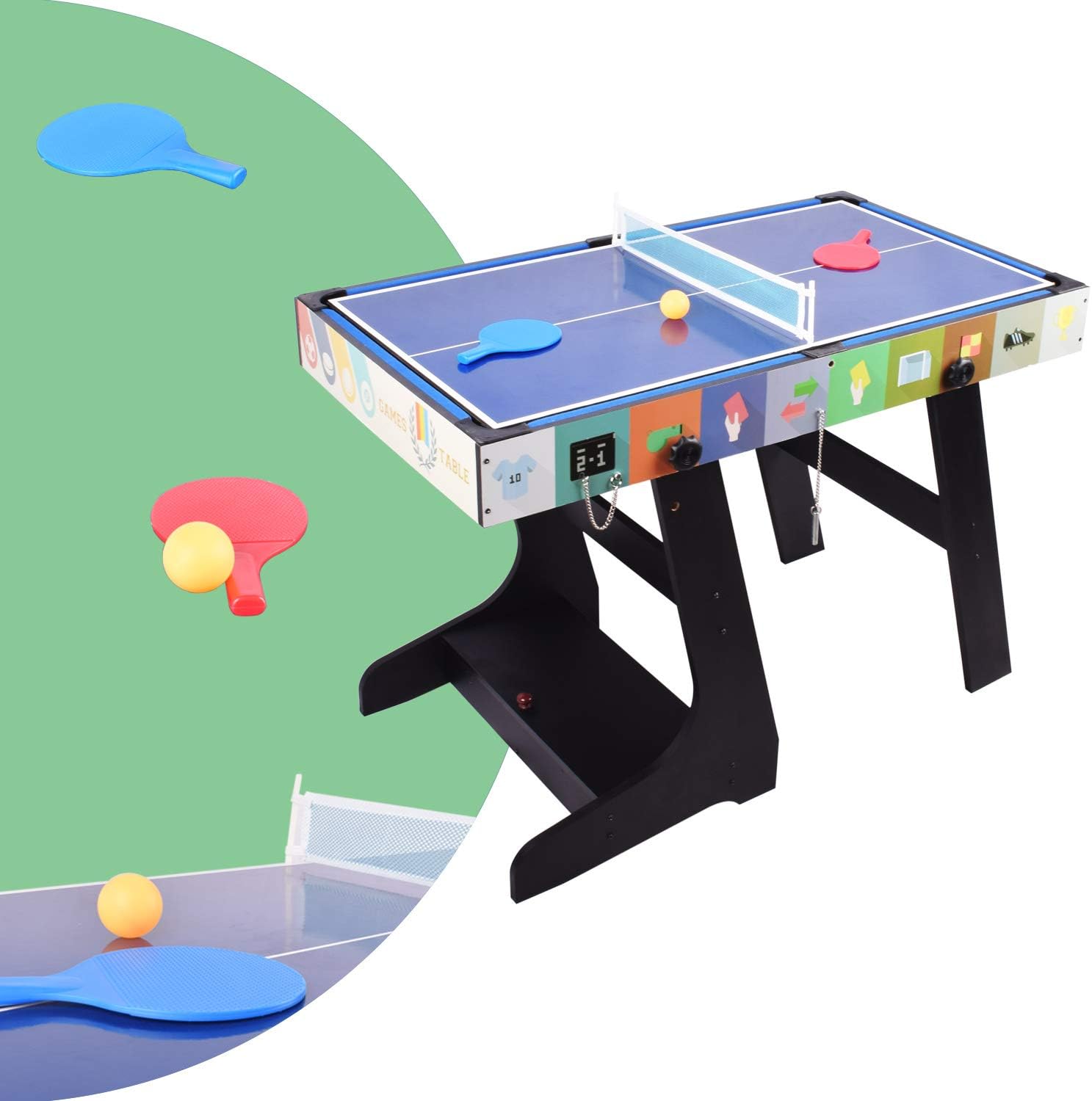 Tavolo da gioco 4 in 1, tavolo da calcio, hockey, biliardo, tavolo da ping pong in un robusto tavolo da gioco. Nota: il tavolo da hockey non è un hockey elettrico, ma solo uno scivolo. Design compatto e salvaspazio con gamba pieghevole per una facile conservazione, facile da usare, richiede un montaggio semplice e molto facile da spostare da un gioco all'altro. Il calcio da tavolo a 4 piedi si trova esattamente sul tavolo da biliardo. Il contenitore per accessori consente di riporre tutti gli accessori del tavolo, rendendo la stanza e il pavimento più ordinati. Facile da usare, facile da montare, il tavolo da gioco combinato è facile da usare e facile da assemblare con istruzioni, tutti gli accessori sono inclusi, in modo da poter passare facilmente da un gioco all'altro per ore di divertimento. Regalo perfetto per i bambini: un tavolo da gioco sportivo perfetto per i bambini con cui giocare. È anche divertente per gli adulti giocare con il loro bambino, è la scelta migliore per regali di Natale e compleanno. La dimensione del tavolo da gioco multifunzionale è: 124 x 61 x 82 (L x P x A), peso: 23 kg; realizzato in fibra di media densità per dare maggiore stabilità al tavolo multi-gioco, adatto per l'uso domestico.