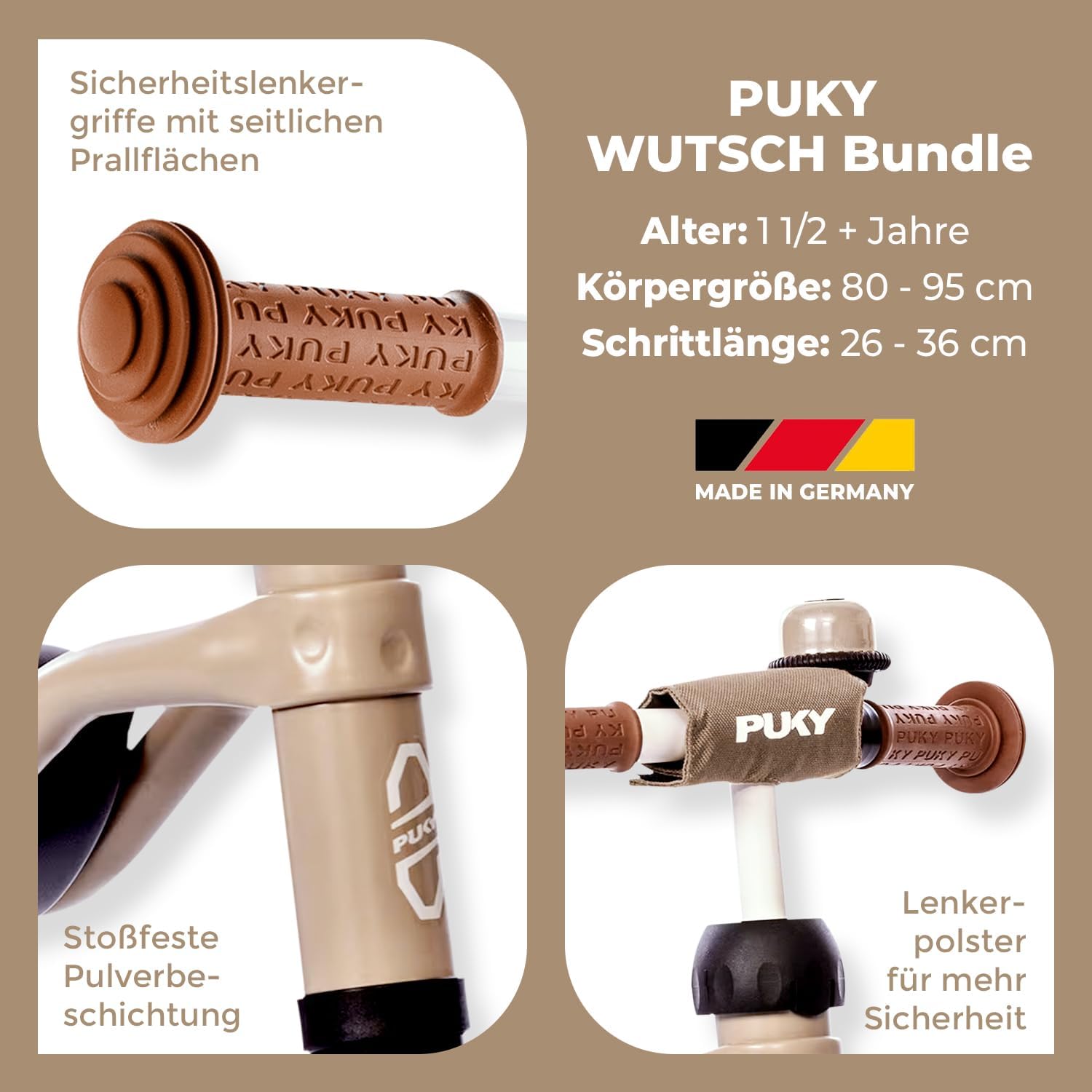 SCORREVOLE: Rendi più facile per i bambini iniziare. Il pacchetto PUKY Wutsch favorisce il senso di equilibrio e favorisce l'avvio alla mobilità attraverso semplici movimenti. Perfetto per la tua prima uscita all'aria aperta. Ora con una borsa con design di procione o coniglio. ERGONOMIA: affidatevi alle idee intelligenti di PUKY. Il sedile ergonomico supporta i movimenti di corsa del bambino e fornisce un supporto sicuro. Per i più grandi: una rientranza per le ginocchia sul sedile consente di pedalare sulla parte inferiore delle gambe. SICURO: lasciati accompagnare da una bella sensazione. Le speciali impugnature di sicurezza del manubrio con ampie superfici d'impatto proteggono da lesioni in caso di caduta e impediscono lo scivolamento laterale. L'imbottitura del manubrio offre una protezione aggiuntiva. STABIL: Non preoccuparti, abbiamo pensato a tutto. La limitazione dell'angolo di sterzata garantisce stabilità. Ciò aumenta la sicurezza durante i primi tentativi di guida ed evita velocità più elevate. L'asse pendolare favorisce ulteriore stabilità. RILASSATO: goditi la pace e la tranquillità e promuovi il piacere di guida. Le ruote in plastica con rivestimento in gomma float rendono il veicolo estremamente silenzioso. Il PUKY Wutsch Bundle può essere utilizzato anche all'interno - e allo stesso tempo offre la migliore presa.
