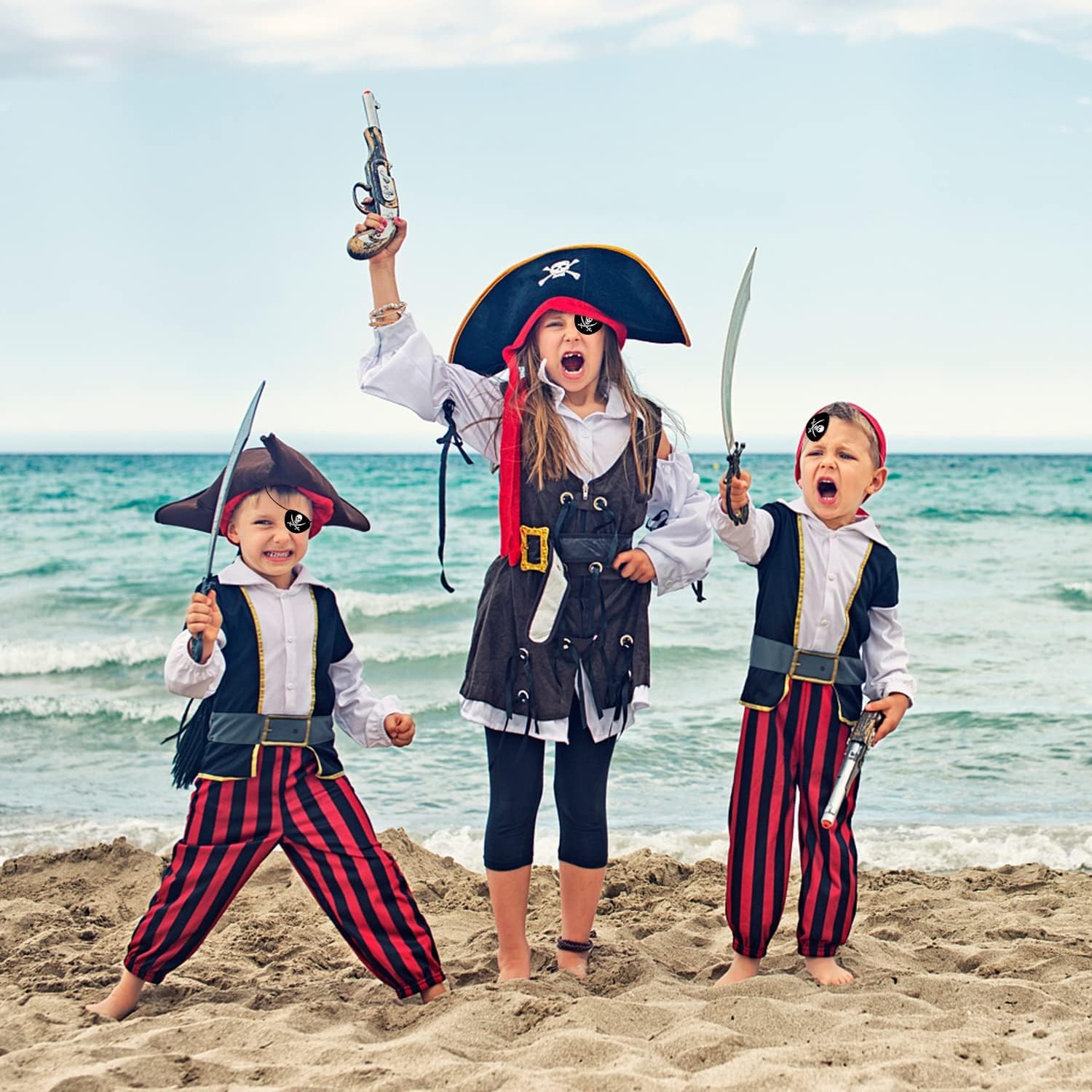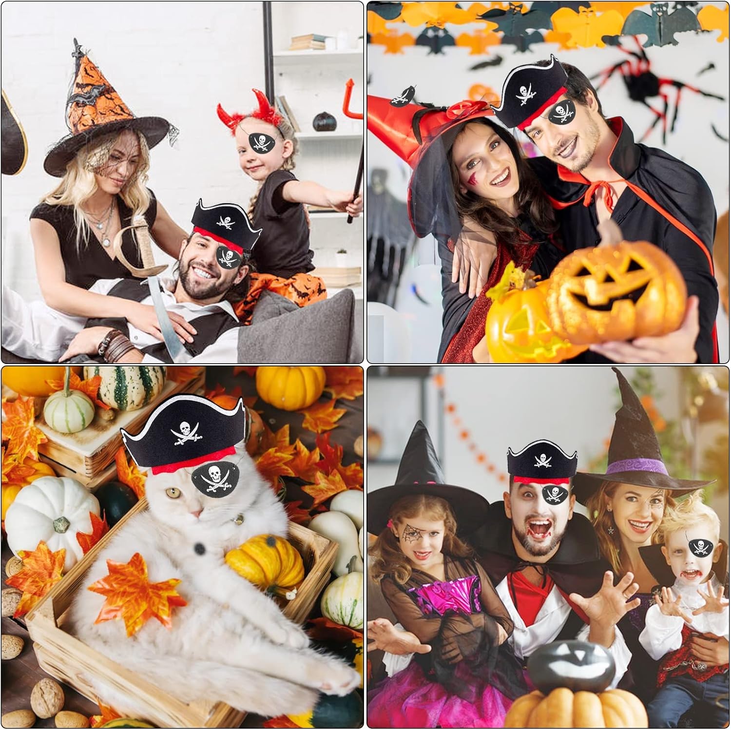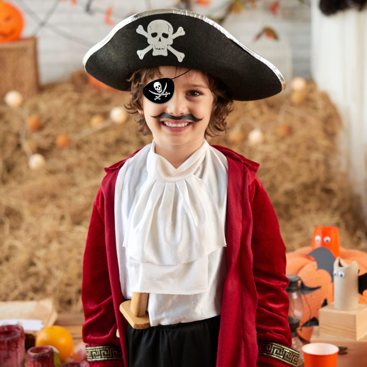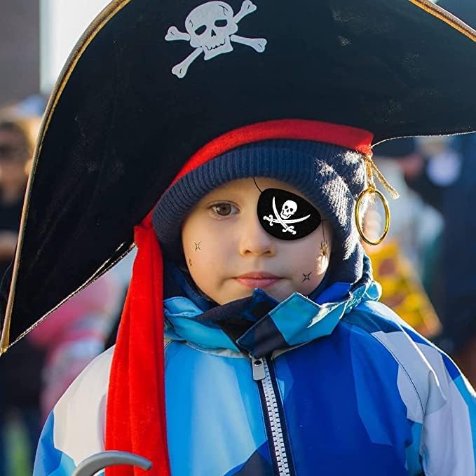 Materiale: realizzato in feltro di alta qualità, non trafigge la pelle quando lo si indossa, comodo da indossare Dimensioni della benda sull'occhio: 8 x 6 cm/ 3,15 x 2,36 pollici Regolabile: viene fornito con cinturino elastico e regolabile, adatto per adulti e bambini Caratteristiche: le bende nere per gli occhi sono stampate con motivo a teschio bianco e coltelli incrociati Ampia applicazione: le bende nere per gli occhi da pirata sono buoni accessori per giochi di ruolo che ti rendono eccezionale ad Halloween, Natale e feste a tema pirata