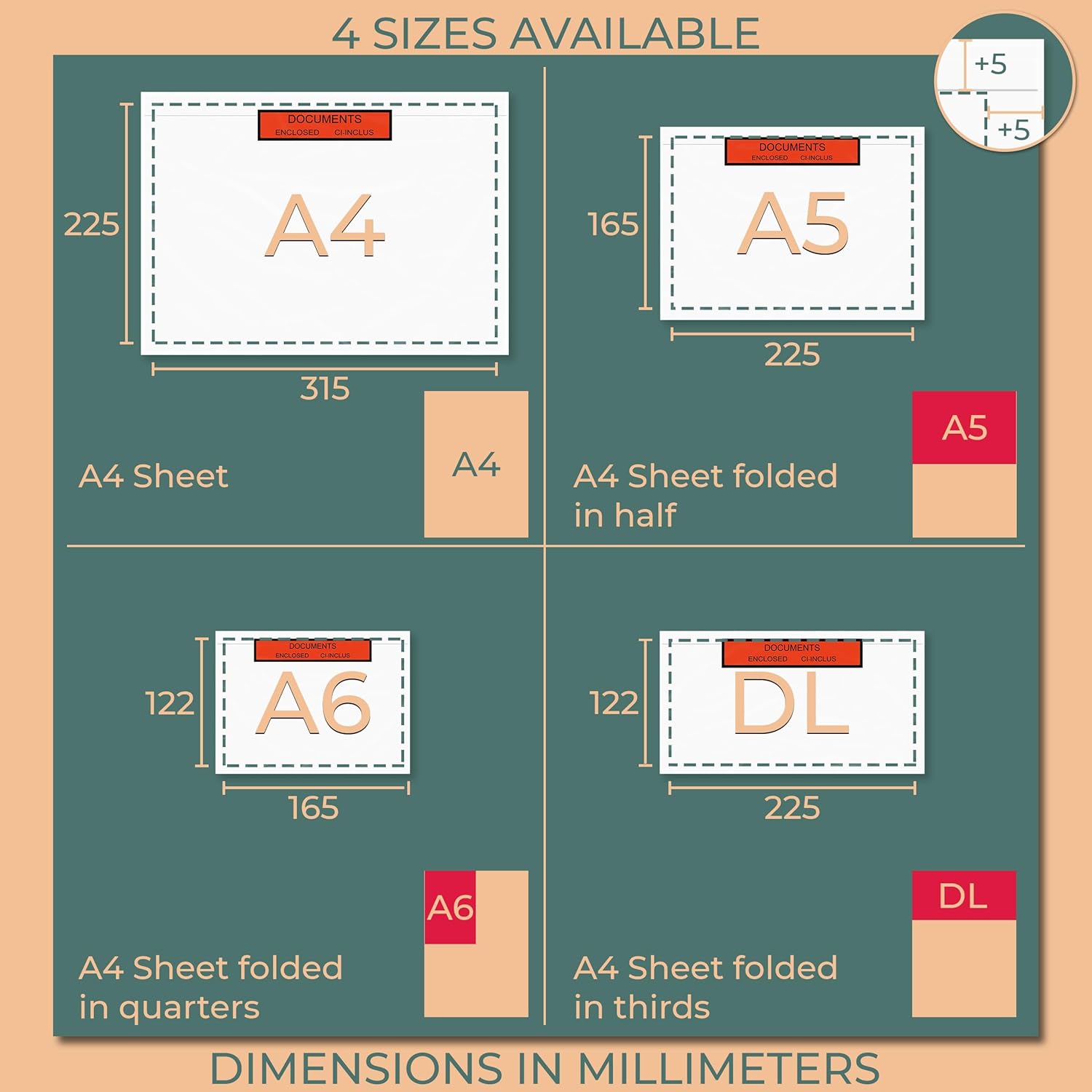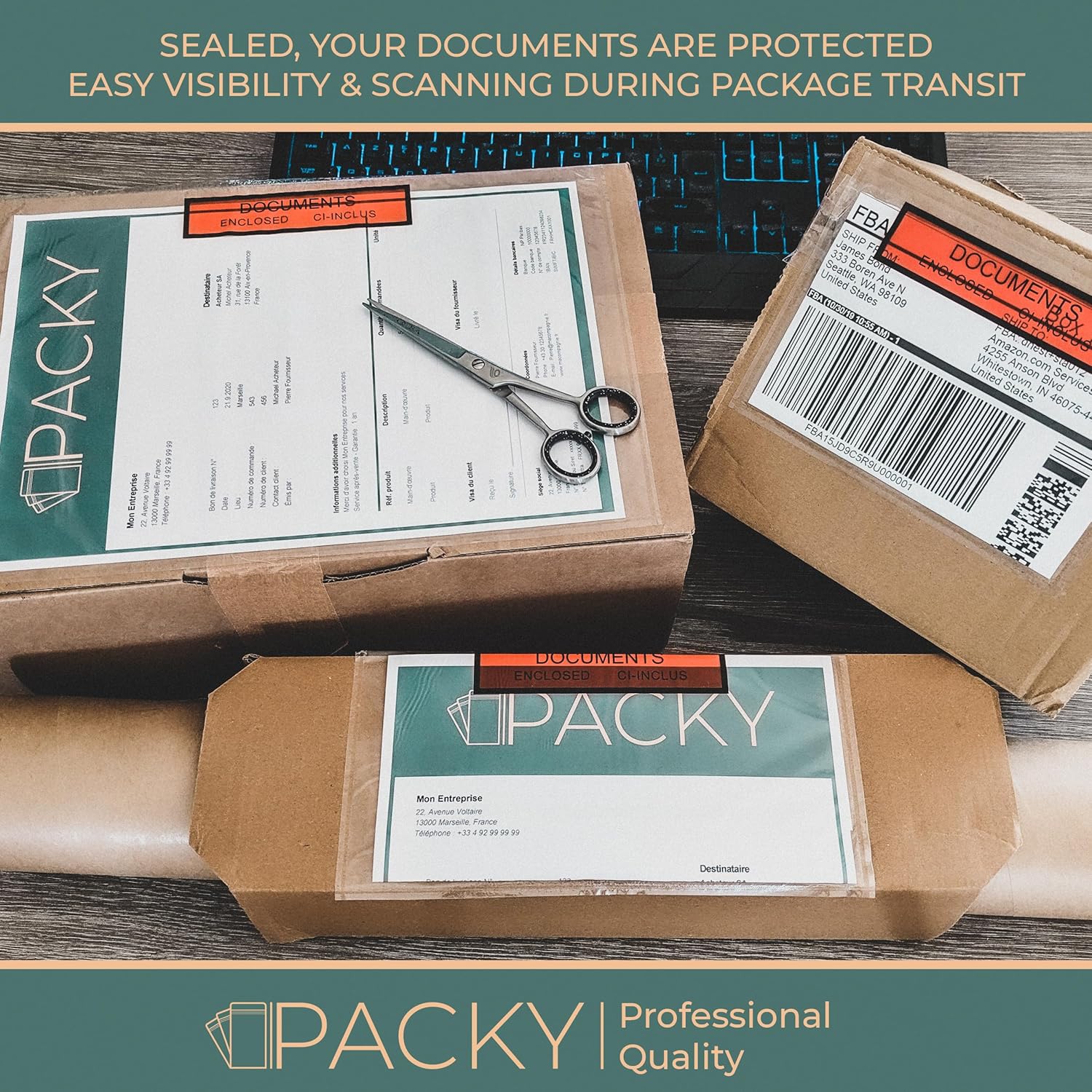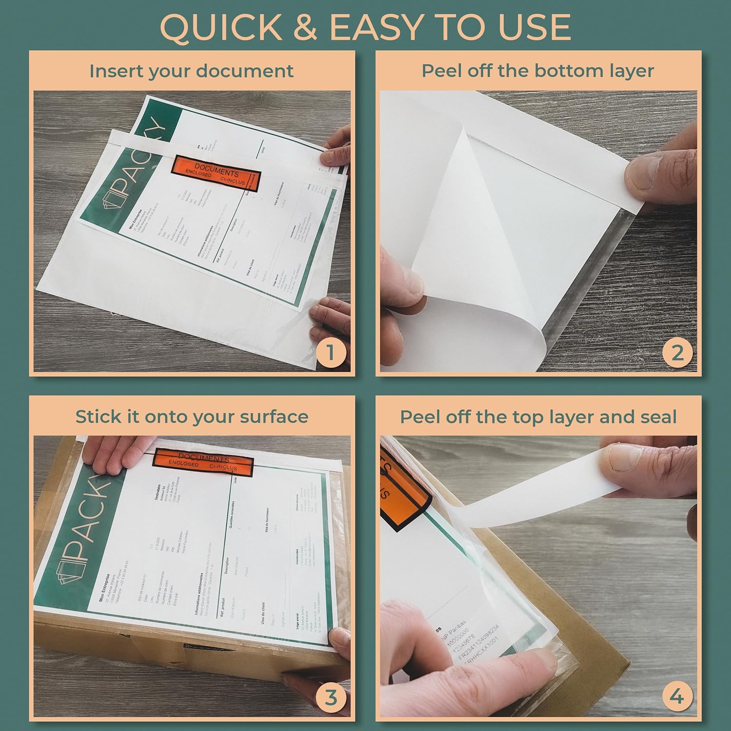 💼 Caratteristiche - Le nostre tasche portadocumenti autoadesive per bolle di consegna, fatture, polizze di carico, etichette di spedizione, documenti... sono realizzate in polipropilene trasparente con un adesivo holt melt resistente. Documenti allegati Ci-Inclus su sfondo rosso. ◻Trasparenti - Le nostre buste portadocumenti sono completamente trasparenti per consentire una rapida visione del contenuto e per permettere al corriere di scansionare i documenti di spedizione in modo semplice e veloce o ai funzionari doganali che effettuano consegne internazionali di non aprire i vostri pacchi e di avere un rapido accesso ai vostri documenti. ⛈️ Impermeabile - Completamente impermeabile, non c'è rischio che i documenti si deteriorino durante il trasporto. Sono molto più sicure delle etichette autoadesive o della carta incollata sull'imballaggio, che possono deteriorarsi o staccarsi, aumentando il rischio che la merce non venga consegnata. Resistente alle intemperie. 💪 Adesivi - L'adesivo ultraresistente consente di posizionare i documenti su tutti i tipi di supporti, come buste per spedizioni, scatole di cartone, film estensibile per pallet, casse di legno... Non è più necessario il nastro adesivo per fissare i documenti e non c'è più il rischio che si stacchino dal loro supporto. 🟥 Documenti allegati - Identificate rapidamente e facilmente i vostri documenti con uno sfondo rosso. Attira rapidamente l'attenzione dei clienti e dei trasportatori, evitando che debbano cercare i documenti in fondo ai pacchi o che debbano scansionare rapidamente il codice flash o il codice EAN dei documenti di spedizione.