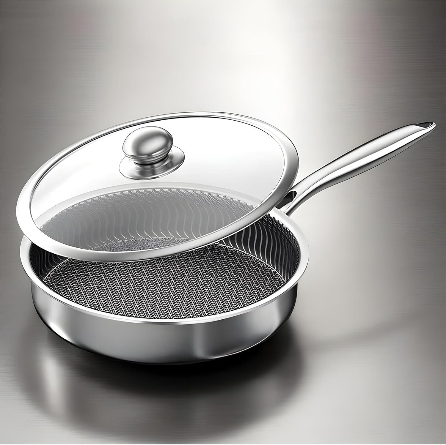 Base Duratura: Progetto anti-graffio e anti-deformazione con base in acciaio inossidabile solido garantisce lunga vita all'utensile, resistendo all'usura quotidiana e mantenendo funzionalità affidabile nel per preparazioni ripetute Pulizia Rapida: Design interno continuo garantisce manutenzione facile tramite risciacquo con acqua e strofinatura con panno morbido, rendendo questa padella antiaderente ideale per pulizie veloci. Tecnologia Antiaderente Indelebile: Rivestimento lucidato garantisce cottura sicura per cibi senza sostanze nocive. Design anti-scrostamento e senza rilascio per prestazioni costanti Ambiente Cottura Migliore: La padella antiaderente favorisce una cottura con riduzione di fumi e aria più pulita in cucina con meno schizzi d'olio, mentre il suo coperchio che trattiene il vapore massimizza l'efficienza di cottura Controllo Calore Eccellente: Superficie curva e base innovativa riducono i punti caldi, assicurando cotture uniformi grazie a distribuzione del calore ottimizzata