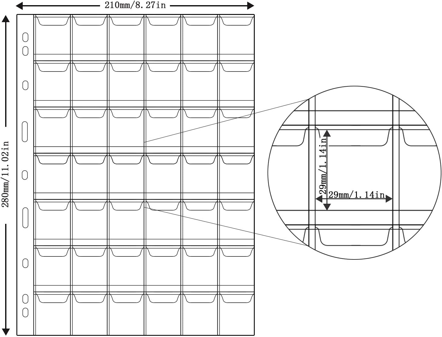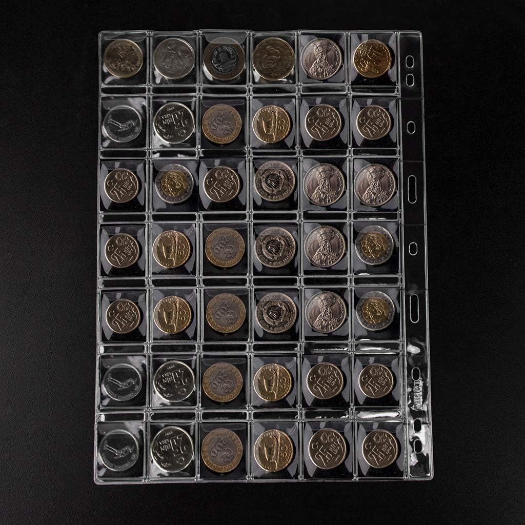 MATERIALE SICURO - Realizzato in PVC privo di acidi, antipolvere e non tossico, qualità durevole DESIGN UNICO - Ogni borsa è dotata di una copertura antiscivolo per proteggere e alleviare efficacemente l'ossidazione delle monete DIMENSIONE DEL PRODOTTO - Dimensioni complessive: 28 cm x 21 cm / 10,02 x 8,27 . Formato tascabile - 210 tasche (29 mm x 29 mm per tasca) AMPIE APPLICAZIONI - Adatto per la maggior parte delle dimensioni di monete, gettoni, medaglioni, distintivi, ecc. CONTENUTO DELLA CONFEZIONE - 5 fogli di portamonete