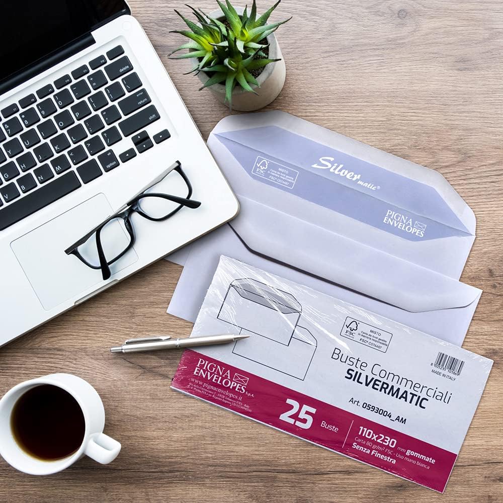 Confezione da 25 buste Buste commerciali formato 110x230 taglio da imbustamento automatico Carta naturale uso mano bianca FSC da 80 grammi Chiusura Patella Gommata Senza Finestra