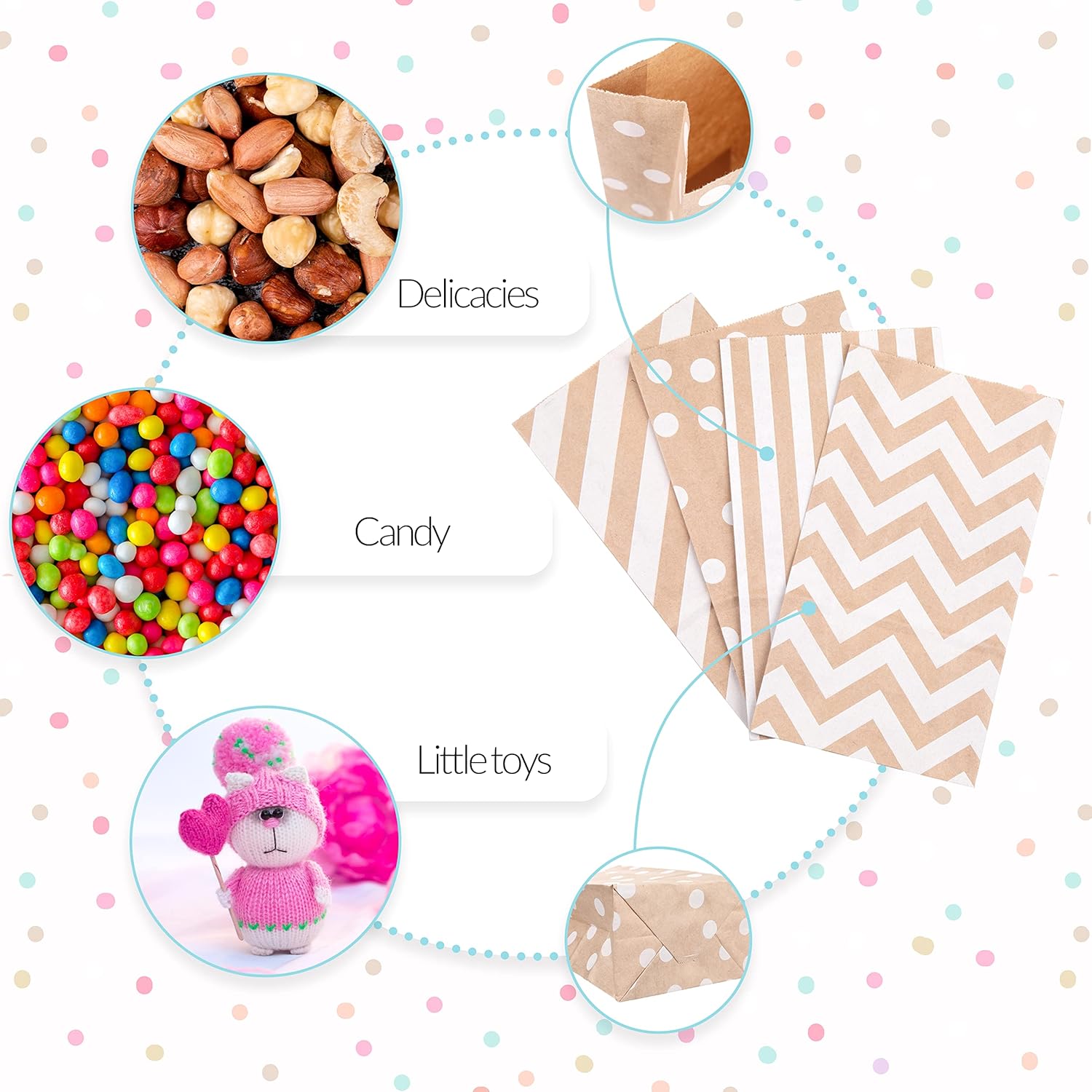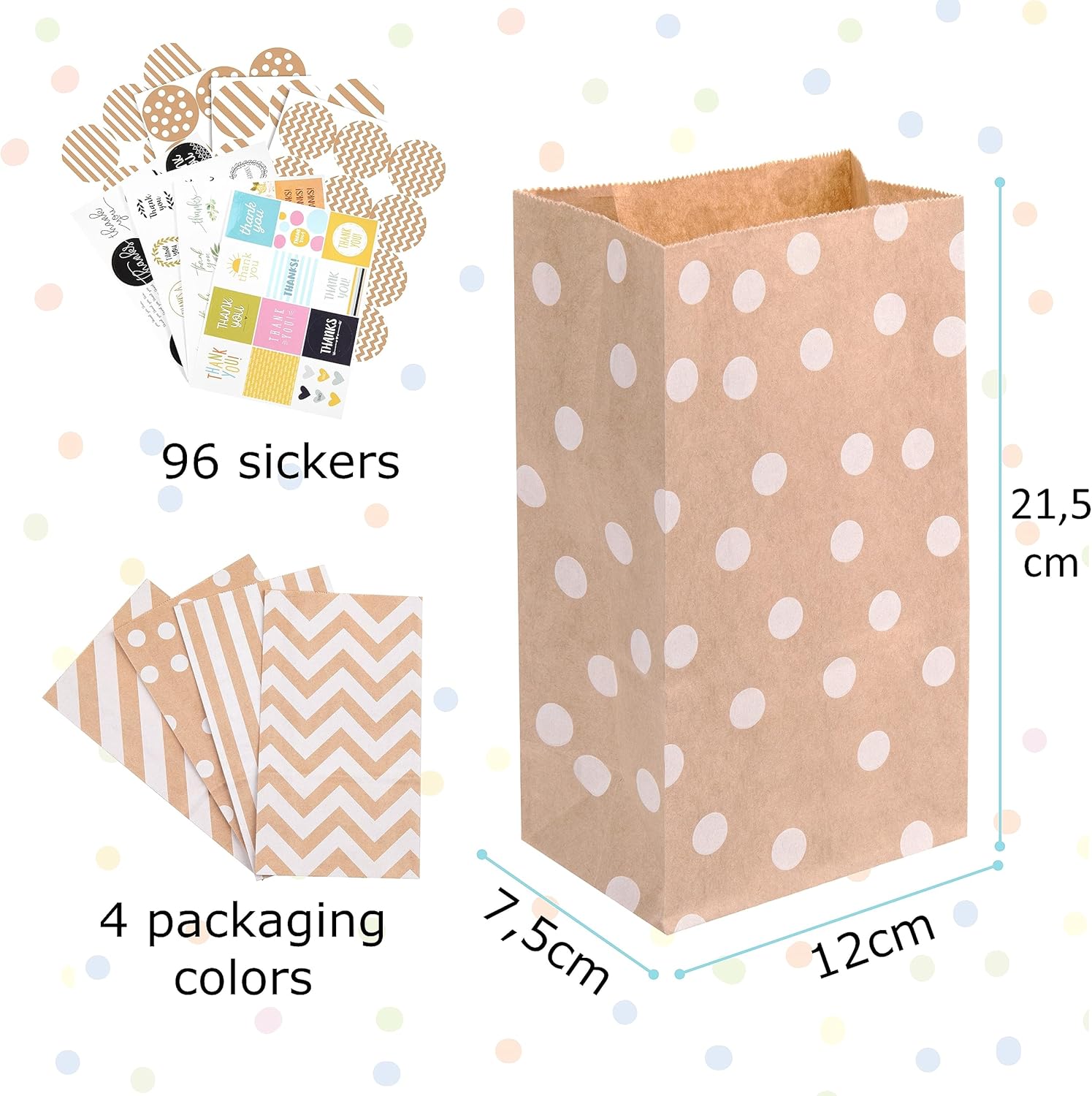 💖Il set contiene un totale di 40 sacchetti di carta marrone. Questi sacchetti regalo di carta misurano 12 cm x 21 cm x 7,5 cm ciascuno, 4 modelli diversi, 10 pezzi per modello 💜Un set di sacchetti di carta contiene 96 adesivi in diversi modelli nel colore dei sacchetti, con un diametro di 3,5 cm, che si abbinano perfettamente ai sacchetti. Sono adatti per chiudere sacchetti di carta o incollarli come decorazione. 💚Materiale di alta qualità: il sacchetto di carta è realizzato in buona carta kraft con una lunga durata, quindi il nostro prodotto è riutilizzabile, ecologico, inodore e sicuro per i tuoi usi. Per i nostri prodotti utilizziamo carta di colore chiaro, che non è solo esteticamente gradevole ma anche ecologica poiché può essere riutilizzata più volte. 💙Personalizzati e pratici: questi sacchetti di carta colorati hanno un fondo piatto in modo da poter essere posizionati in posizione verticale. Ideale per conservare torte, caramelle, biscotti e altri dolci. 🧡Multifunzionale: questi graziosi sacchetti regalo sono adatti per eventi come feste, compleanni, feste estive, matrimoni o piccoli negozi come caramelle. Puoi usare questi sacchetti per avvolgere dolci, regali o altri piccoli oggetti. Ha usi versatili e una vasta gamma di applicazioni